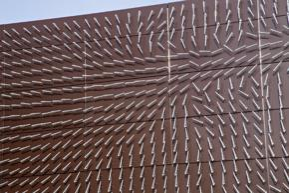 Lasciando a queste due strabilianti applicazioni di nuovi materiali al vetro e muoviamoci alla “pelle” degli edifici che si è sempre più evoluta, raggiungendo una funzionalità non solo estetica ma anche bioclimatica, ed in alcuni casi addirittura strutturale. Oggi non basta più un rivestimento per far sembrare più elegante il nostro edificio; abbiamo bisogno che questa pelle renda realmente innovativa e giustificata la sua applicazione. Un esempio estremamente affascinate di questa nuova concezione di pelle/facciata, è senz’altro data da “Windswept”, ovvero una facciata interattiva concepita per muoversi a seconda delle correnti d’aria, rivelando l’esatta direzione del vento e mettendo in scena le potenzialità artistiche della ventilazione naturale.