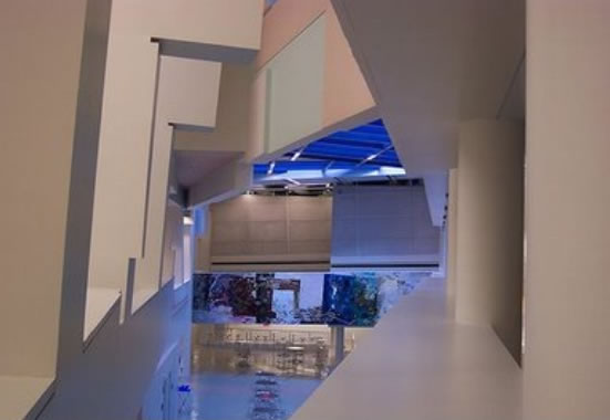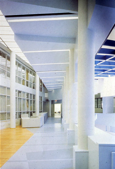 ...Ai cubi frammentati e costosi del Carnegie Center si sostituiscono cinque blocchi di laboratori semplici e funzionali che si attaccano su entrambi i lati di una spina centrale. La spina è l’occasione per creare nuove più complesse geometrie: per articolare a “V” o a “U” l’attacco dei corpi dei laboratori, per spezzarli in due parti, per indicare la regola della futura crescita dell’organismo, per articolare le necessarie eccezioni (auditorium e servizi specialistici). La dialettica tra elementi ripetibili e variazioni è l’inizio di una tecnica di riduzione pragmatica delle necessità concettuali al farsi realistico della costruzione. Avrà un seguito. p. 52
