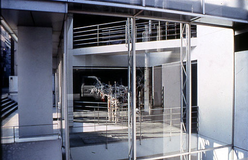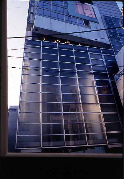 ...Nell’altro palazzo realizzato sempre a Tokyo (uffici Koizumi-Sangyo), Eisenman dimostra con evidenza che per raggiungere i suoi messaggi (Tokyo come sintesi di luogo e “non-luogo”), non bisogna necessariamente decostruire l’intera fabbrica (con gli immaginabili costi), ma si può agire cercando una tensione dialettica tra le parti: le une standard (in questo caso la scatola uniforme dei diversi piani) le altre eccezionali (il grande bow-window di tre piani ottenuto con una rotazione progressiva di pannelli e bucature su la forma a “L” di base). p. 76