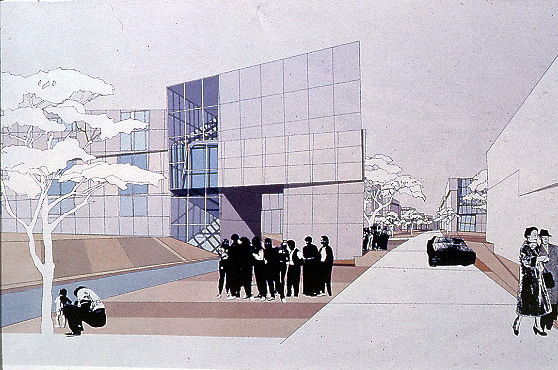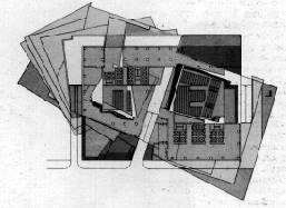 ...Il progetto, doveva rispondere a una doppia esigenza: riorganizzare gli spazi della facoltà esistente e poi edificare altre attrezzature (biblioteche, sale mostre, teatri studi uffici) che ne raddoppiasse quasi la superfici utile. La prima idea è relativamente semplice. Alla struttura dell’edificio esistente, che si muove funzionalisticamente a zig-zag sul terreno, viene aggiunta una struttura ad andamento ondulato che contiene le nuove attrezzature. Ma l’idea geniale scatta solo dopo il progetto di Guardiola e consiste nell’applicare la tecnica del Blurring simultaneamente al nuovo fabbricato e a quello preesistente. Entrambe le geometrie di base vengono duplicate e ruotate con la tecnica del cagnolino di Balla. Nasce un moto ondulatorio doppio: uno più geometrico (quello del vecchio edificio) l’altro più fluente determinato dalla curva in cui si organizzano le nuove funzioni. Apparentemente una pura follia, ma il risultato è di sconvolgente novità e di grande interesse perché queste due geometrie, giocando con incastri sottrazione e intersezioni reciproche dettano la conformazione dei nuovi spazi, dei volumi e delle stesse geometrie terrazzate o vegetali che si proiettano nel sito. Il progetto sembra un Yen sens [?], il simbolo orientale dell’amore, che fa vibrare e fremere le forme una sull’altra in un incessante moto ondulatorio. p. 60