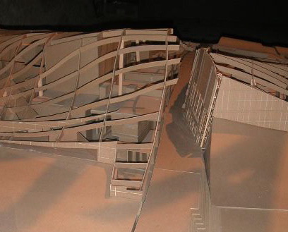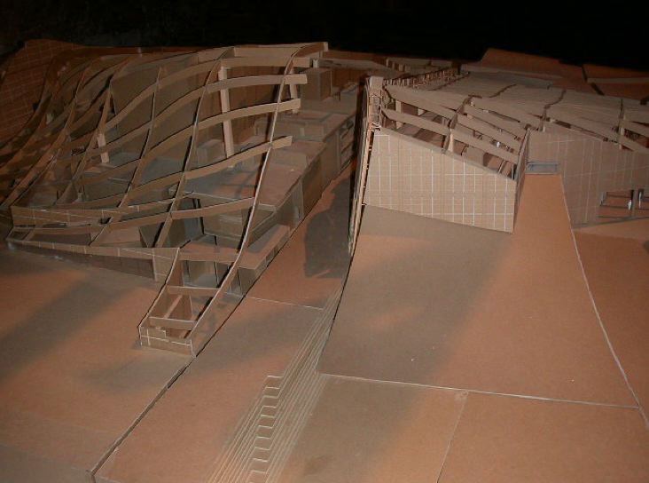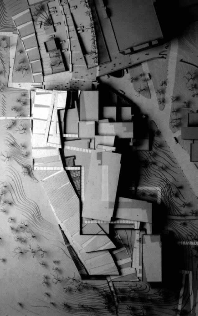 ...I tracciati usati per modellare il progetto con la tecnica del palinsesto derivano di nuovo dalle planimetrie storiche dell’area (il ranch che vi preesisteva, il campus insieme alle planimetrie della famosa faglia californiana e poi il fiume, la costa, il canale). Ma non è il collage o il palinsesto il solo motore dell’operazione perché le tracce entrano in relazione con l’organizzazione spaziale. Una cavea diagonale (allo stesso tempo percorso, elemento paesaggistico, giardino di sculture all’aperto e organizzazione degli eventi museali che vi si addossano) e un percorso sopraelevato a mezzaluna che la attraversa. Una doppia geometria, secca e ben risolta, che come nel Wexner, si addossa a un edificio preesistente. Cavea diagonale e mezza luna proiettano linee di forza anche negli altri angoli del sito legando insieme, il parco, gli edifici, il lago. Rimane uno dei più intriganti progetti di Eisenman. p. 44