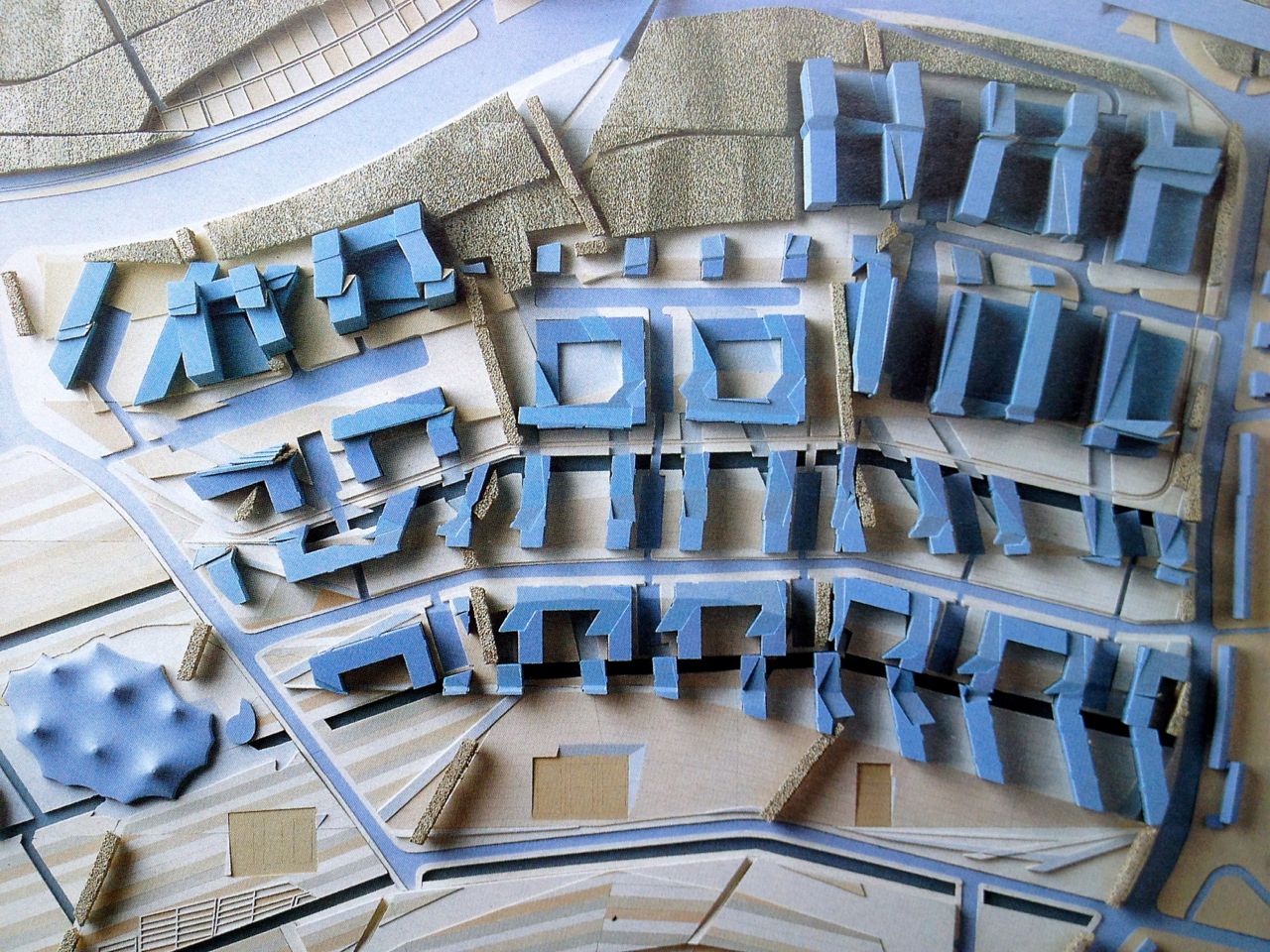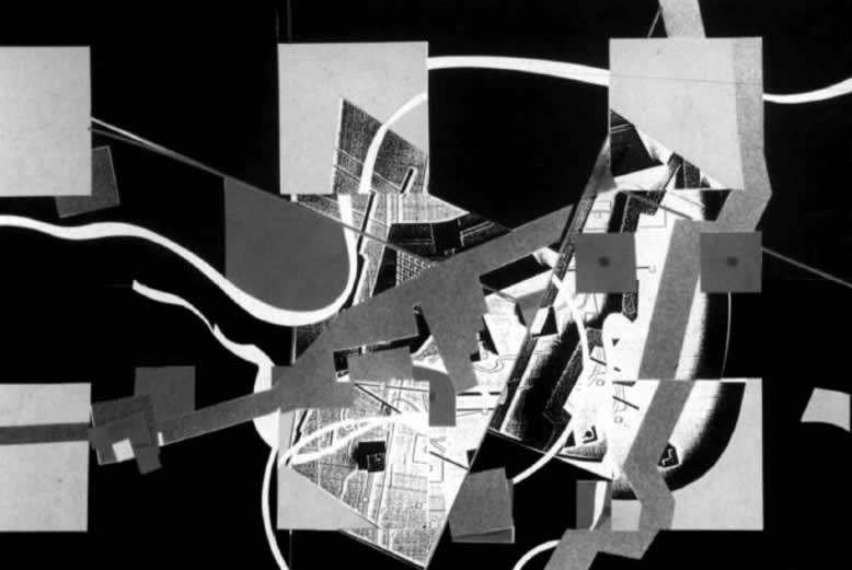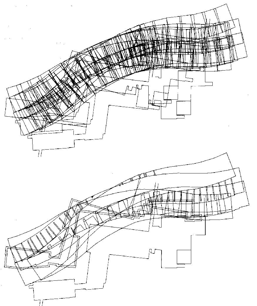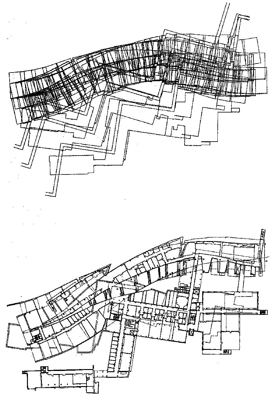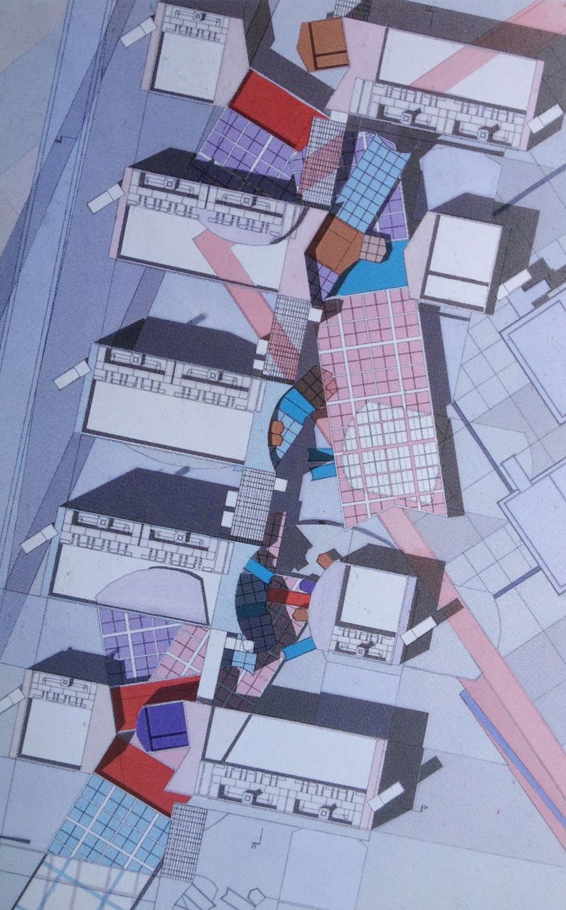 ...Eisenman usa a Rebstock park il concetto di tessuto e la griglia ordinatrice, ma li rafforza con la propria idea dei tracciati urbani e degli sterri. Per cui alle griglie ortogonali tradizionalmente adoperate nei sistemi insediativi bassi ad alta densità, egli sostituisce tre tracciati tra loro diversi: il primo a maglia larga derivato dal sistema del grande geografo Mercatore, un secondo a trama fitta di un’area limitrofa, un terzo mistilineo che segue i confini ondulati dell’area di progetto localizzata tra gli anelli viari del cosiddetto “terzo anello verde” di Francoforte. I tre sistemi entrano in tensione. I vertici del sistema mistilineo si congiungono a quelli ortogonali deformando, piegando le linee perpendicolari in una serie di spezzate: un campo deformato che fa pensare a come l’energia gravitazionale degli edifici plasmi lo spazio tempo. p. 80