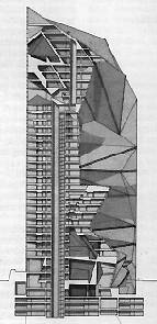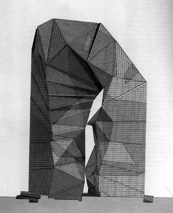 ...L’idea dello sterro che aveva fatta la sua comparsa sin dal progetto di Berlino e i frammenti minerali fuoriusciti da improvvisi movimenti sotterranei (riemerge in alcuni edifici alti come nei progetti della Max Reinhardt Haus a Berlino, un grande arco ma qui composto di segmenti poliedrici, e negli uffici Alteka in Giappone [pagina seguente]) . p. 32
