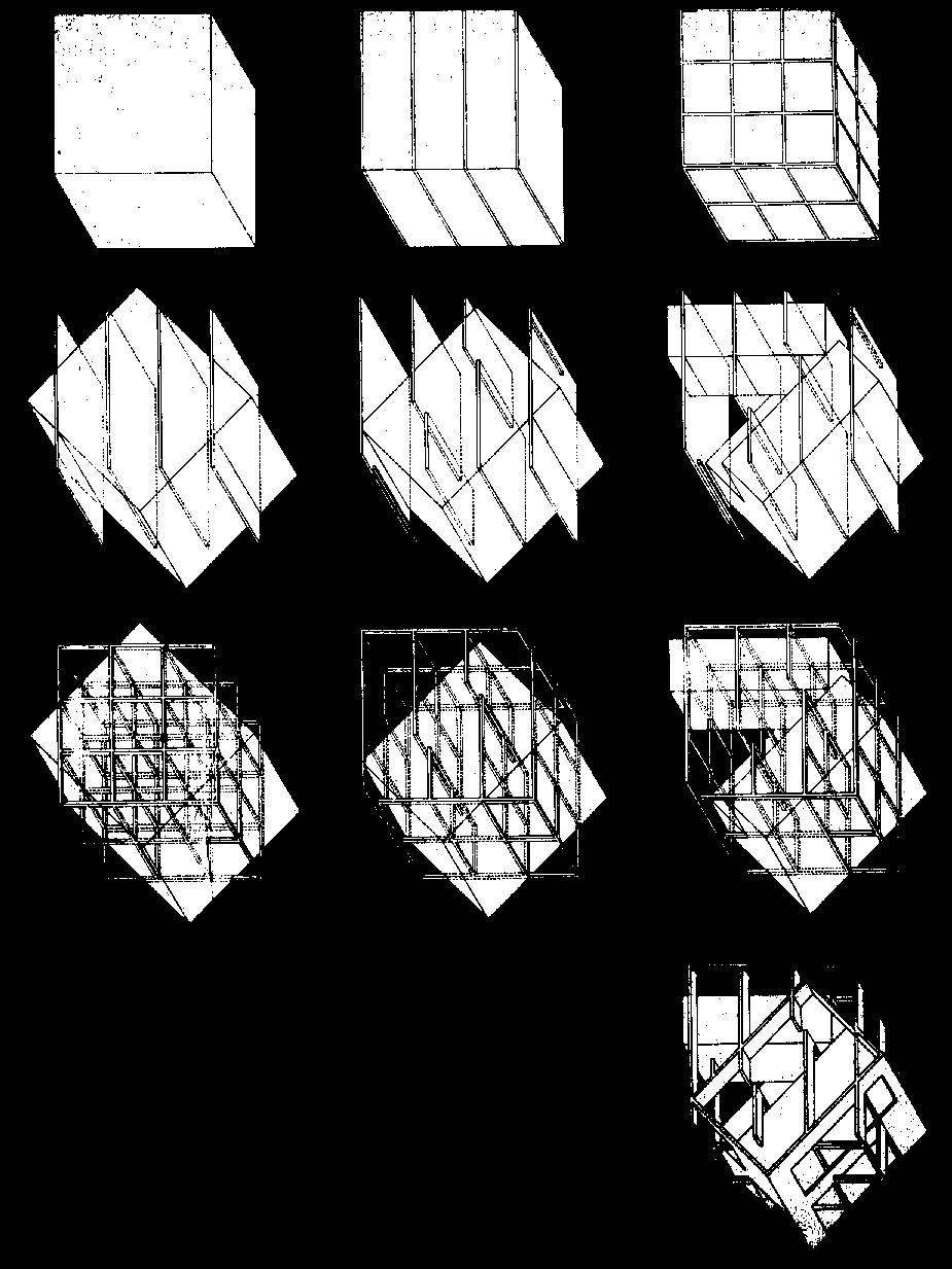 La soluzione che Eisenman dà al conflitto che aveva scoperto in Terragni ha una parola: Implosione. Una esplosione delle pareti, dei piani, dei volumi che però non invade l’esterno ma è rivolta verso il dentro, verso se stessa. Una violenta reazione chimica viene trattenuta ed esaminata dentro una provetta..." cit. ^^ p. 20