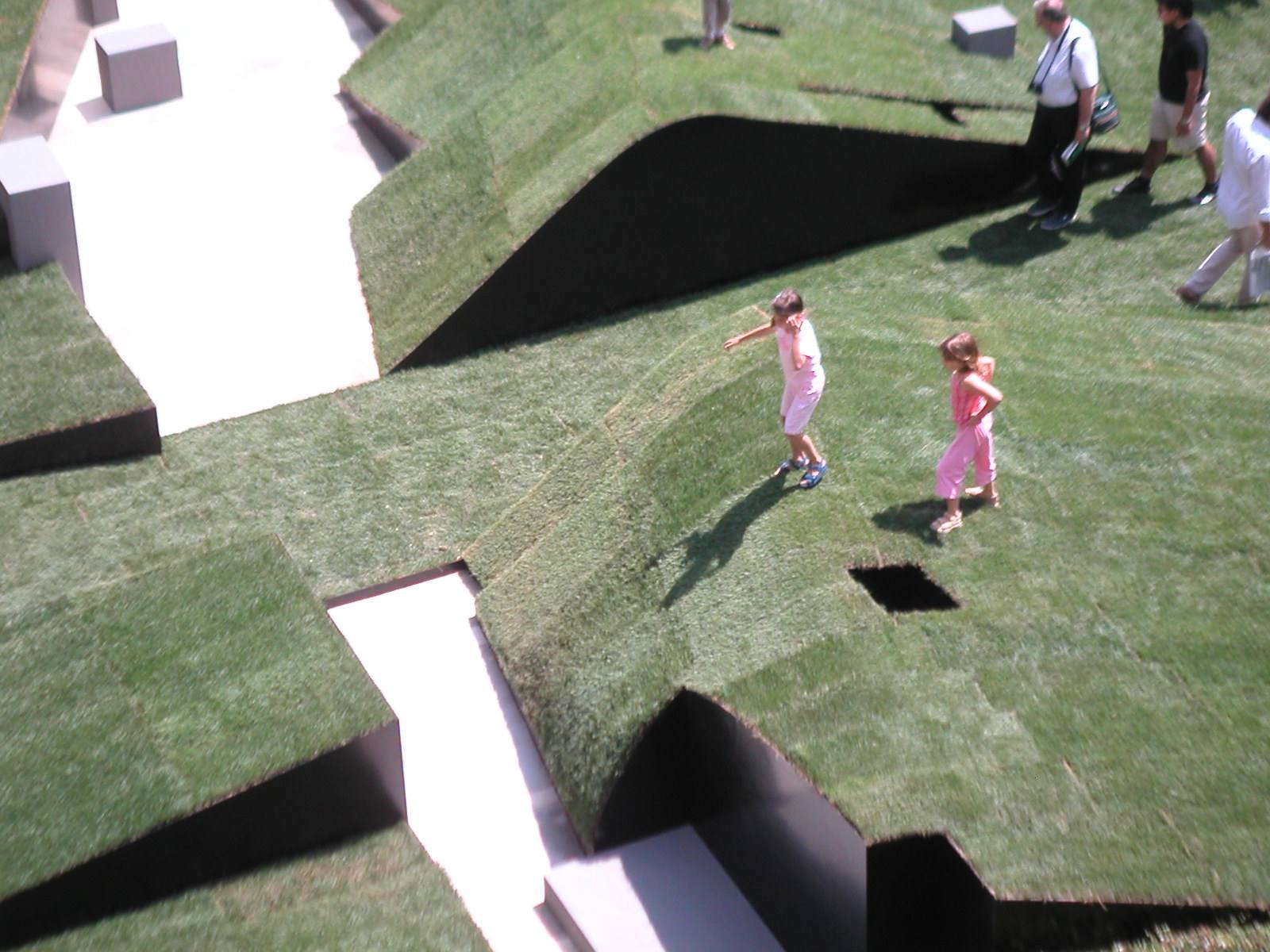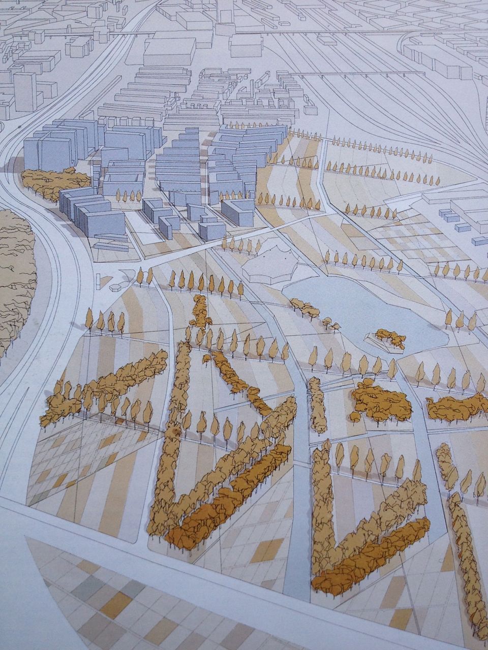 ...È una serie di dislocamenti e sovrapposizioni di griglie su un’area di circa 210 metri per 270 che hanno origine da frammenti di storia rintracciate nelle mappe. L’esito è un intrigante collage, (fa pensare ai lavori di Mimmo Rotella che scorticava i manifesti pubblicitari che negli anni erano stati sovrapposti l’uno all’altro), ma manca di una strutturazione spaziale convincente. p. 39