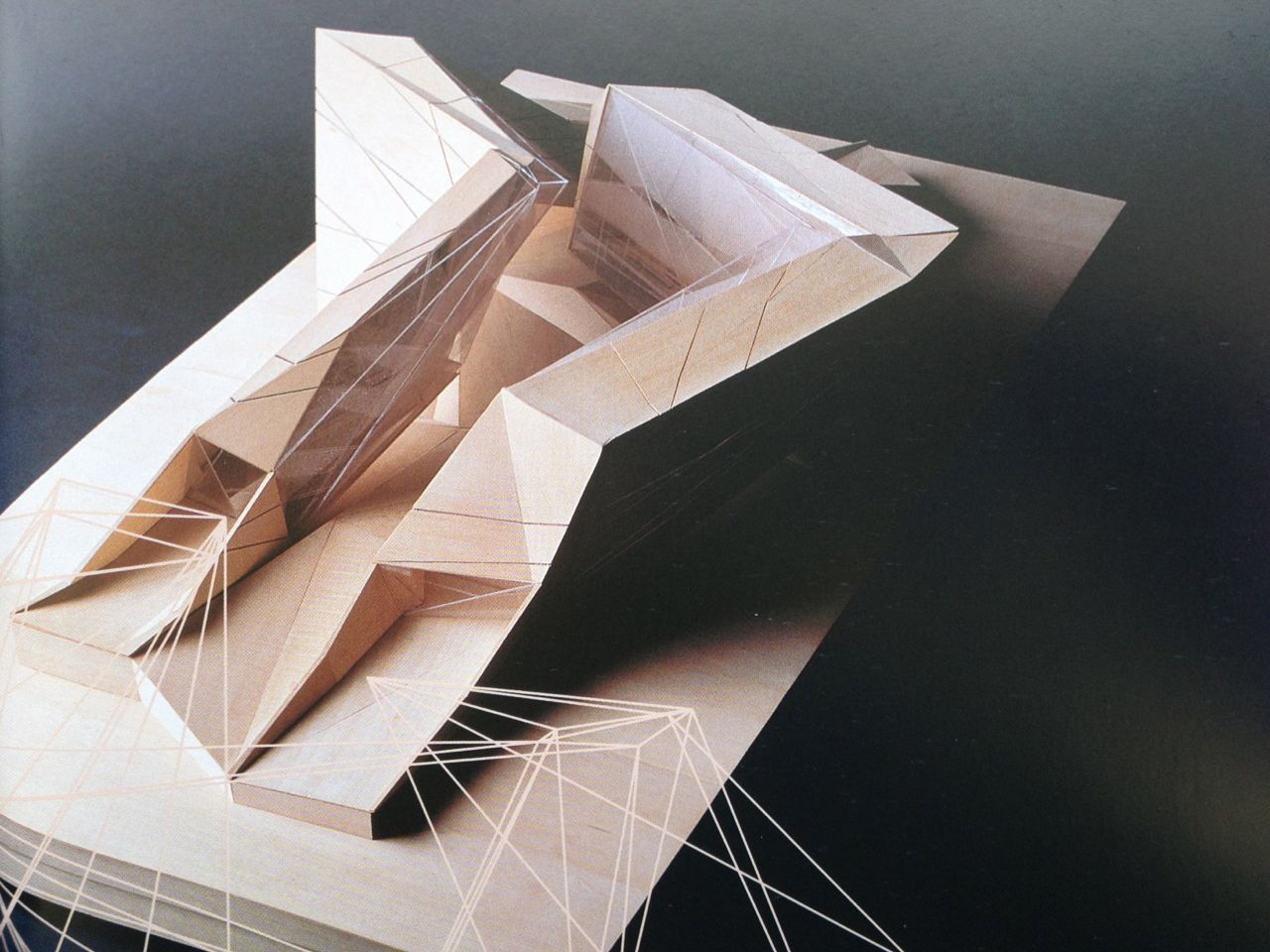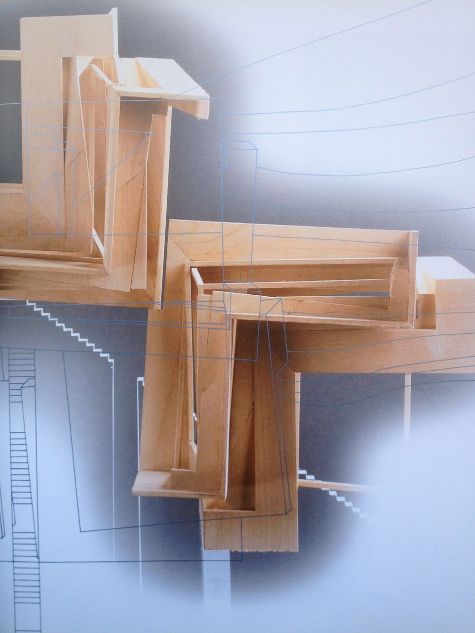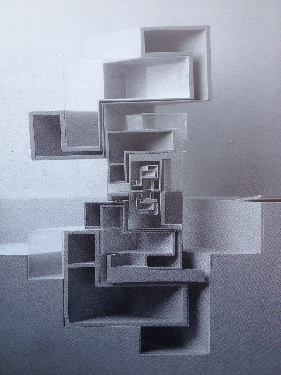 ...da una più ambiziosa e interessante ipotesi che si confrontava con la sinuosità del fiume (attraverso due linee di cubi di scala e di altezza diverse, che si sovrapponevano parzialmente in un doppio spessore), si riduce progressivamente di dimensione e al contempo si complessifica plasticamente (con una serie di operazioni di Sottrazione, Incastro e Intersezione e con una serie di altre strutture filiformi a ricordare le forme degli altri prismi virtuali) al punto da preoccupare i timidi amministratori dell’Università che affidano l’incarico ad altri progettisti. p. 48