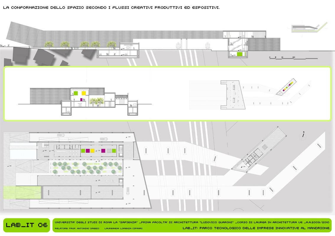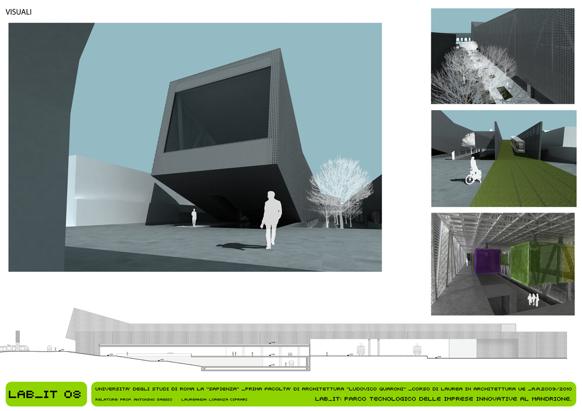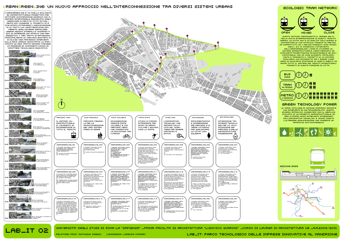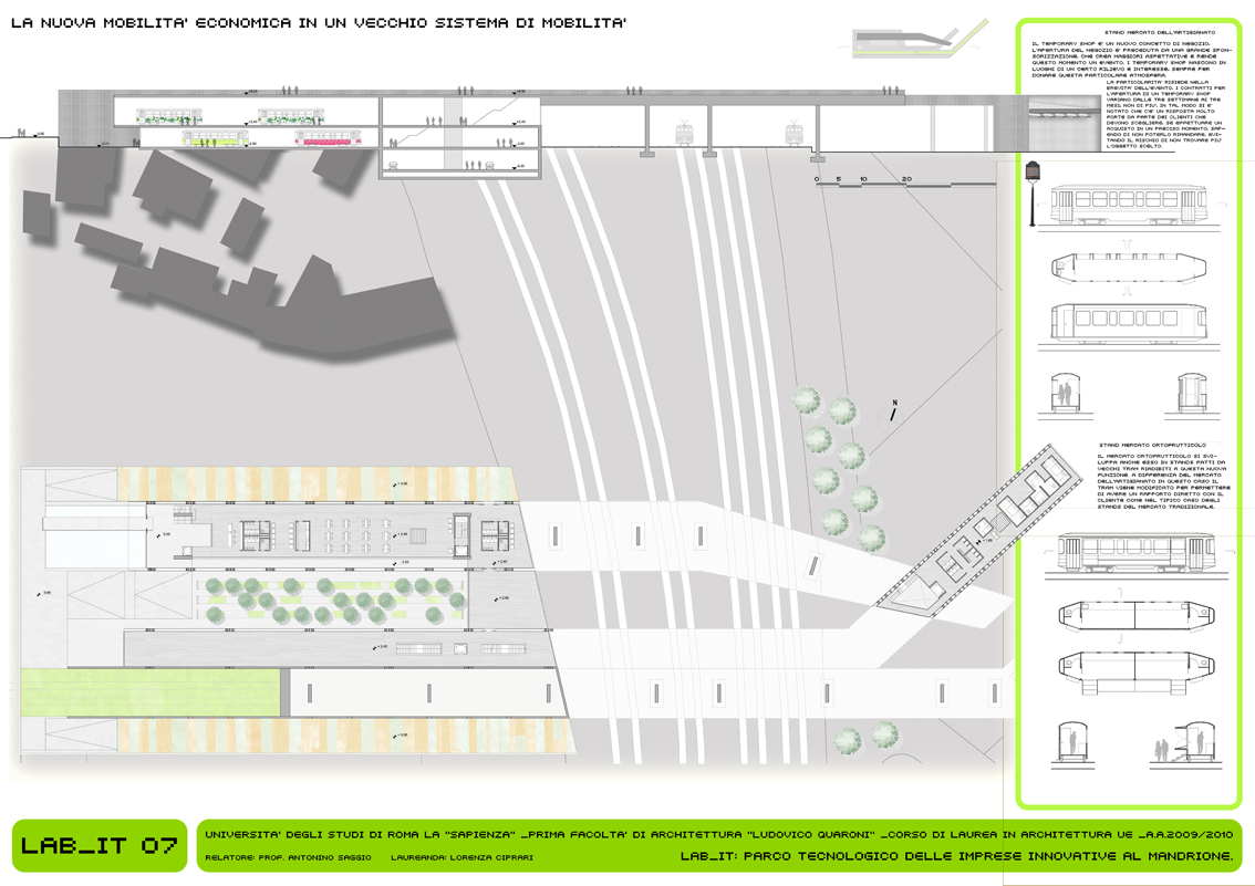 Il LAB_IT rappresenta l’approfondimento alla scala architettonica di un singolo tratto (08_UrbanGreenLine) localizzato tra Via Nocera Umbra e Via Casilina, a ridosso di Via del Mandrione. Si tratta di un’area storicamente rilevante per la presenza dell’acquedotto e di rilevanza infrastrutturalmente importante per la ferrovia (strategica per le industrie presenti) che rappresenta in questo caso l’ostacolo da superare. Il progetto è concepito con un forte carattere di mixitè. In cui diverse funzioni coesistono e rendono attivo nell’arco delle 24 ore l’intero sistema. L’elemento caratterizzante è quello infrastrutturale: il progetto prevede un vero e proprio ponte per il tram che attraversa il parco dei binari, anche se altrettanta importanza è data alla funzione creativa dei laboratori per l’artigianato. Inoltre nel progetto è presente il mercato dei prodotti artigianali ed il mercato ortofrutticolo a filiera corta. Gli stands dei mercati sono ricavati dal riutilizzo delle vetture tranviare dismesse. Il progetto è caratterizzato espressivamente dalla continuità dei flussi di percorrenza, e le sotto componenti che lo costituiscono hanno un carattere mobile e variabile, in chiave con l’intero scopo e la finalità del progetto.