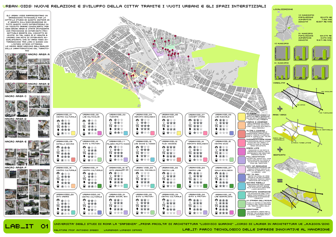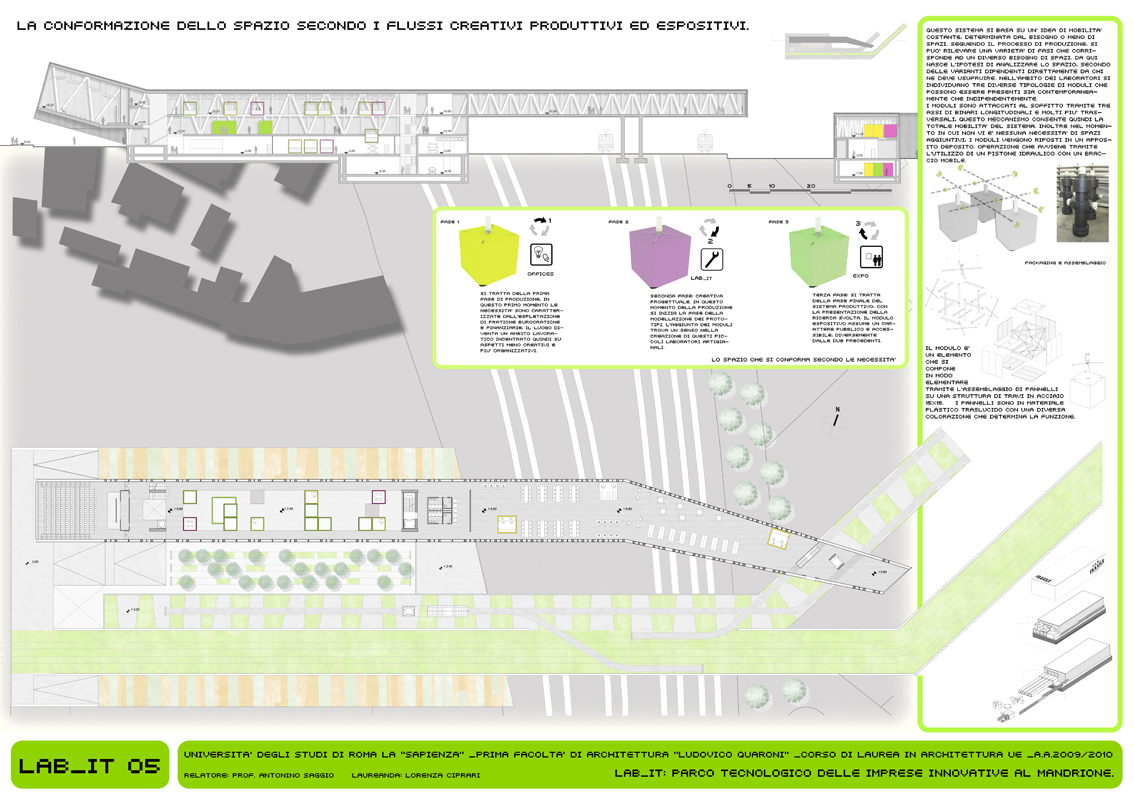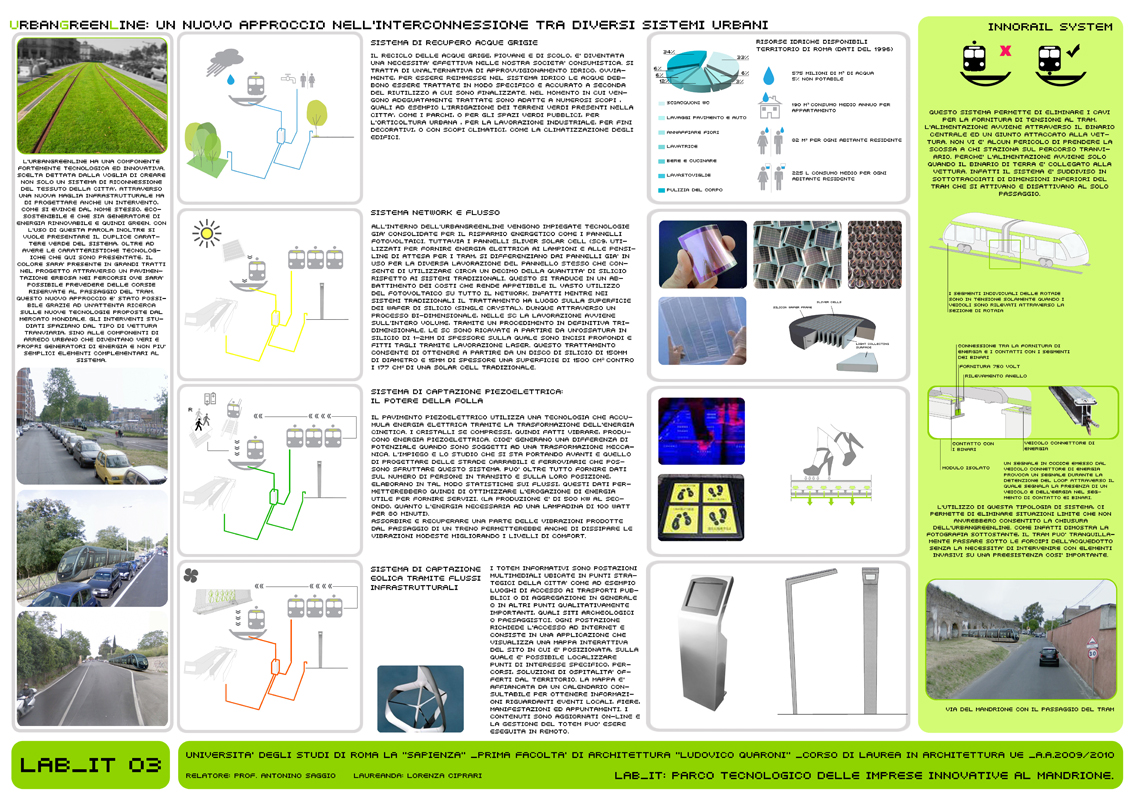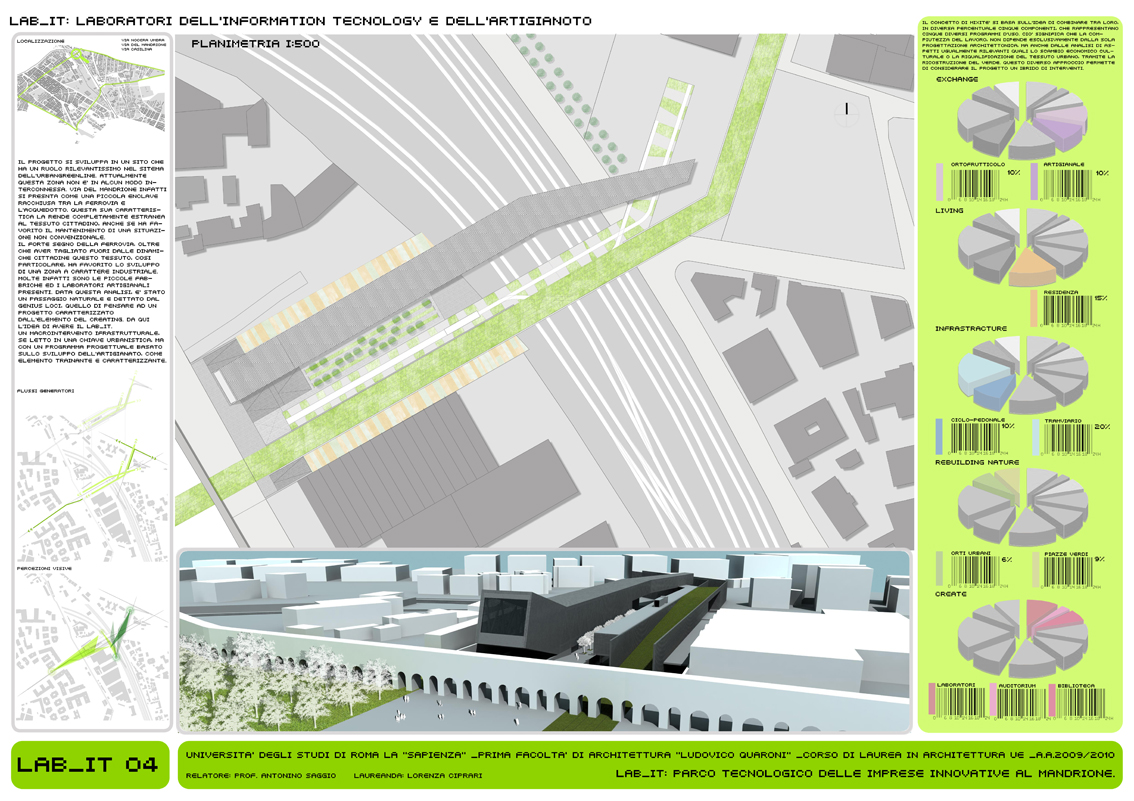 Il LAB_IT rappresenta l’approfondimento alla scala architettonica di un singolo tratto (08_UrbanGreenLine) localizzato tra Via Nocera Umbra e Via Casilina, a ridosso di Via del Mandrione. Si tratta di un’area storicamente rilevante per la presenza dell’acquedotto e di rilevanza infrastrutturalmente importante per la ferrovia (strategica per le industrie presenti) che rappresenta in questo caso l’ostacolo da superare. Il progetto è concepito con un forte carattere di mixitè. In cui diverse funzioni coesistono e rendono attivo nell’arco delle 24 ore l’intero sistema. L’elemento caratterizzante è quello infrastrutturale: il progetto prevede un vero e proprio ponte per il tram che attraversa il parco dei binari, anche se altrettanta importanza è data alla funzione creativa dei laboratori per l’artigianato. Inoltre nel progetto è presente il mercato dei prodotti artigianali ed il mercato ortofrutticolo a filiera corta. Gli stands dei mercati sono ricavati dal riutilizzo delle vetture tranviare dismesse. Il progetto è caratterizzato espressivamente dalla continuità dei flussi di percorrenza, e le sotto componenti che lo costituiscono hanno un carattere mobile e variabile, in chiave con l’intero scopo e la finalità del progetto.