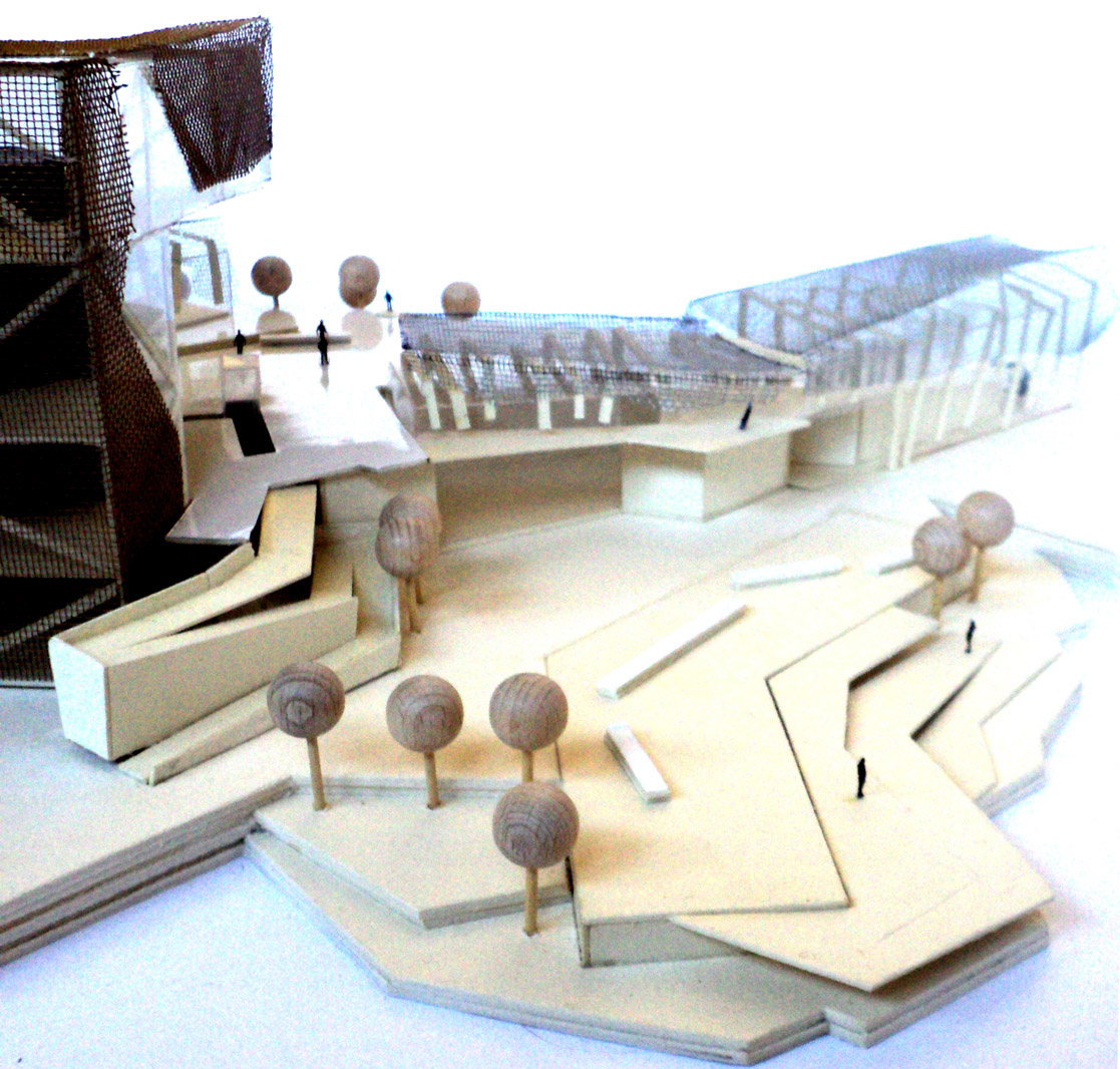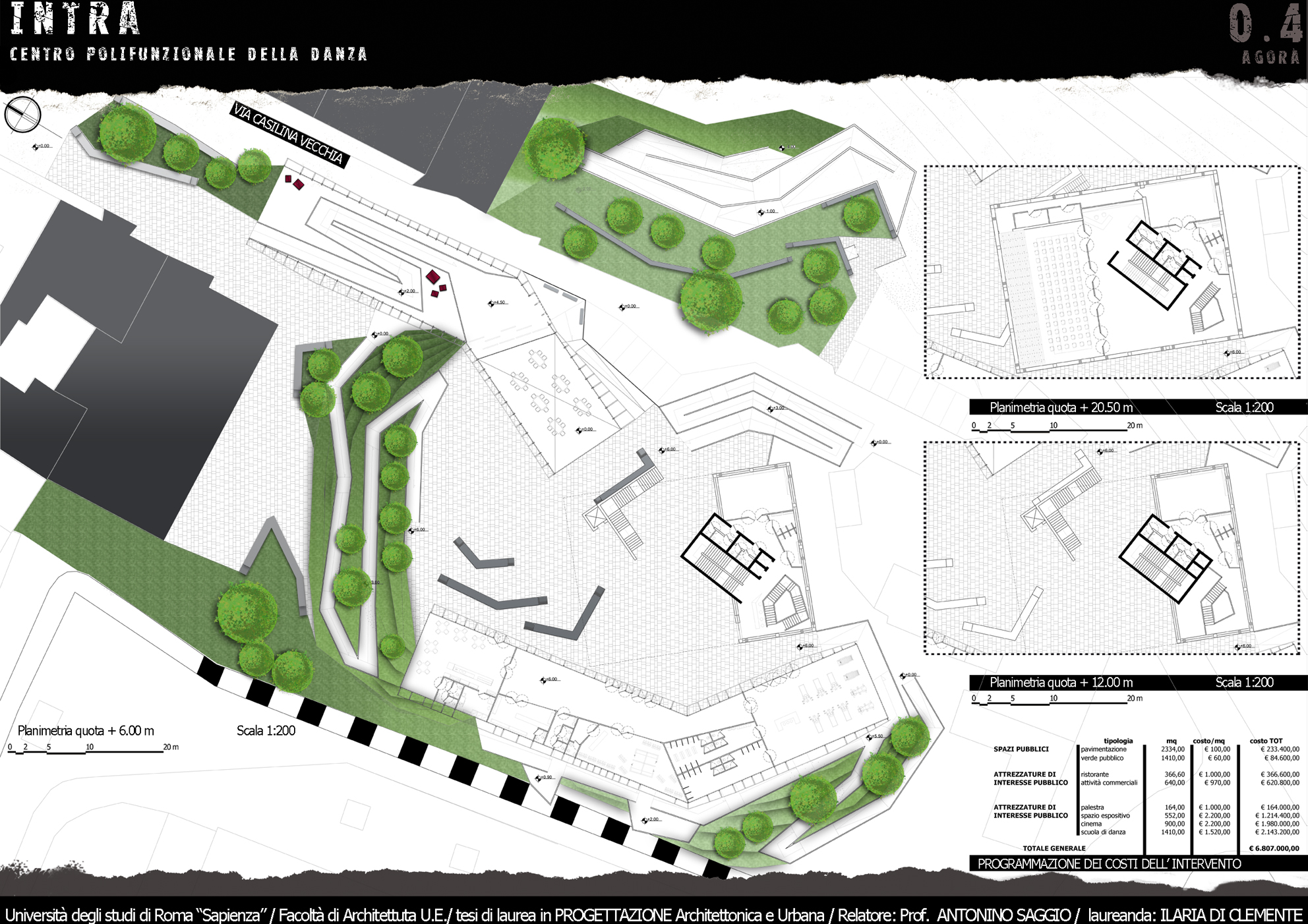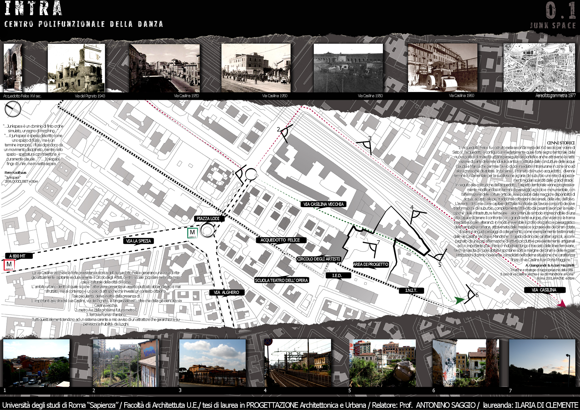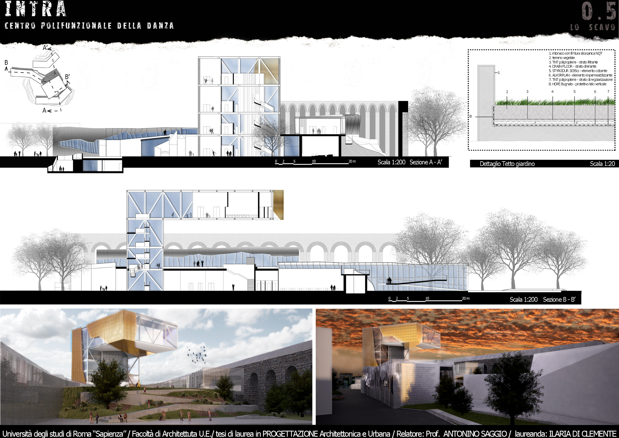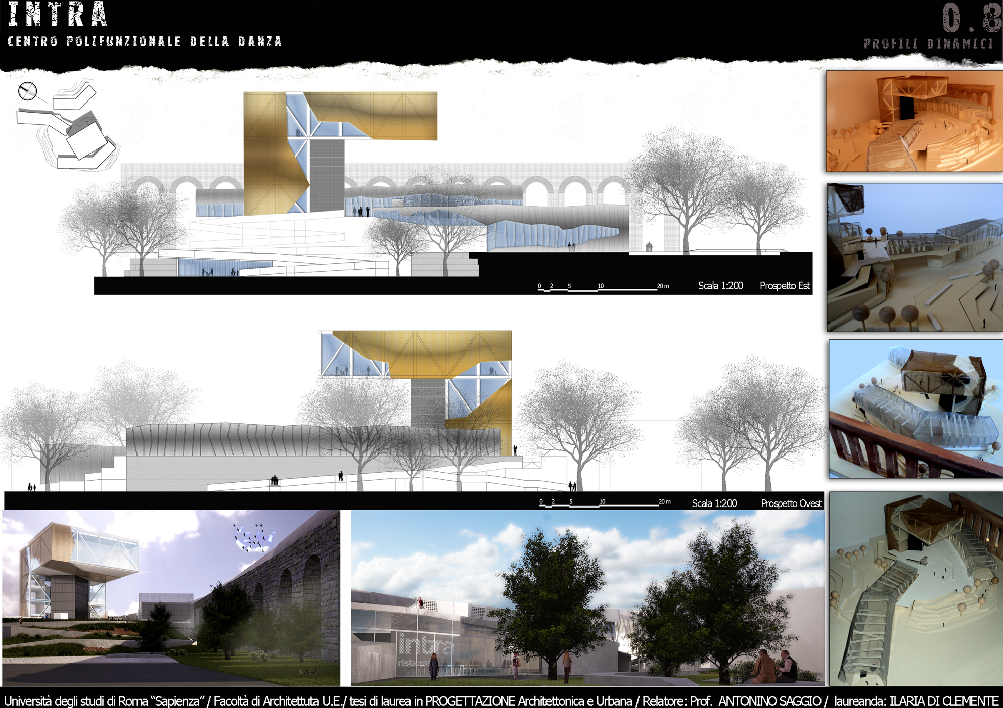 NTRA è un progetto polifunzionale, che si colloca in un’area interstiziale, mal sfruttata e semi abbandonata tra via Casilina vecchia e la preesistenza storica dell’Acquedotto Felice. Tale zona offre diversi servizi infrastrutturali tra i quali la stazione di piazza Lodi della futura linea C della metropolitana e la ferrovia Roma – Pantano che presenta una fermata limitrofa alla zona. Il progetto valorizza questi accessi, ipotizzando un arrivo sotterraneo e propone un’integrazione del nuovo centro con l’esistente Circolo degli Artisti, realtà importante della città. La forza generatrice del progetto ruota sulla Danza, sia dal punto di vista del programma (nelle immediate vicinanze vi è la storica Scuola del Teatro dell’Opera di Roma) sia da quello spaziale e formale. Dal punto di vista del programma, attorno ad una nuova Scuola di danza, catalizzatore di tutto il progetto, orbitano le altre funzioni di servizio ad INTRA che sono, un cinema con tre sale, un ristorante che si affaccia direttamente sull’asse stradale di via Casilina vecchia, uno spazio espositivo che raccorda il livello quota zero a quello di quota + 6.00 m, una palestra ed infine una zona commerciale, comprensiva di negozio per attività sportive, un giornalaio, una libreria, un bar/tavola calda, ed i servizi alla fermata della metropolitana. Dal punto di vista formale, i movimenti di avvitamento e rotazione di un danzatore, a partire dal suolo sino all’innalzamento nello spazio nello sforzo di elevarsi fisicamente e spiritualmente sono il motore della composizione.