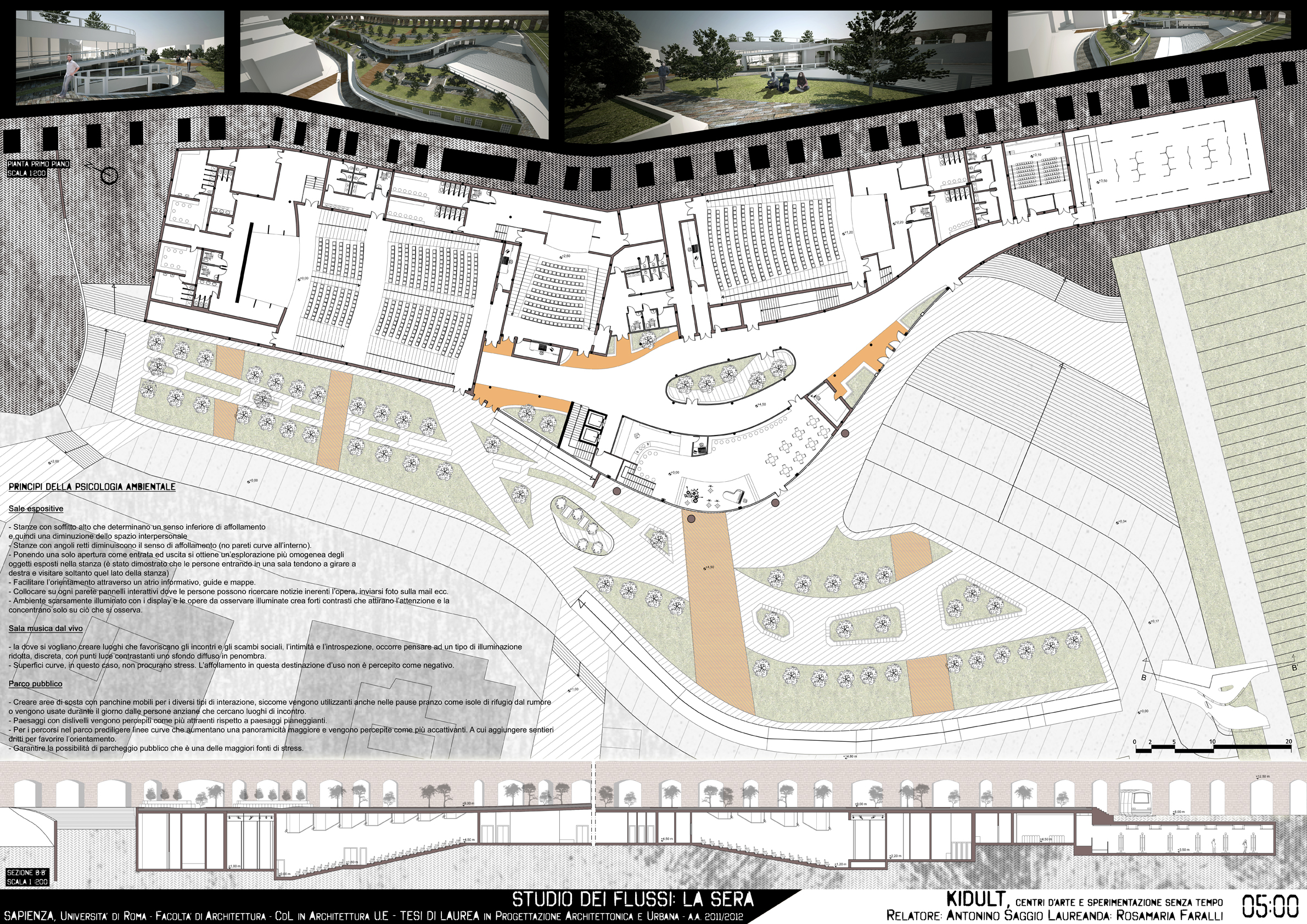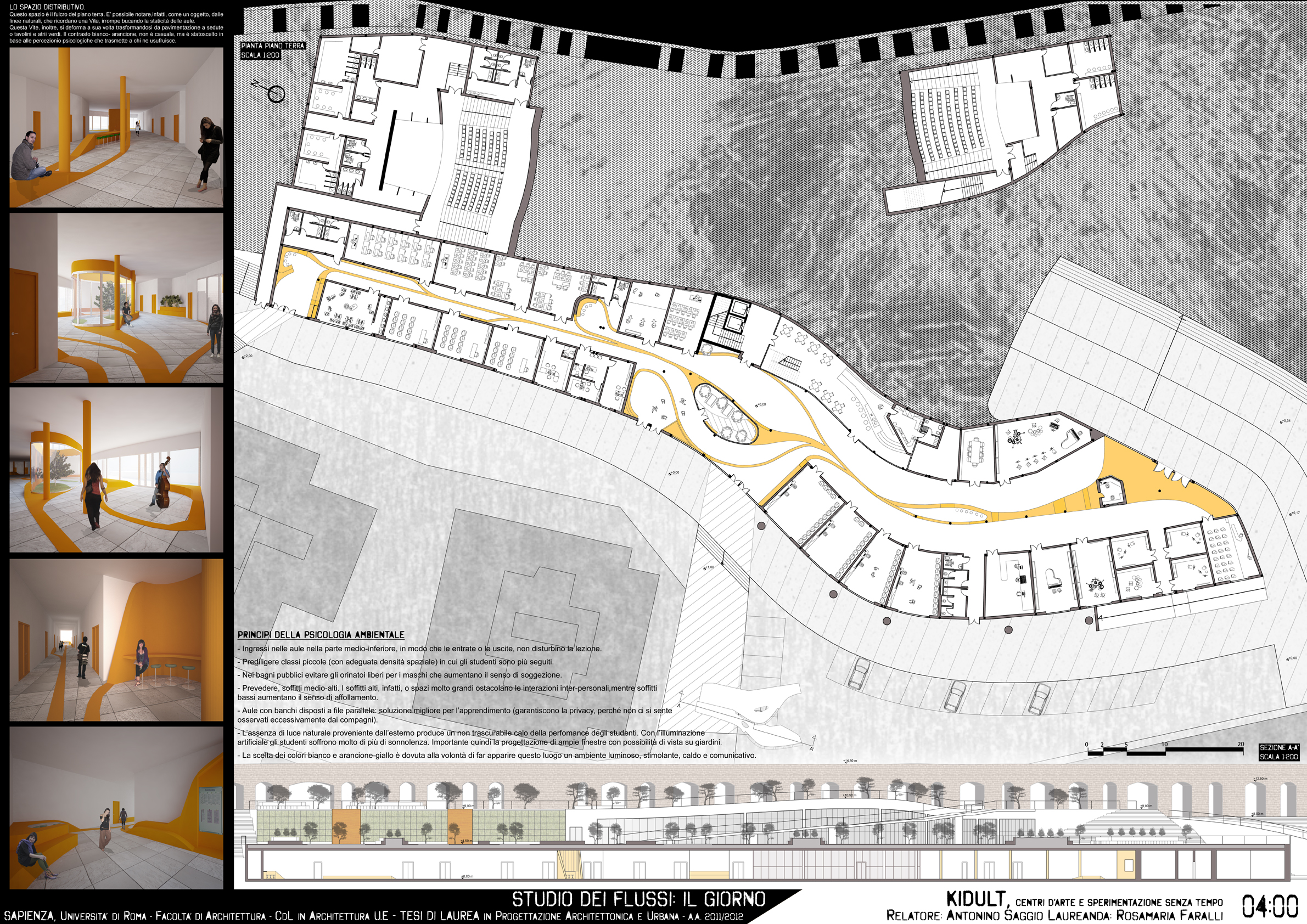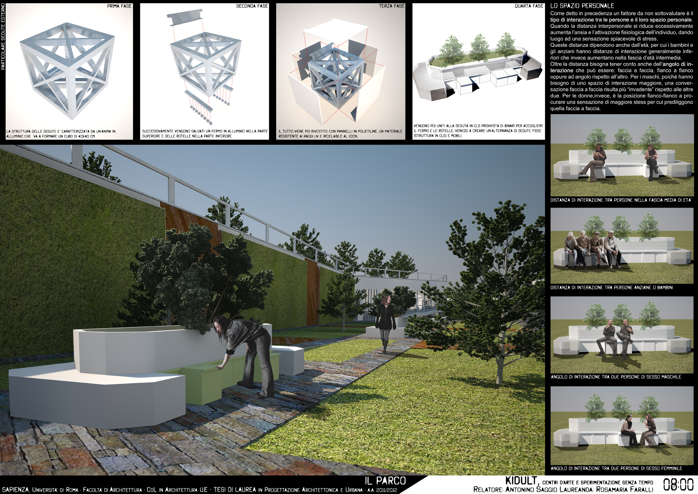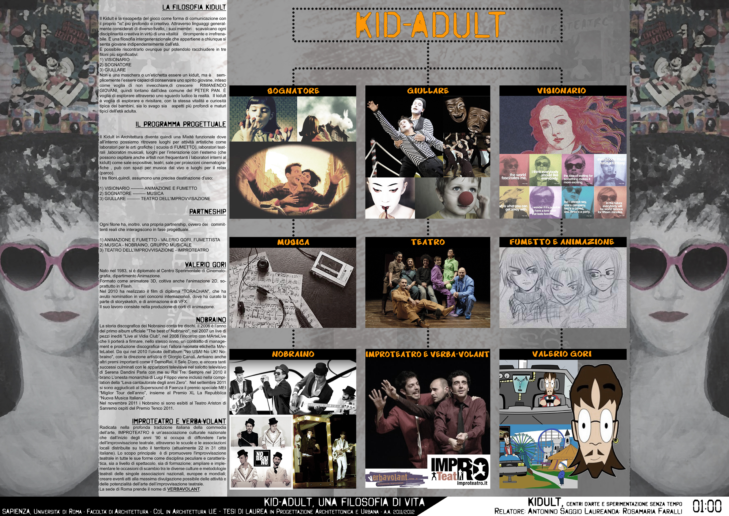Il centro Kidult è situato all’interno del IX Municipio, nel comune di Roma, in un’area che costeggia l’Acquedotto romano e via del Mandrione, alla fine di Via Nocera Umbra. Partendo da un’analisi del luogo, si può notare come quest’area rappresenti un vero è proprio punto di criticità della città, in cui via del Mandrione, una strada fatta di stratificazioni, in questo punto raggiunge un dislivello di circa 9 metri rispetto a Via Nocera Umbra creando una vera e propria spaccatura nel tessuto della città. Molte proposte sono state fatte da parte di numerosi PRG per la riconnessione di quest’area, fino ad oltre la Via Casilina utilizzando anche il dislivello della scarpata, ma ad oggi nulla è stato fatto. Il progetto Kidult, quindi, si pone come elemento di cerniera, di collegamento tra le due strade oggetto di analisi, riqualificando la scarpata verde, e trasformando le sue coperture in un vero e proprio parco urbano pubblico. Lo studio della Psicologia Ambientale ha influenzato la progettazione dell’intero intervento coinvolgendo sia gli spazi interni che quelli esterni. Nel parco infatti sono state create delle aree di sosta dotate di panchine mobili per favorire i diversi tipi di interazione e rispettare le bolle prossemiche che cambiano a seconda dell’età e del sesso. Il paesaggio, studiato per essere più accogliente ed attraente, è reso più dinamico dal gioco dei dislivelli del terreno e dai percorsi curvilinei che, muovendosi, creano differenti punti di vista, intervallati da piccoli percorsi rettilinei per favorire l’orientamento. Un contesto-paesaggio naturale è fondamentale per ritrovare un benessere psicofisico continuamente sottoposto allo stress della vita urbana, al rumore del traffico, all’affollamento, tutti fattori che sommati a condizioni di fragilità possono provocare sia l’abbassamento delle difese immunitarie, che, in alcuni casi, comportamenti aggressivi e vandalici. Molto importante è anche la mobilità, in questo caso il Tram, che corre lungo l’anello dell’Ugl e che con il suo percorso circolare rende più confortevole il tragitto. La presenza di pensiline interattive consente ai viaggiatori sia un riparo che la possibilità di ricevere informazioni ed intrattenersi con giochi ed attività ludiche.La parola Kidult è data dall’unione di Kid ed Adult e rappresenta la riscoperta del gioco come forma di comunicazione con il proprio «io» più profondo e creativo. È una filosofia intergenerazionale che appartiene a chiunque si senta giovane indipendentemente dall’età. Questa filosofia è sintetizzata nel progetto attraverso tre immagini-personaggio simbolo, il VISIONARIO, il SOGNATORE ed il GIULLARE che corrispondono rispettivamente alle attività artistiche che compongono il programma funzionale, come i laboratori per le arti grafiche e la scuola di fumetto (Visionario), i laboratori teatrali (Giullare), i laboratori musicali (Sognatore) ed infine gli spazi per l’interazione con il contesto socio-culturale come le sale espositive, teatri, sale per proiezioni cinematografiche, pub con spazi per la musica dal vivo ed il relax. Per la progettazione degli spazi interni, anche in questo caso, fondamentale è stato il ruolo della Psicologia Ambientale sia per lo studio della forma degli ambienti che delle dimensioni. Per la didattica infatti sono state progettate aule di massimo 12 allievi per garantire agli studenti di essere più seguiti con un’altezza dei soffitti medio-alta per agevolare le relazioni interpersonali generalmente difficili in spazi troppo grandi o con soffitti troppo bassi in cui si genera un senso di affollamento e quindi di confusione. L’assenza di luce naturale proveniente dall’esterno produce un calo dell’attenzione e delle perfomance degli studenti, motivo per cui le aule computer che prevedono l’uso esclusivo della luce artificiale sono state disposte verso l’interno della scarpata.Molto importante è il sistema distributivo che, oltre ad interrompere la staticità delle aule, con le sue forme curvilinee genera uno spazio più dinamico che aumenta gli scambi interpersonali. I colori bianco e giallo-arancione sono dovuti alla volontà di avere uno spazio caldo, luminoso, stimolante e comunicativo.Le superfici curve che, a differenza di quelle rette, tendono a creare una sensazione di affollamento, sono state utilizzate solo nella sala di musica live, dove questa sensazione non costituisce un fattore negativo, ma anzi contribuisce alla riuscita della serata. Studi hanno dimostrato, infatti, che una cattiva densità, relazione tra spazio e numero di persone, aumenta l’attività fisiologica degli individui e porta ad un sovraccarico d’informazioni causa di incertezza e ambiguità che aumentano l’aggressività.