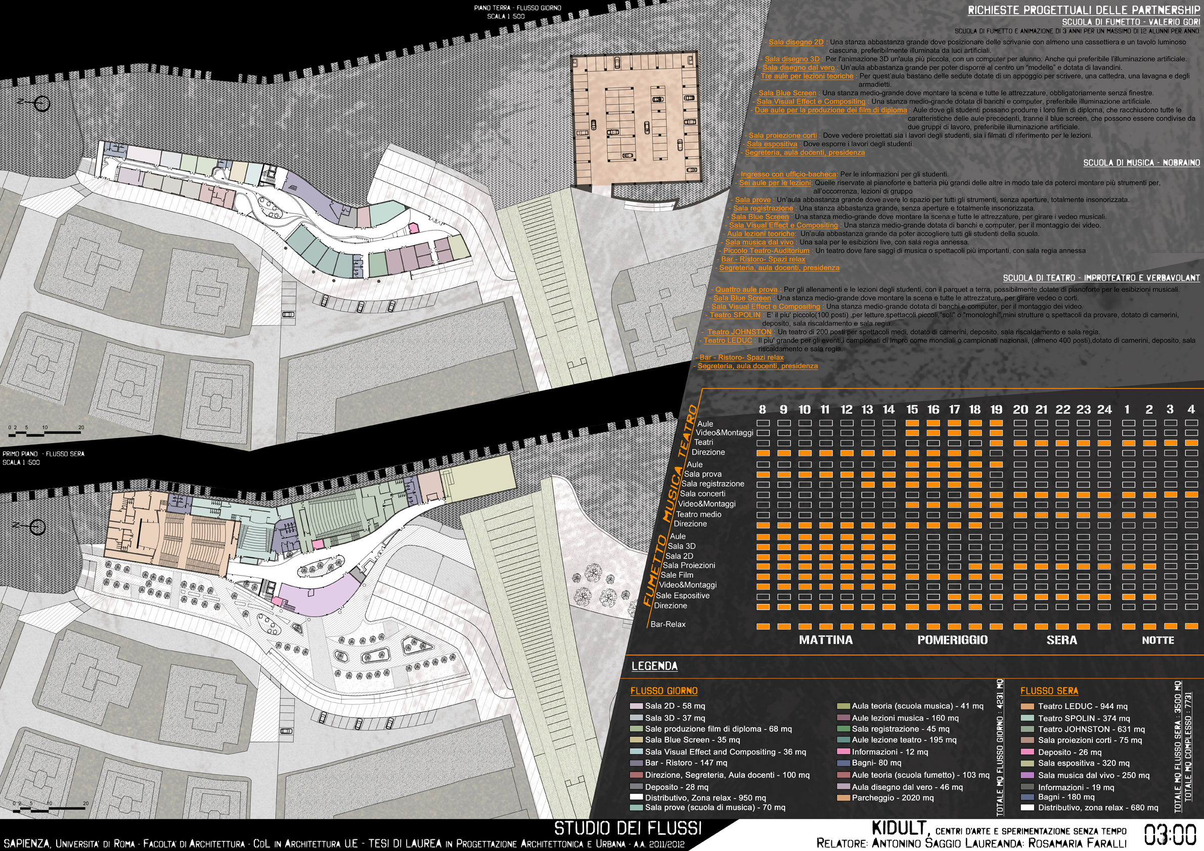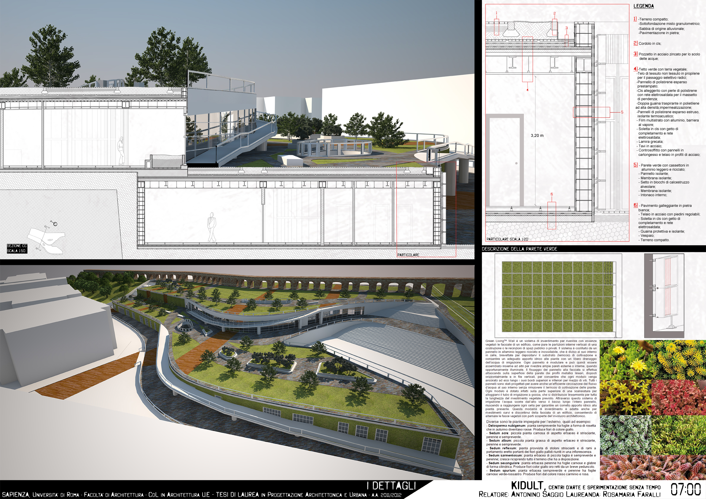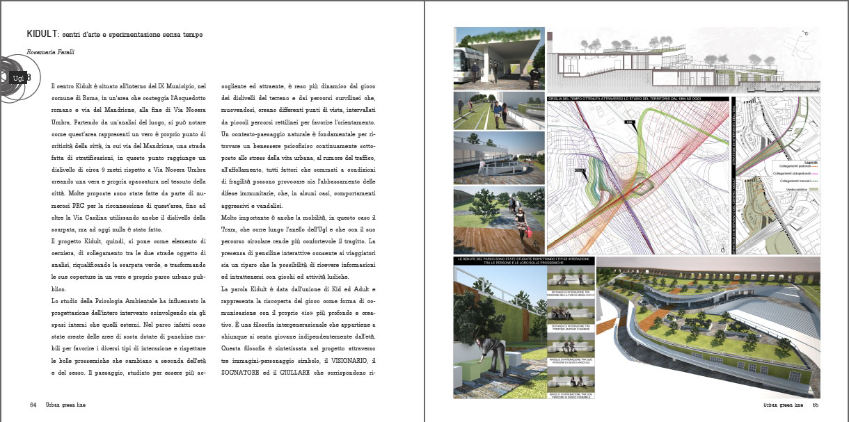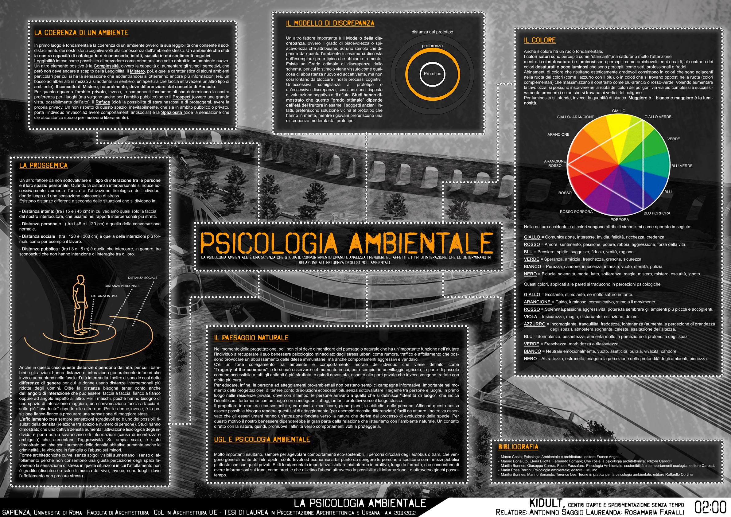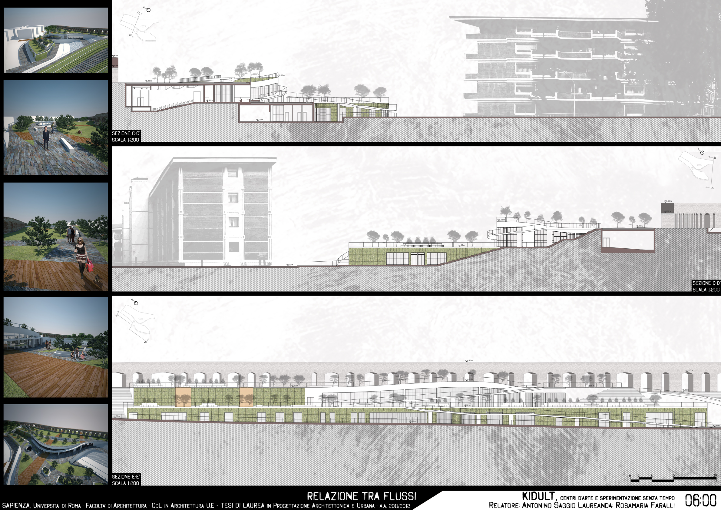 Il centro Kidult è situato all’interno del IX Municipio, nel comune di Roma, in un’area che costeggia l’Acquedotto romano e via del Mandrione, alla fine di Via Nocera Umbra. Partendo da un’analisi del luogo, si può notare come quest’area rappresenti un vero è proprio punto di criticità della città, in cui via del Mandrione, una strada fatta di stratificazioni, in questo punto raggiunge un dislivello di circa 9 metri rispetto a Via Nocera Umbra creando una vera e propria spaccatura nel tessuto della città. Molte proposte sono state fatte da parte di numerosi PRG per la riconnessione di quest’area, fino ad oltre la Via Casilina utilizzando anche il dislivello della scarpata, ma ad oggi nulla è stato fatto. Il progetto Kidult, quindi, si pone come elemento di cerniera, di collegamento tra le due strade oggetto di analisi, riqualificando la scarpata verde, e trasformando le sue coperture in un vero e proprio parco urbano pubblico. Lo studio della Psicologia Ambientale ha influenzato la progettazione dell’intero intervento coinvolgendo sia gli spazi interni che quelli esterni. Nel parco infatti sono state create delle aree di sosta dotate di panchine mobili per favorire i diversi tipi di interazione e rispettare le bolle prossemiche che cambiano a seconda dell’età e del sesso. Il paesaggio, studiato per essere più accogliente ed attraente, è reso più dinamico dal gioco dei dislivelli del terreno e dai percorsi curvilinei che, muovendosi, creano differenti punti di vista, intervallati da piccoli percorsi rettilinei per favorire l’orientamento. Un contesto-paesaggio naturale è fondamentale per ritrovare un benessere psicofisico continuamente sottoposto allo stress della vita urbana, al rumore del traffico, all’affollamento, tutti fattori che sommati a condizioni di fragilità possono provocare sia l’abbassamento delle difese immunitarie, che, in alcuni casi, comportamenti aggressivi e vandalici. Molto importante è anche la mobilità, in questo caso il Tram, che corre lungo l’anello dell’Ugl e che con il suo percorso circolare rende più confortevole il tragitto. La presenza di pensiline interattive consente ai viaggiatori sia un riparo che la possibilità di ricevere informazioni ed intrattenersi con giochi ed attività ludiche.La parola Kidult è data dall’unione di Kid ed Adult e rappresenta la riscoperta del gioco come forma di comunicazione con il proprio «io» più profondo e creativo. È una filosofia intergenerazionale che appartiene a chiunque si senta giovane indipendentemente dall’età. Questa filosofia è sintetizzata nel progetto attraverso tre immagini-personaggio simbolo, il VISIONARIO, il SOGNATORE ed il GIULLARE che corrispondono rispettivamente alle attività artistiche che compongono il programma funzionale, come i laboratori per le arti grafiche e la scuola di fumetto (Visionario), i laboratori teatrali (Giullare), i laboratori musicali (Sognatore) ed infine gli spazi per l’interazione con il contesto socio-culturale come le sale espositive, teatri, sale per proiezioni cinematografiche, pub con spazi per la musica dal vivo ed il relax. Per la progettazione degli spazi interni, anche in questo caso, fondamentale è stato il ruolo della Psicologia Ambientale sia per lo studio della forma degli ambienti che delle dimensioni. Per la didattica infatti sono state progettate aule di massimo 12 allievi per garantire agli studenti di essere più seguiti con un’altezza dei soffitti medio-alta per agevolare le relazioni interpersonali generalmente difficili in spazi troppo grandi o con soffitti troppo bassi in cui si genera un senso di affollamento e quindi di confusione. L’assenza di luce naturale proveniente dall’esterno produce un calo dell’attenzione e delle perfomance degli studenti, motivo per cui le aule computer che prevedono l’uso esclusivo della luce artificiale sono state disposte verso l’interno della scarpata.Molto importante è il sistema distributivo che, oltre ad interrompere la staticità delle aule, con le sue forme curvilinee genera uno spazio più dinamico che aumenta gli scambi interpersonali. I colori bianco e giallo-arancione sono dovuti alla volontà di avere uno spazio caldo, luminoso, stimolante e comunicativo.Le superfici curve che, a differenza di quelle rette, tendono a creare una sensazione di affollamento, sono state utilizzate solo nella sala di musica live, dove questa sensazione non costituisce un fattore negativo, ma anzi contribuisce alla riuscita della serata. Studi hanno dimostrato, infatti, che una cattiva densità, relazione tra spazio e numero di persone, aumenta l’attività fisiologica degli individui e porta ad un sovraccarico d’informazioni causa di incertezza e ambiguità che aumentano l’aggressività.