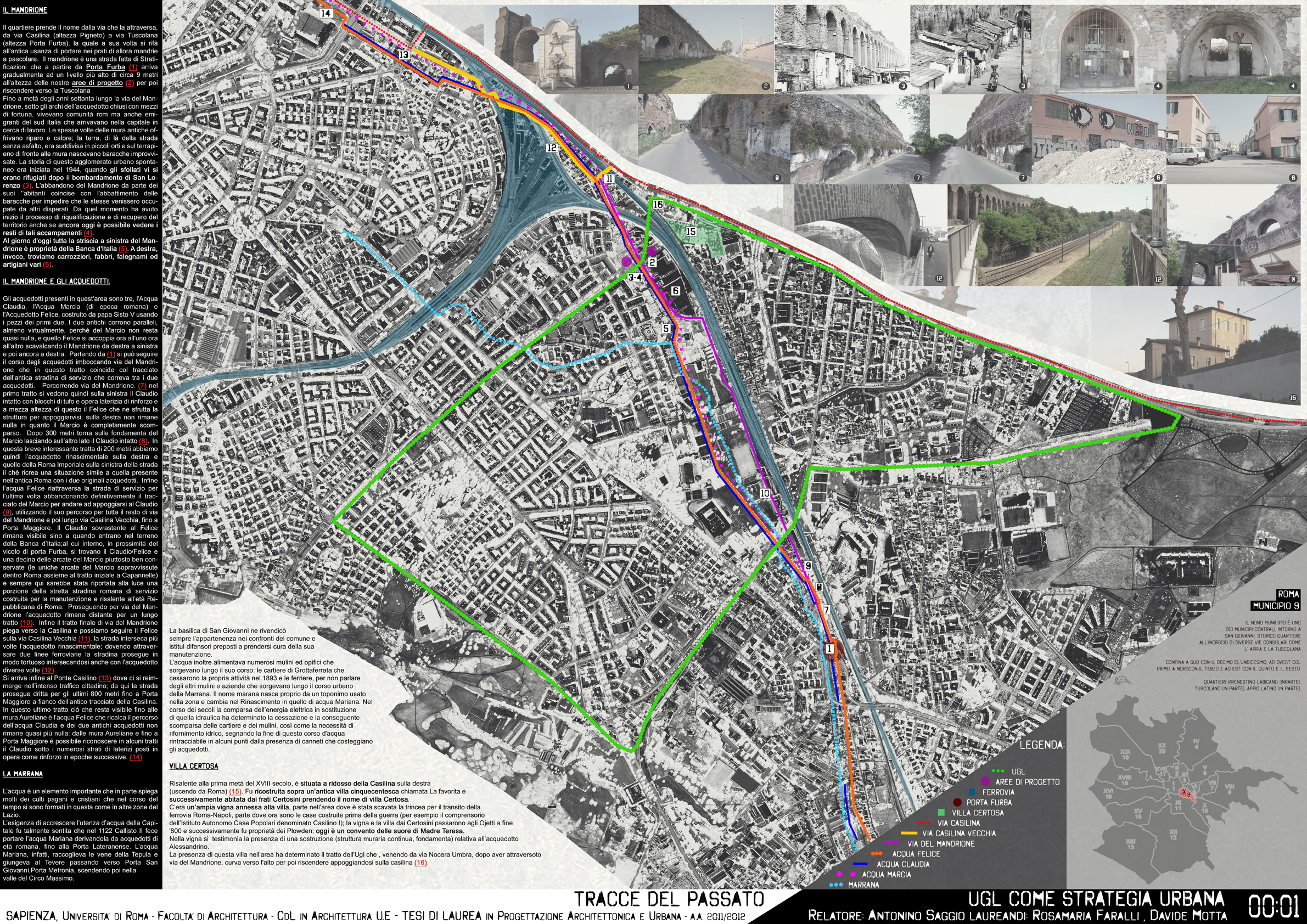 Partendo da un'analisi storica del luogo del progetto, collocato alla fine - bruscamente interrotta - dell’asse di via Nocera Umbra, nel IX Municipio di Roma, si sono pregiudizialmente individuate le preesistenze storiche ancora tangibili e la loro attuale criticità nella città.