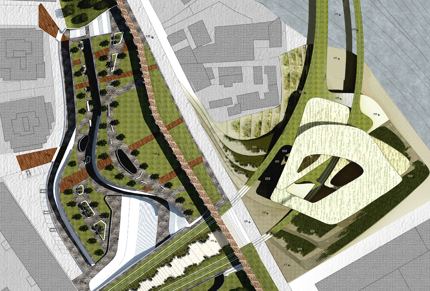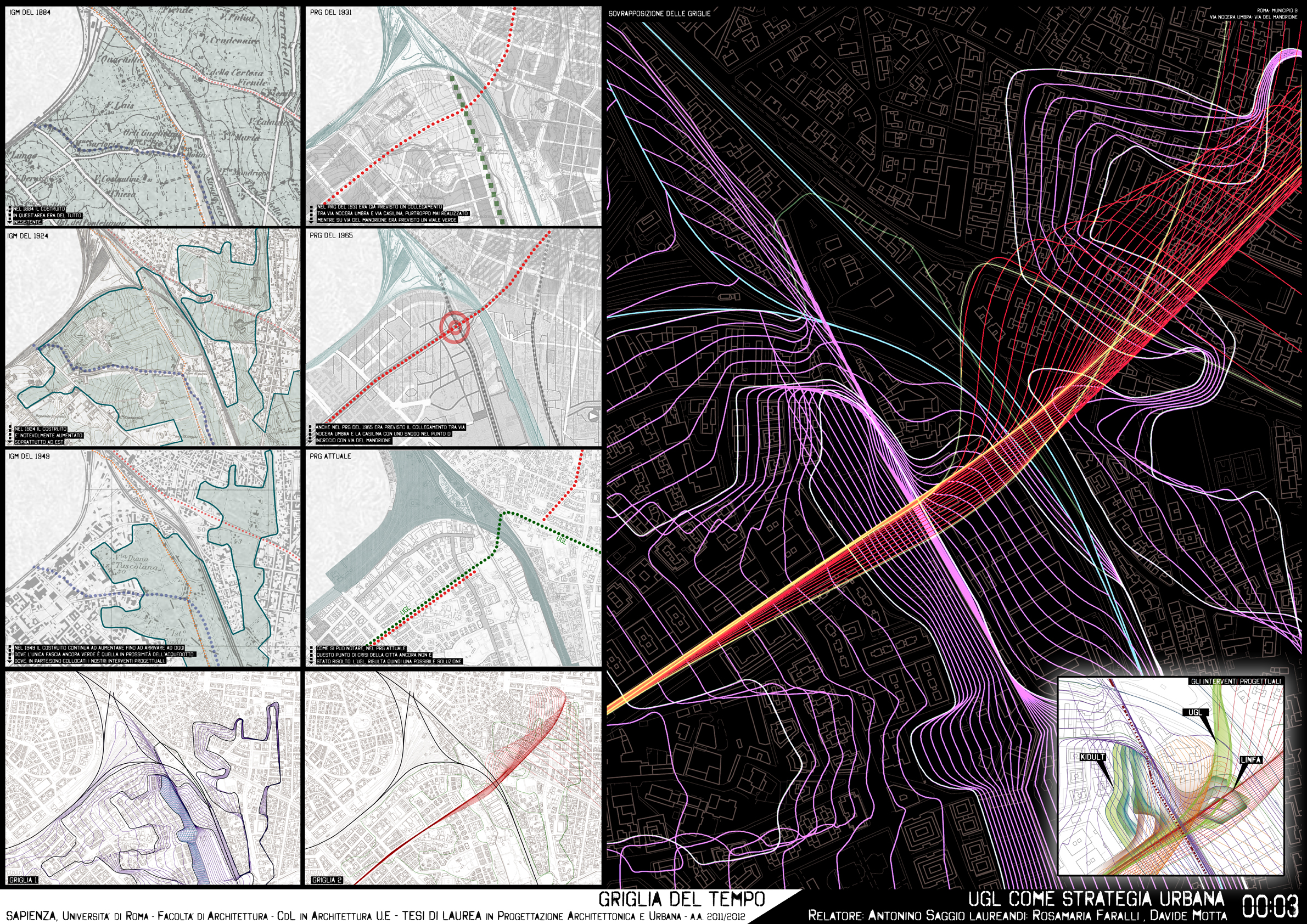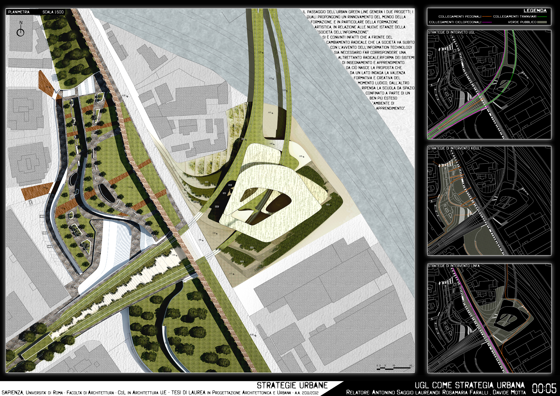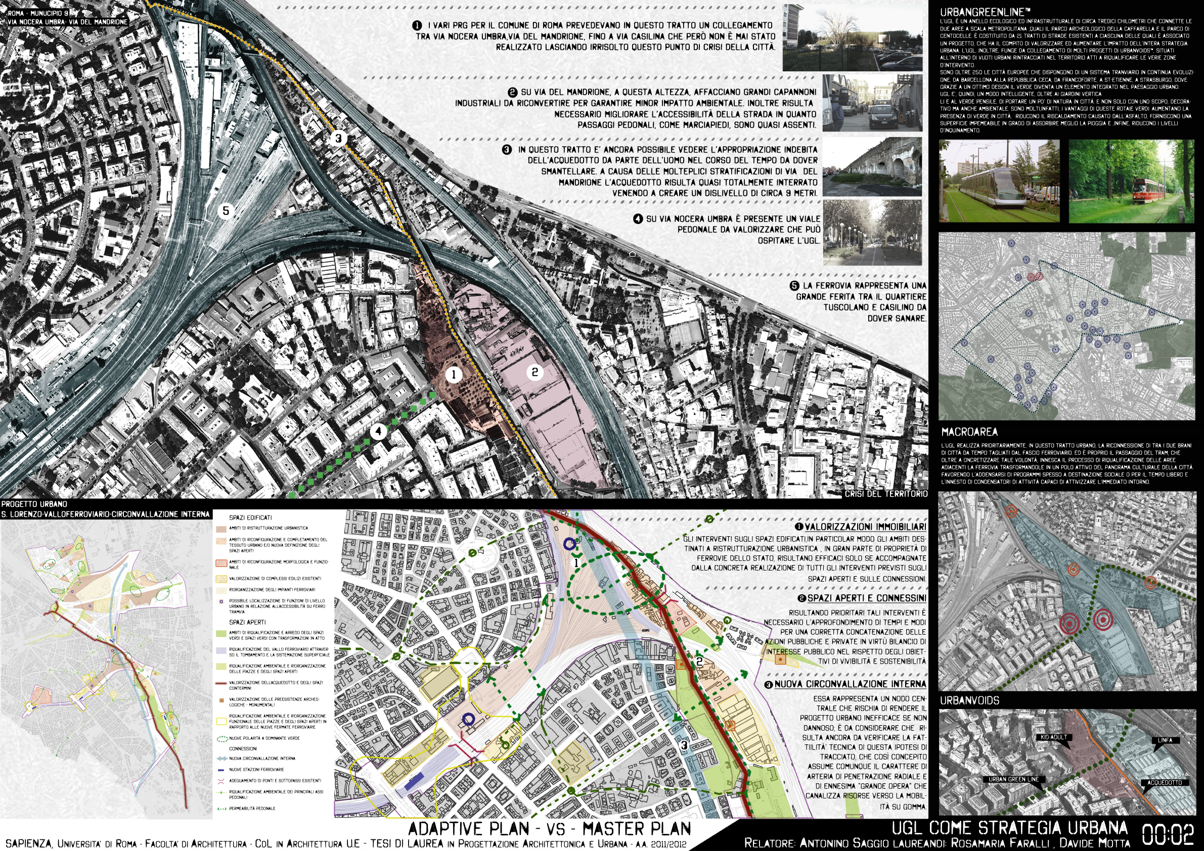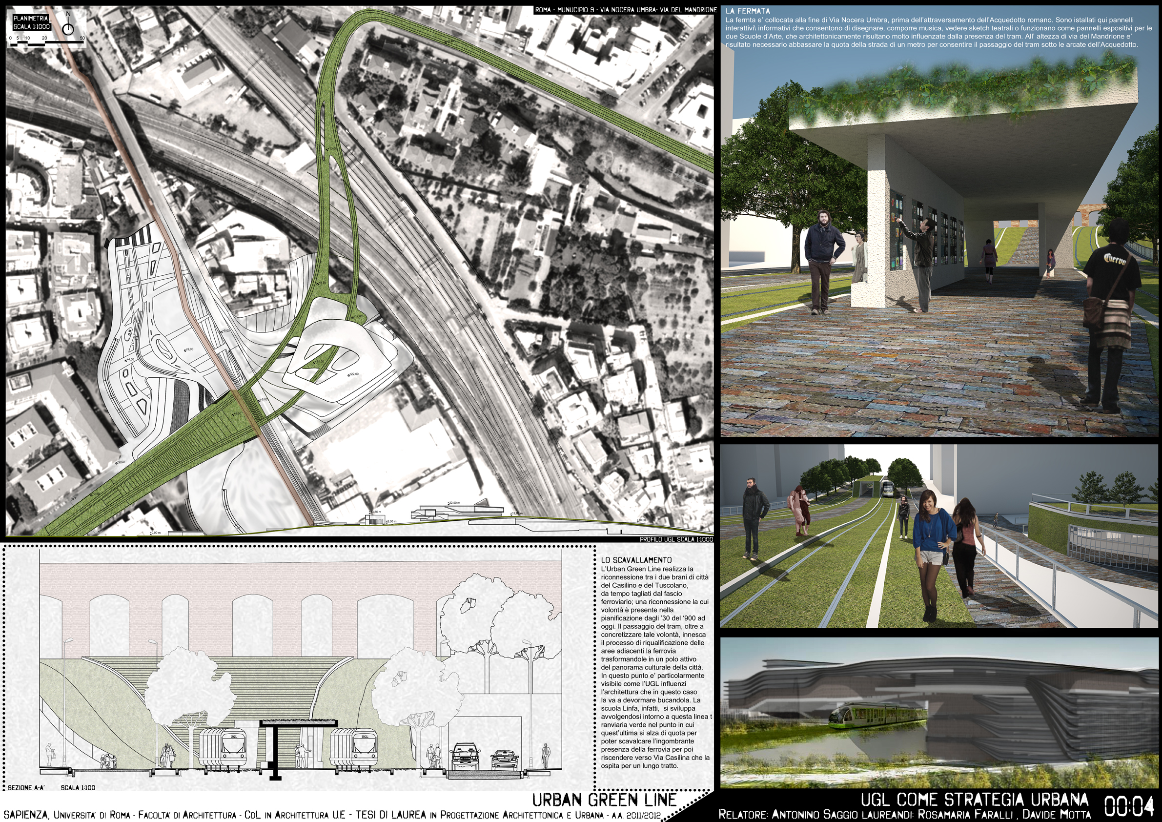 Questa tesi di laurea disegna con precisione gli andamenti di questo scavalcamento, individuando il necessario sfioccamento dei binari tranviari e il loro riammagliarsi nel tessuto della via Casilina. Il disegno nasce da una approfondita analisi delle forze morfologiche e delle giaciture dei diversi tessuti edilizi, delle stesse preesistenze archeologiche nel settore e dall’analisi della progressiva densificazione del suolo a partirte dal 1884. L’insieme della ricerca di informazioni converge progressivamente in una serie di operazioni diagrammatiche che determinano a poco a poco il campo possibile dell’andamento della infrastruttura. Allo stesso tempo questo campo di forze determina l’integrazione nel disegno complessivo dei due progetti architettonici all’interno del disegno dell’infrastruttura. In questo ambito è una forte originalità del progetto che disegna congiuntamente nodo infrastrutturale ed edifici. Il progetto di Rosamaria Faralli utilizza i vari livelli della scarpata per il Centro Kid Adult, e il progetto di Davide Motta per un Liceo artistico di nuova concezione che accompagnando e avvolgendosi nella urban green line diventa con l'infrastruttta quasi un'unica cosa. .