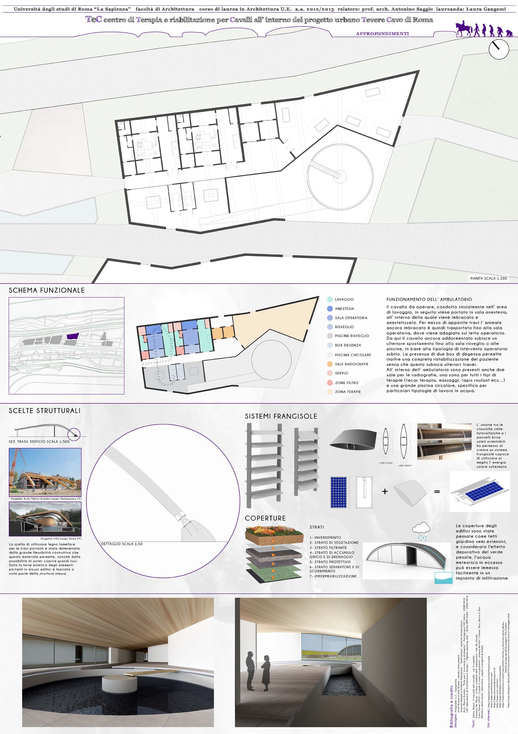 Il progetto si sviluppa in lunghezza in una striscia stretta e lunga parallela al borghetto esistente e ospita diverse strutture collegate per mezzo di percorsi che contribuiscono alla formazione di un disegno omogeneo. L’impianto prevede la presenza di alloggi per il personale e per i fruitori, di laboratori e campi regolamentari per il conseguimento delle patenti, di una parte esclusivamente dedicata ai cavalli che comprende scuderie, giostra, tondino, paddock e ambulatorio. Cuore del progetto è proprio l’ambulatorio, creato con sistemi innovativi per soddisfare al meglio le esigenze di riabilitazione e strettamente connesso con la fascia di verde lungo il fiume. L'intervento propone anche di creare dei percorsi nel verde lungo il fiume per consentire delle passeggiate con i cavalli, terapeutiche tanto per gli animali quanto per l’uomo.