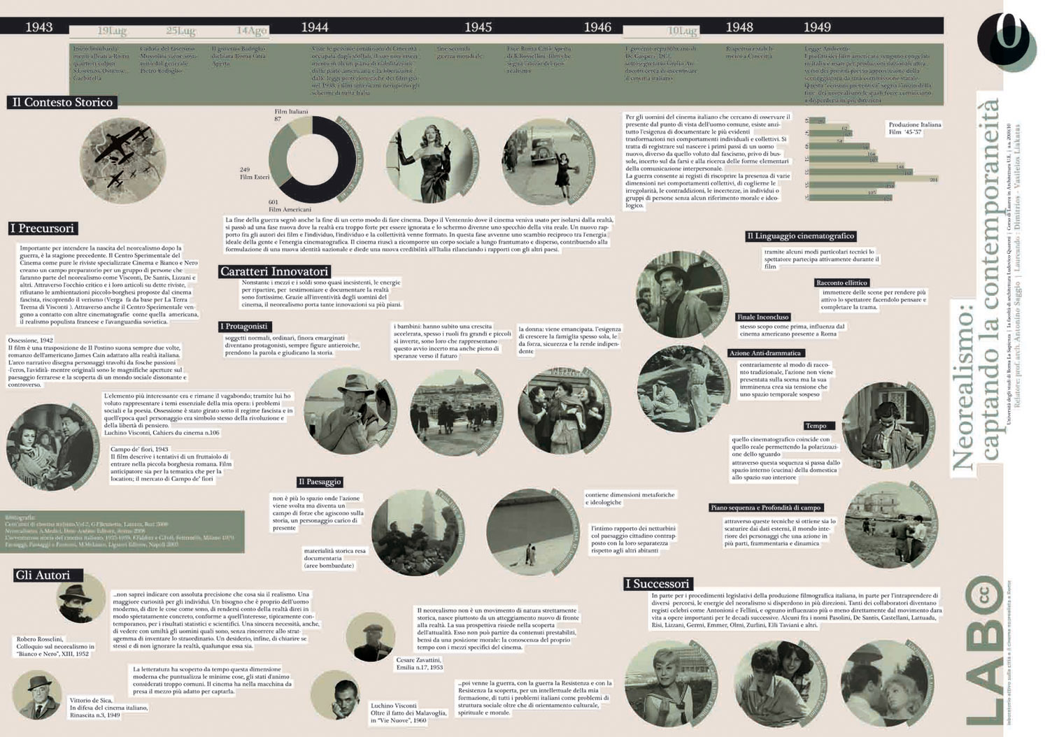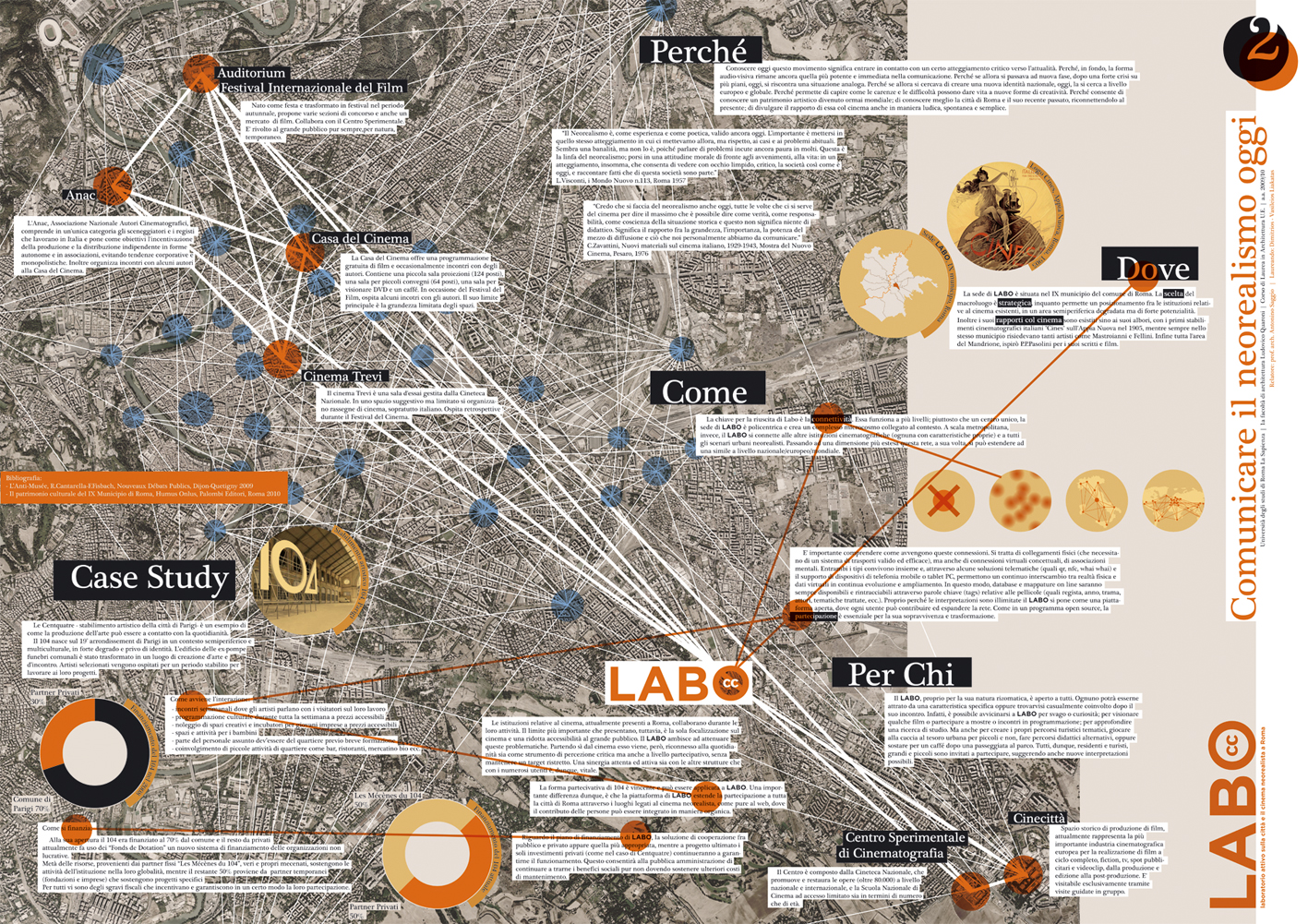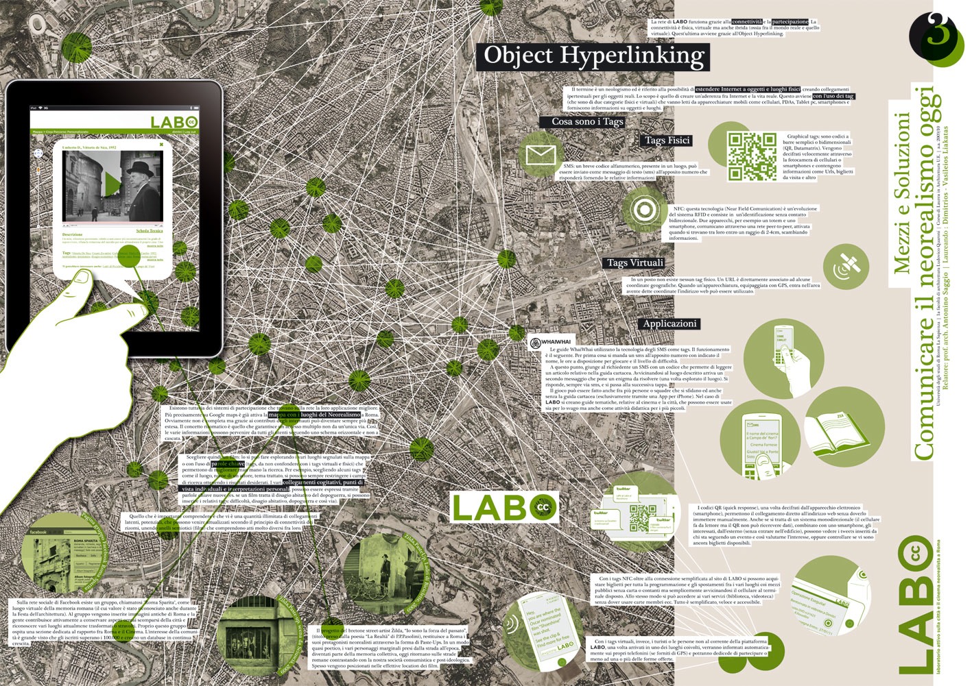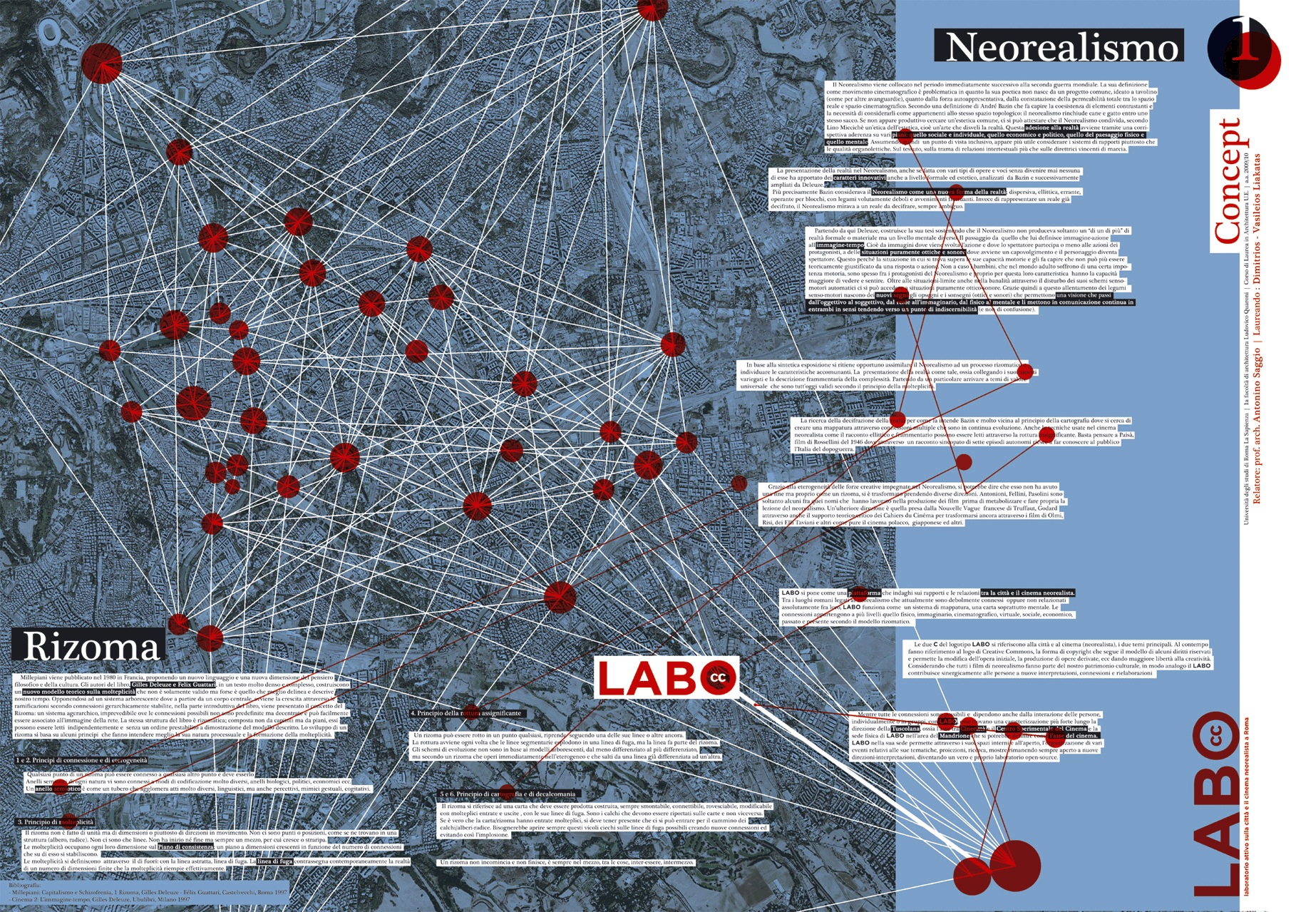 Il progetto nasce dalla passione per il cinema e più specificatamente per il cinema neorealista italiano. Interessante non solo per il suo valore artistico, ma per il suo sguardo critico sulla realtà, il neorealismo risulta tutt ggi attuale. Grande parte di questa produzione cinematografica è stata ambientata a Roma del dopoguerra, in luoghi molto eterogenei che oggi quasi non portano tracce di questo loro passato. Il LABO (laboratorio attivo sulla città e il cinema neorealista a Roma), utilizzando il modello teorico sulla complessità dei Rizomi (Deleuze&Guattari) per spiegare e comunicare il movimento neorealista, si pone come una piattaforma open-source che riconnette vari aspetti del Neorealismo con la città a più livelli: fisico, teorico, virtuale, cognitivo ecc. Attraverso l'uso di innovativer soluzioni tecnologiche è possibile far conoscere aspetti diversi dei luoghi e creare nuovi modi per vivere gli spazi all'interno della città. La natura aperta di LABO, permette sia di contribuire attivamente ed espandere questa rete di informazioni ma anche tracciare dinamicamente delle mappe individuali (mentali e non).
