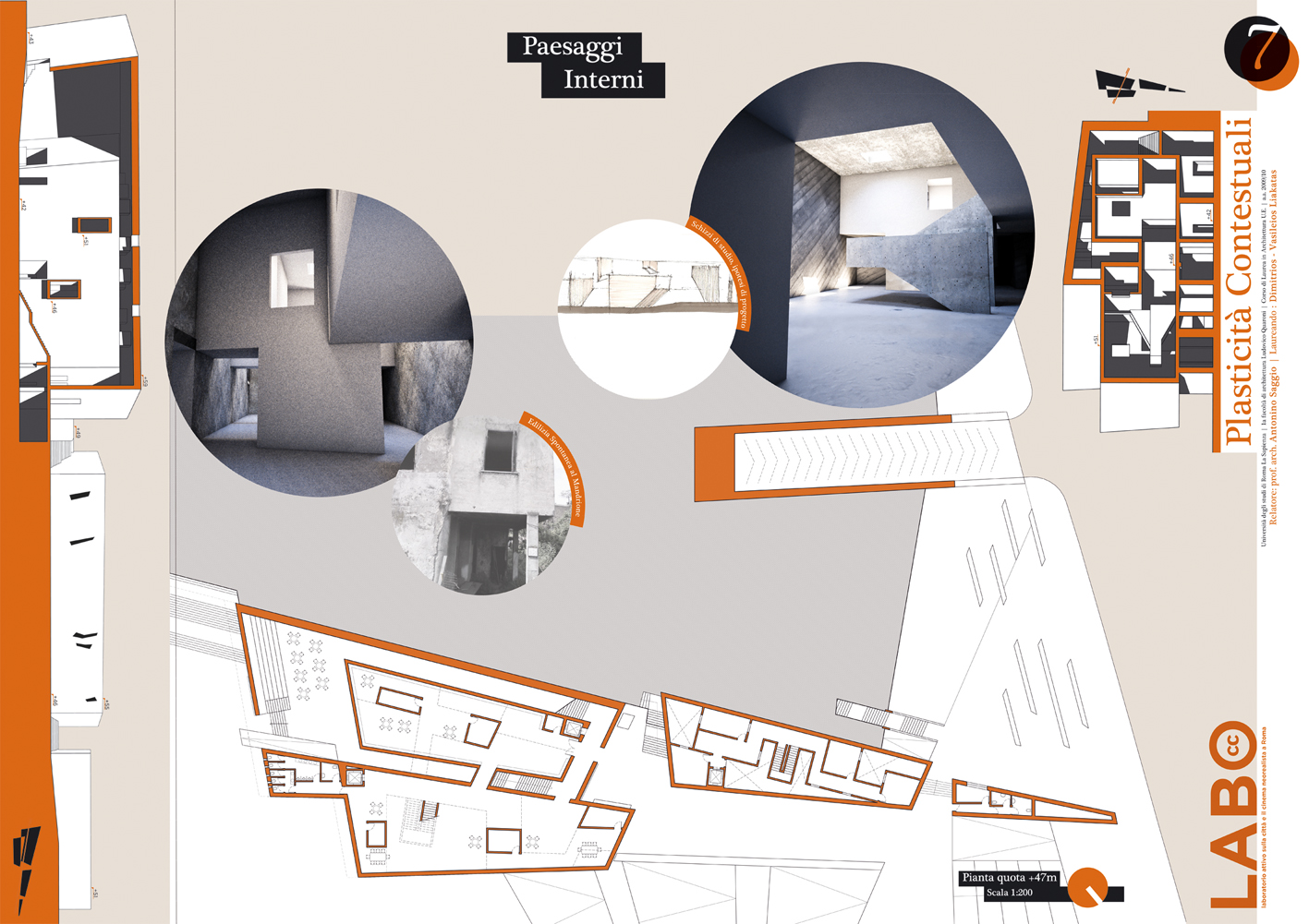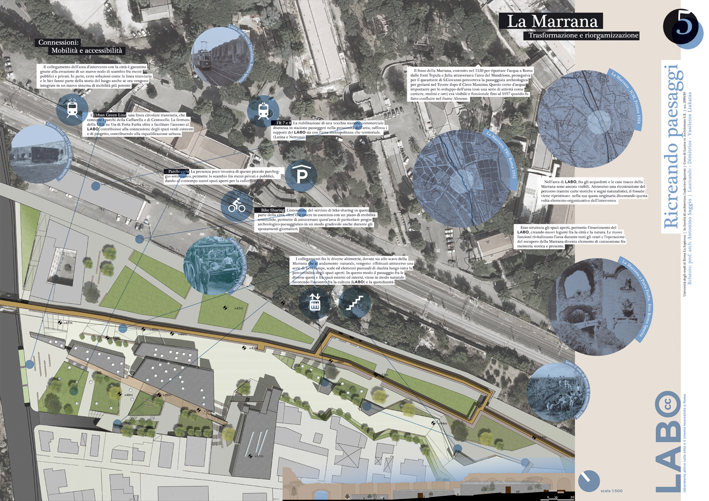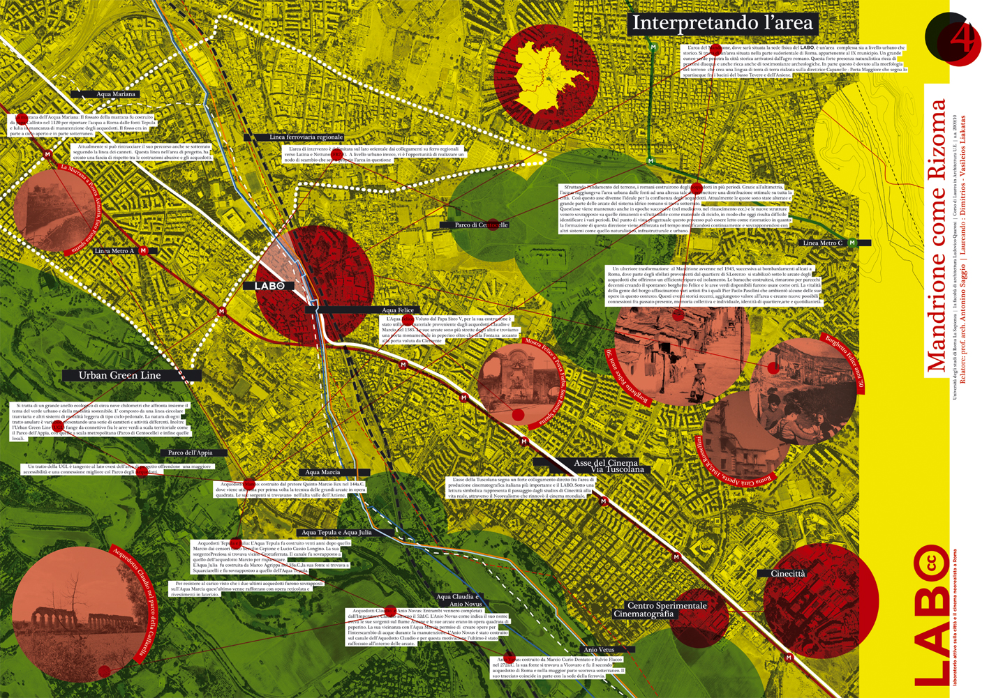 In una zona di Roma caratterizzata dall'intreccio di antichi acquedotti e dallo scavo del fosso della Marana, tra pressistenze archeologiche ed una edilizia spontanea accumulata negli scorsi decenni e oggi quasi fortificata nella sua stessa diversità, si incunea il Progetto del Labo: un Laboratorio per lo studio del Cinema neoralista a Roma. La zona del Mandrione infatti è fortemente legata all'immaginario neo realista e ben può accogliere una struttura con tali finalità. L'andamento planimetrico del progetto scava il terreno valorizzando il vecchio andamento del fosso della Marana e a questo si raffronta nell'andamento zigzagante. Gli spazi del Labo vivono di una voluta indifferenziazione tra interno ed esterno (uno dei temi cardine del neo realismo). Masse frammentarie aprano squarci e invitano a relazioni inaspettate, spesso caratterizzate da profondi coni di luce e ombra. Naturalmente il Labo innesta anche le relazioni e le tecnologie per un museo diffuso per la conoscenza dei luoghi e della cultura del neorealismo a Roma attraverso le moderne tecnologie. In particolare, collocandosi accanto alla Urban Green line, ne costituisce uno dei poli di arrivo, ma anche di ripartenza per la conoscenza dei luoghi del neorealismo in questa parte della città. Il Labo così diventa uno dei punti di attrazione della nostra Roma futura, apparentemente impossibile oggi, ma per noi necessaria comunque.