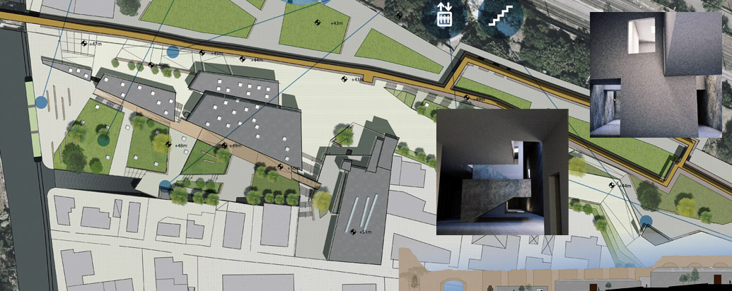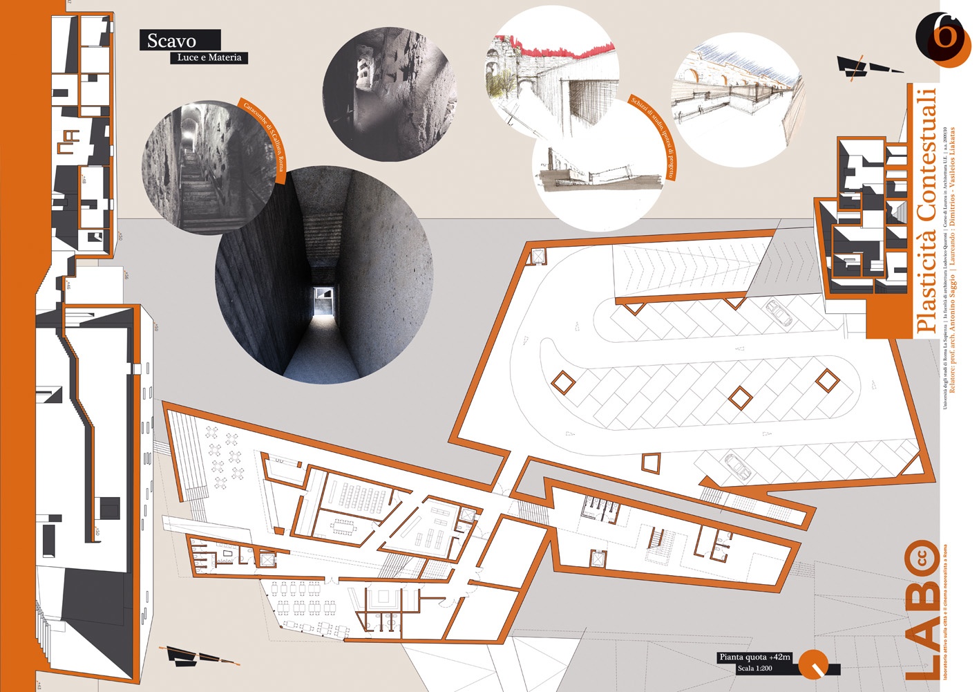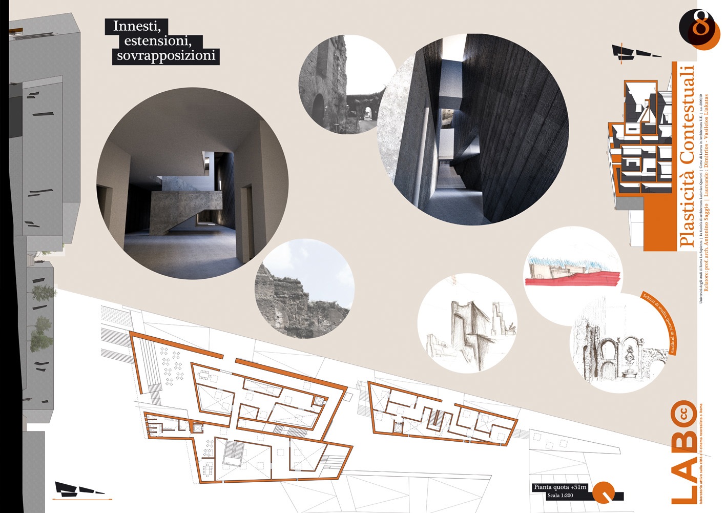 In una zona di Roma caratterizzata dall'intreccio di antichi acquedotti e dallo scavo del fosso della Marana, tra pressistenze archeologiche ed una edilizia spontanea accumulata negli scorsi decenni e oggi quasi fortificata nella sua stessa diversità, si incunea il Progetto del Labo: un Laboratorio per lo studio del Cinema neoralista a Roma. La zona del Mandrione infatti è fortemente legata all'immaginario neo realista e ben può accogliere una struttura con tali finalità. L'andamento planimetrico del progetto scava il terreno valorizzando il vecchio andamento del fosso della Marana e a questo si raffronta nell'andamento zigzagante. Gli spazi del Labo vivono di una voluta indifferenziazione tra interno ed esterno (uno dei temi cardine del neo realismo). Masse frammentarie aprano squarci e invitano a relazioni inaspettate, spesso caratterizzate da profondi coni di luce e ombra. Naturalmente il Labo innesta anche le relazioni e le tecnologie per un museo diffuso per la conoscenza dei luoghi e della cultura del neorealismo a Roma attraverso le moderne tecnologie. In particolare, collocandosi accanto alla Urban Green line, ne costituisce uno dei poli di arrivo, ma anche di ripartenza per la conoscenza dei luoghi del neorealismo in questa parte della città. Il Labo così diventa uno dei punti di attrazione della nostra Roma futura, apparentemente impossibile oggi, ma per noi necessaria comunque.