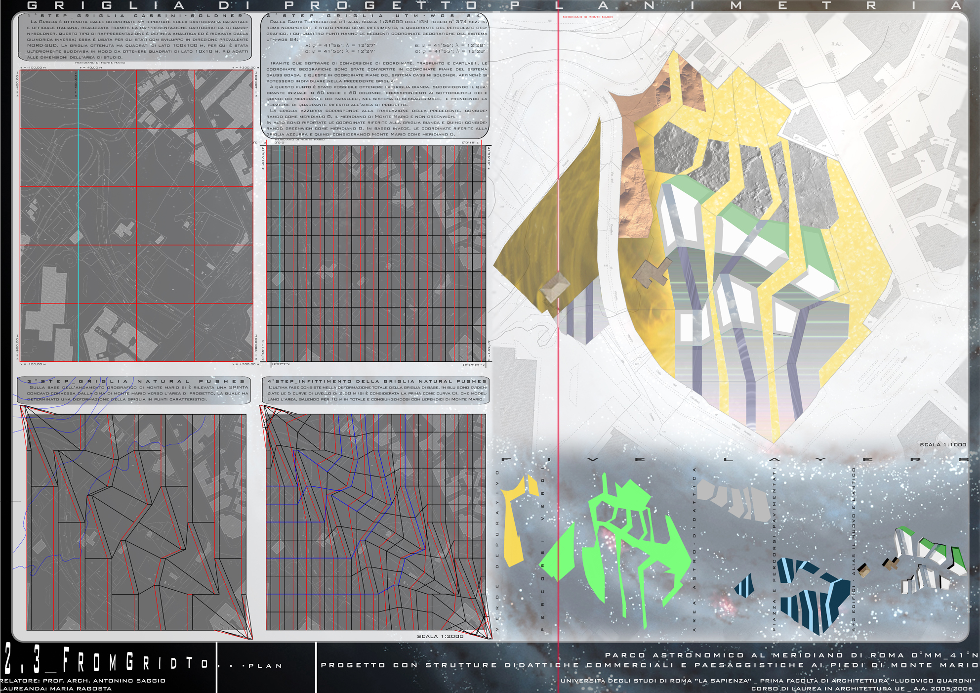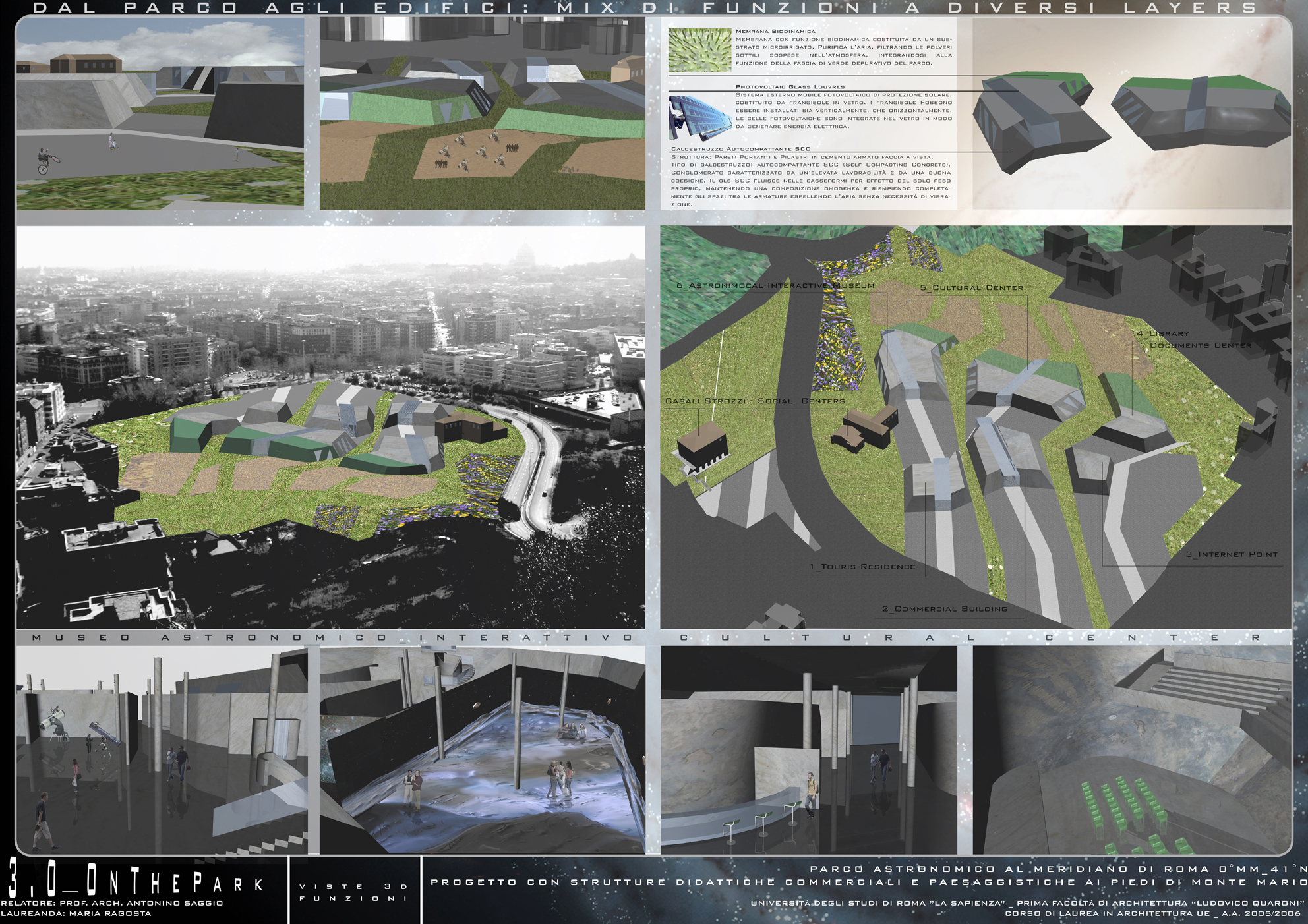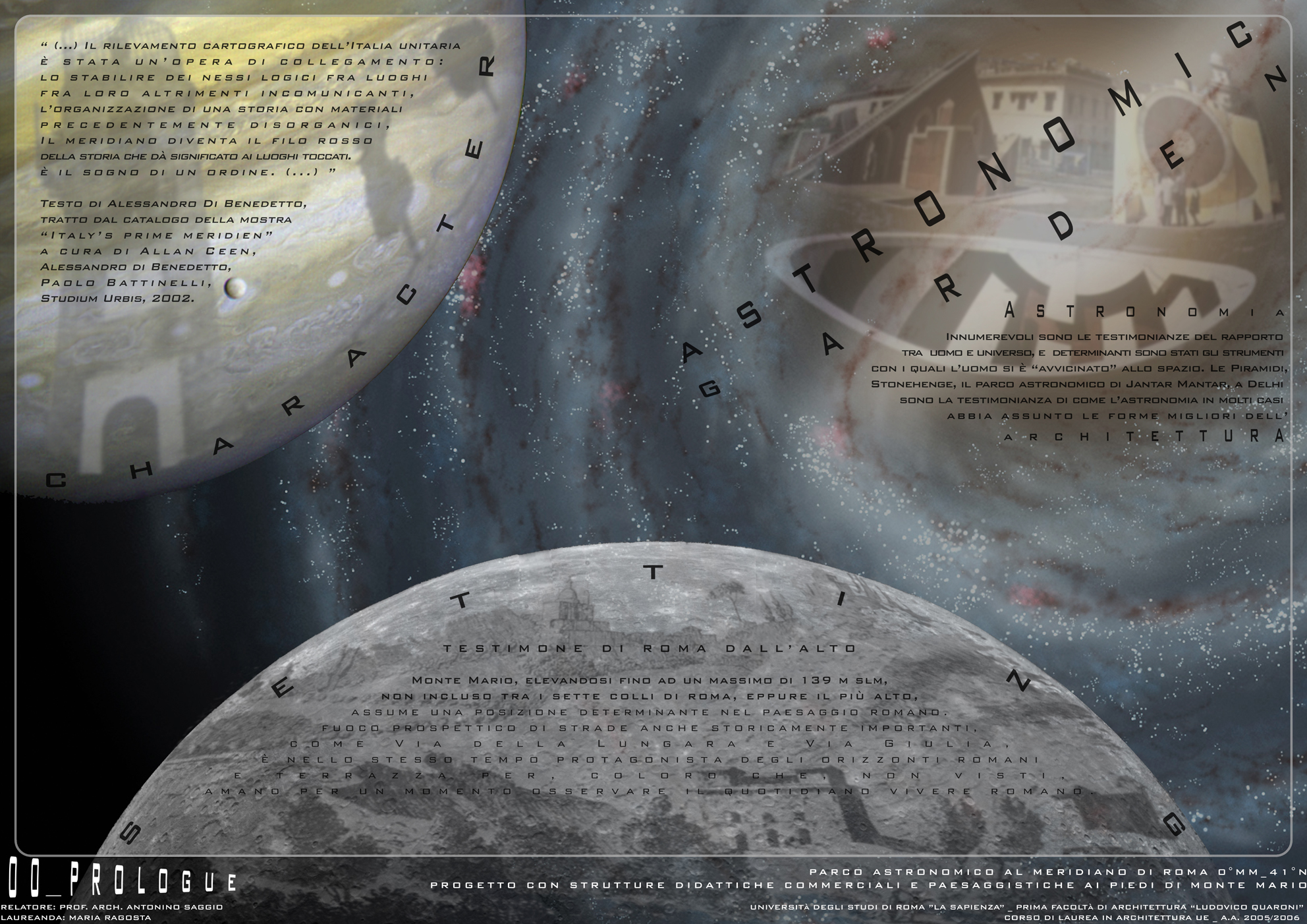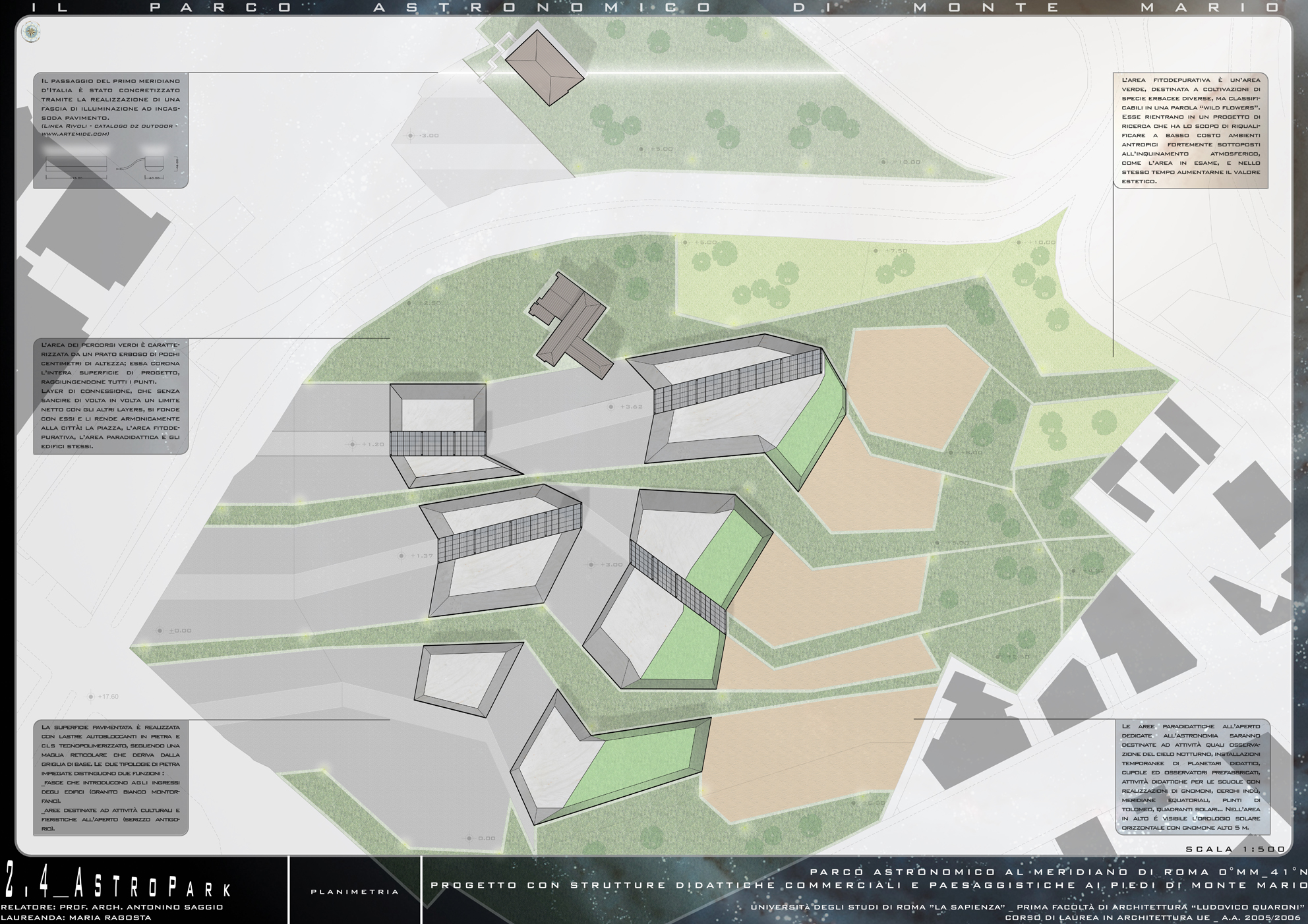Il progetto propone un parco astronomico localizzato alle pendici di Monte Mario in  un'area  cui è legata la storia dell'astronomia e della topografia italiana caratterizzata in un caso dall'osservatorio di Monte Mario e dall'altra dalla localizzazione del primo meridiano d'Italia. Il progetto propone un mix di attività che gravitano sulla funzione innovativa di parco astronomico urbano e che prevede strutture didattiche, commerciali e paesaggistiche. Il progetto si caratterizza per un innovativo, ma ampiamente condivisibile, programma d'uso e per un'organizzazione  architettonica dei corpi edilizi e degli spazi aperti realizzato attraverso un processo che evoca la formazione delle organizzazioni orografiche dei fenomeni naturali, ma anche le griglie e le giaciture di questa parte di città.