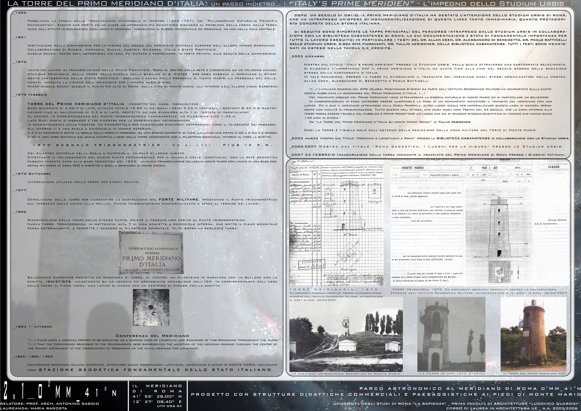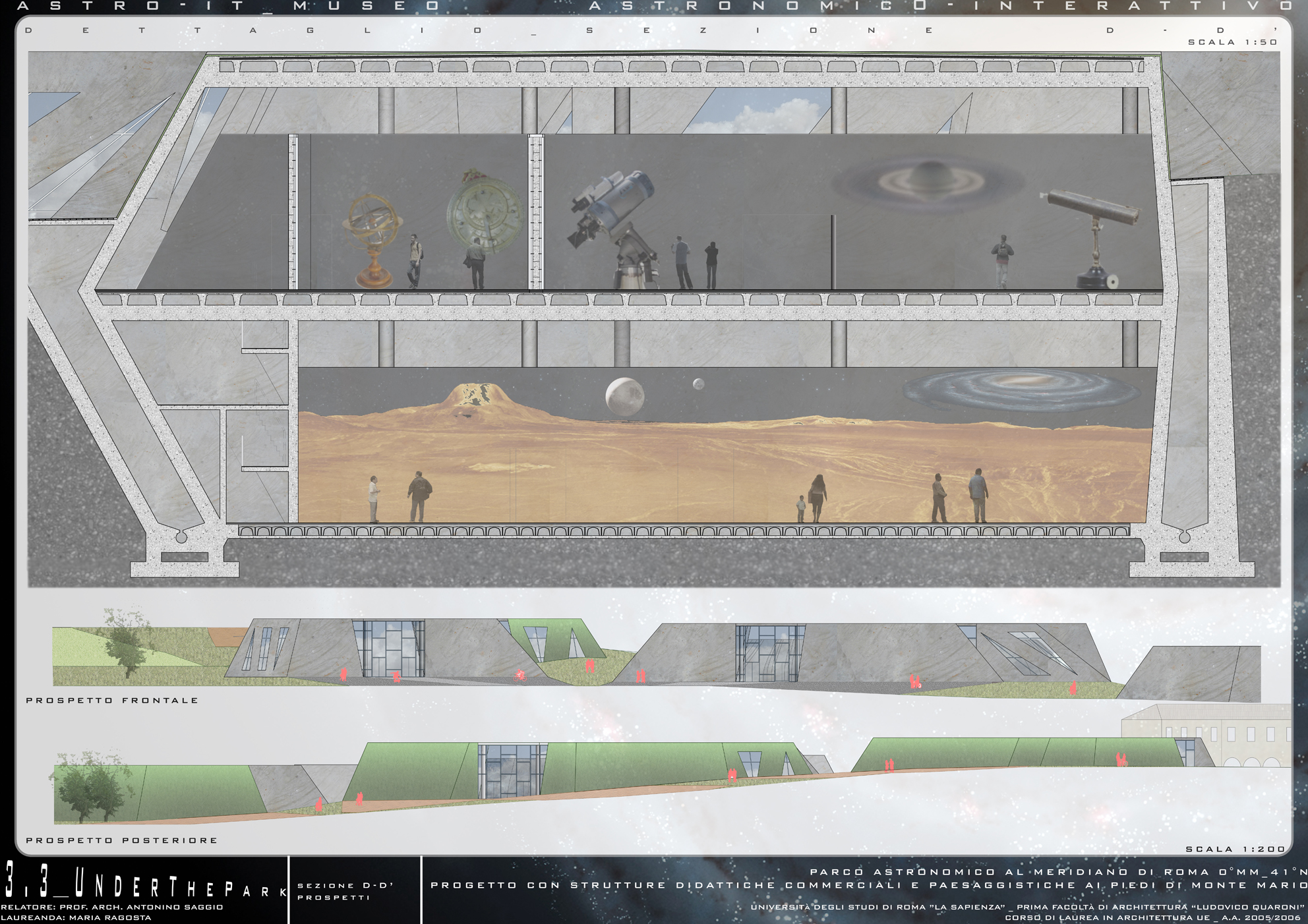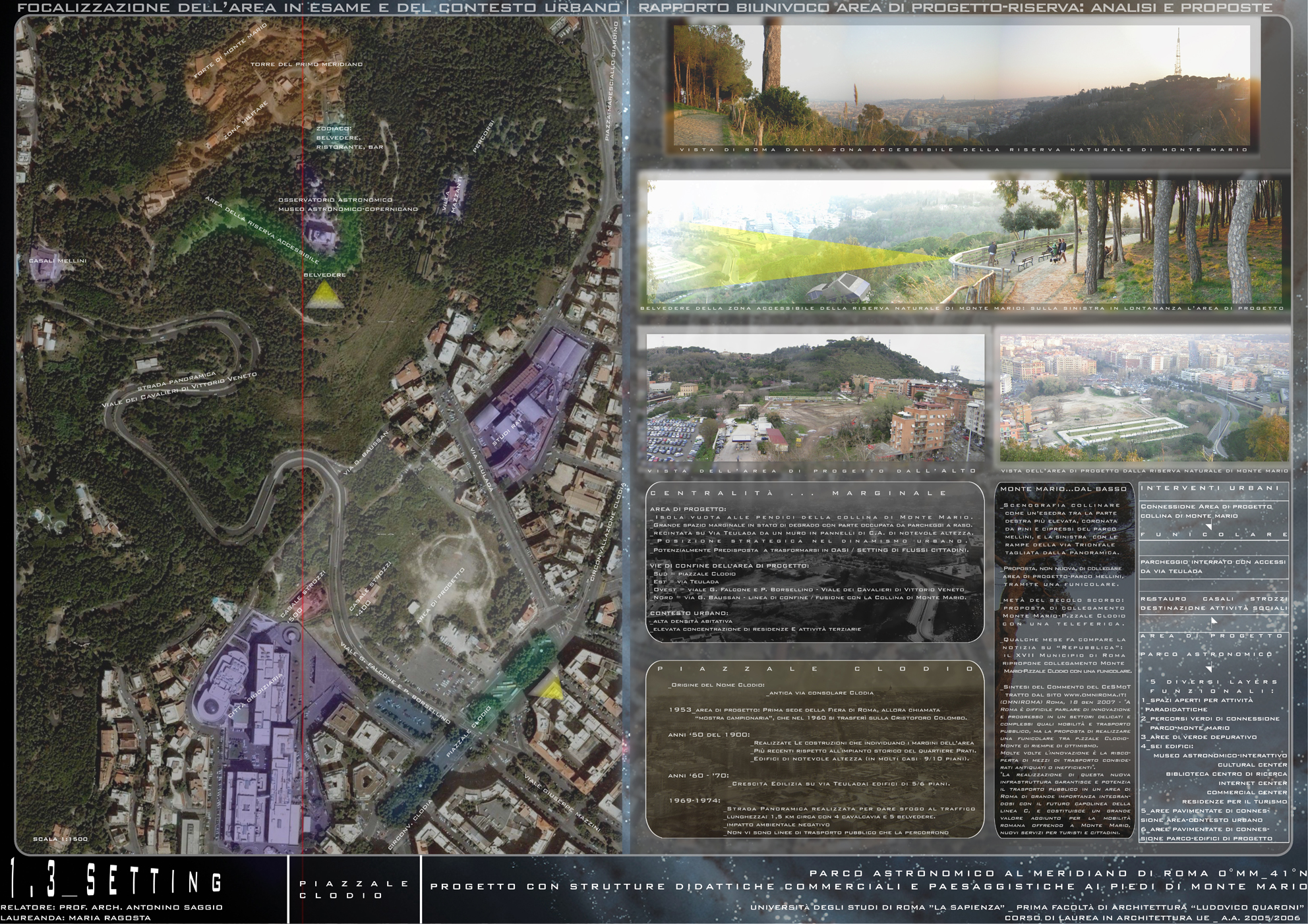 Il progetto propone un parco astronomico localizzato alle pendici di Monte Mario in  un'area  cui è legata la storia dell'astronomia e della topografia italiana caratterizzata in un caso dall'osservatorio di Monte Mario e dall'altra dalla localizzazione del primo meridiano d'Italia. Il progetto propone un mix di attività che gravitano sulla funzione innovativa di parco astronomico urbano e che prevede strutture didattiche, commerciali e paesaggistiche. Il progetto si caratterizza per un innovativo, ma ampiamente condivisibile, programma d'uso e per un'organizzazione  architettonica dei corpi edilizi e degli spazi aperti realizzato attraverso un processo che evoca la formazione delle organizzazioni orografiche dei fenomeni naturali, ma anche le griglie e le giaciture di questa parte di città.