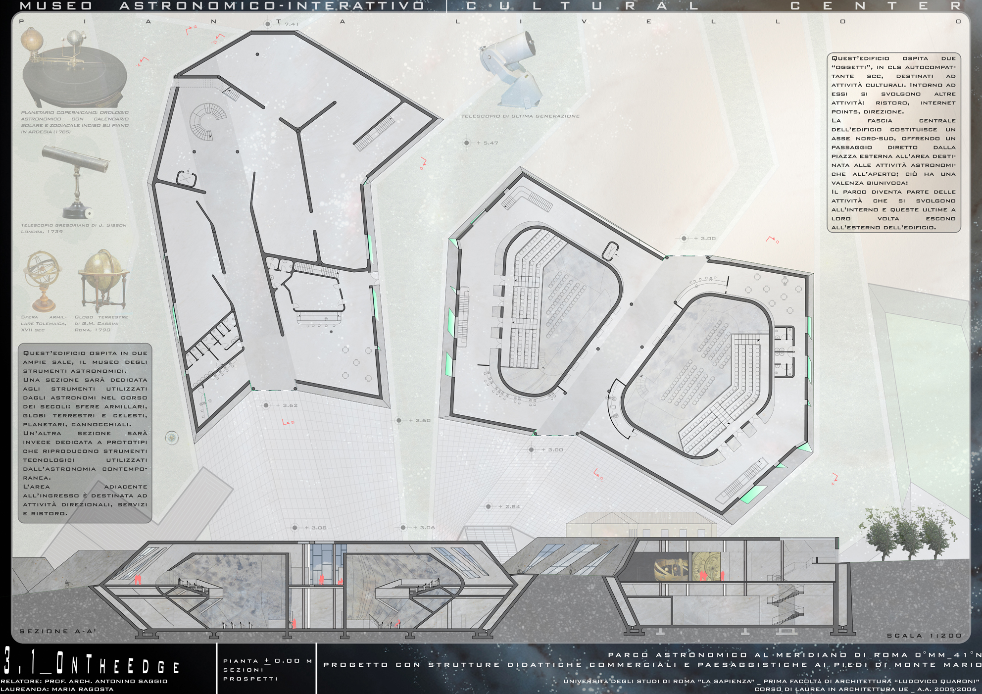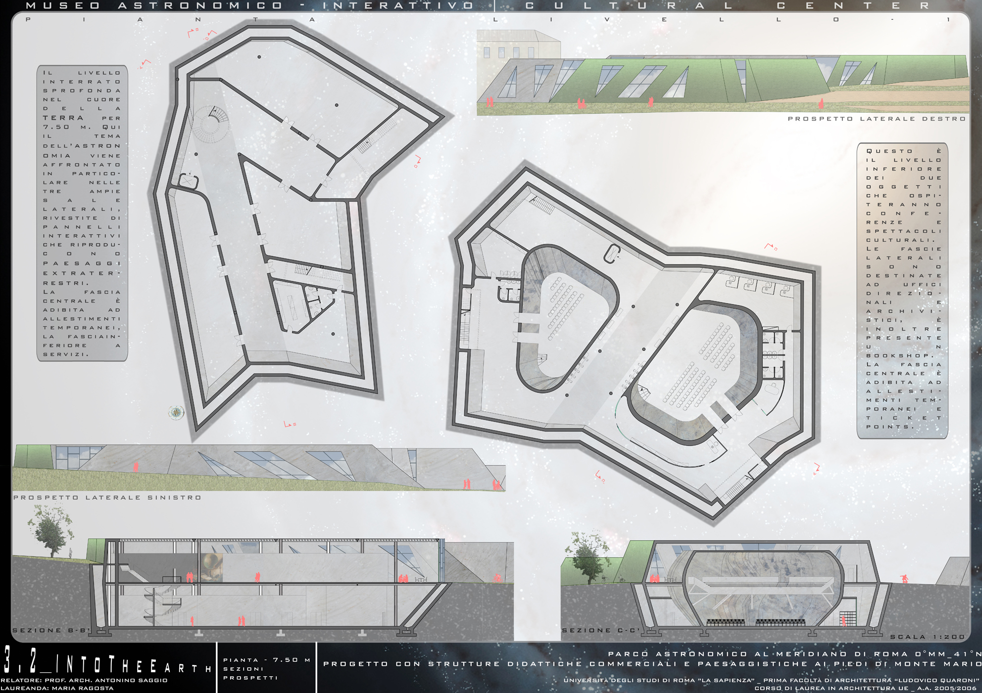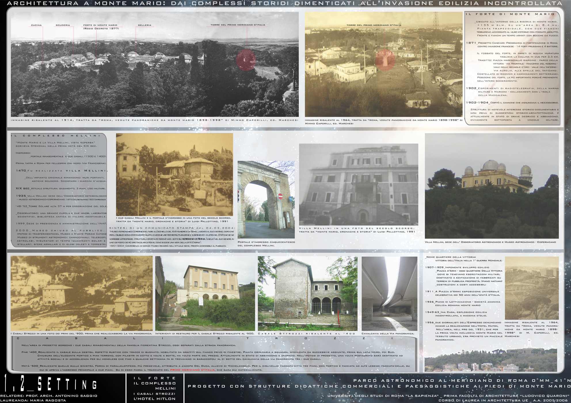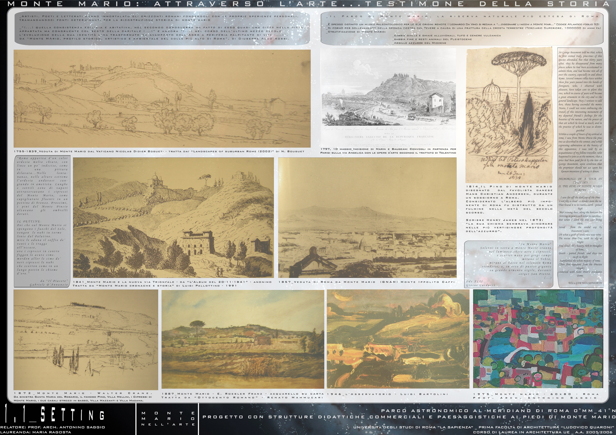 Il progetto propone un parco astronomico localizzato alle pendici di Monte Mario in  un'area  cui è legata la storia dell'astronomia e della topografia italiana caratterizzata in un caso dall'osservatorio di Monte Mario e dall'altra dalla localizzazione del primo meridiano d'Italia. Il progetto propone un mix di attività che gravitano sulla funzione innovativa di parco astronomico urbano e che prevede strutture didattiche, commerciali e paesaggistiche. Il progetto si caratterizza per un innovativo, ma ampiamente condivisibile, programma d'uso e per un'organizzazione  architettonica dei corpi edilizi e degli spazi aperti realizzato attraverso un processo che evoca la formazione delle organizzazioni orografiche dei fenomeni naturali, ma anche le griglie e le giaciture di questa parte di città.