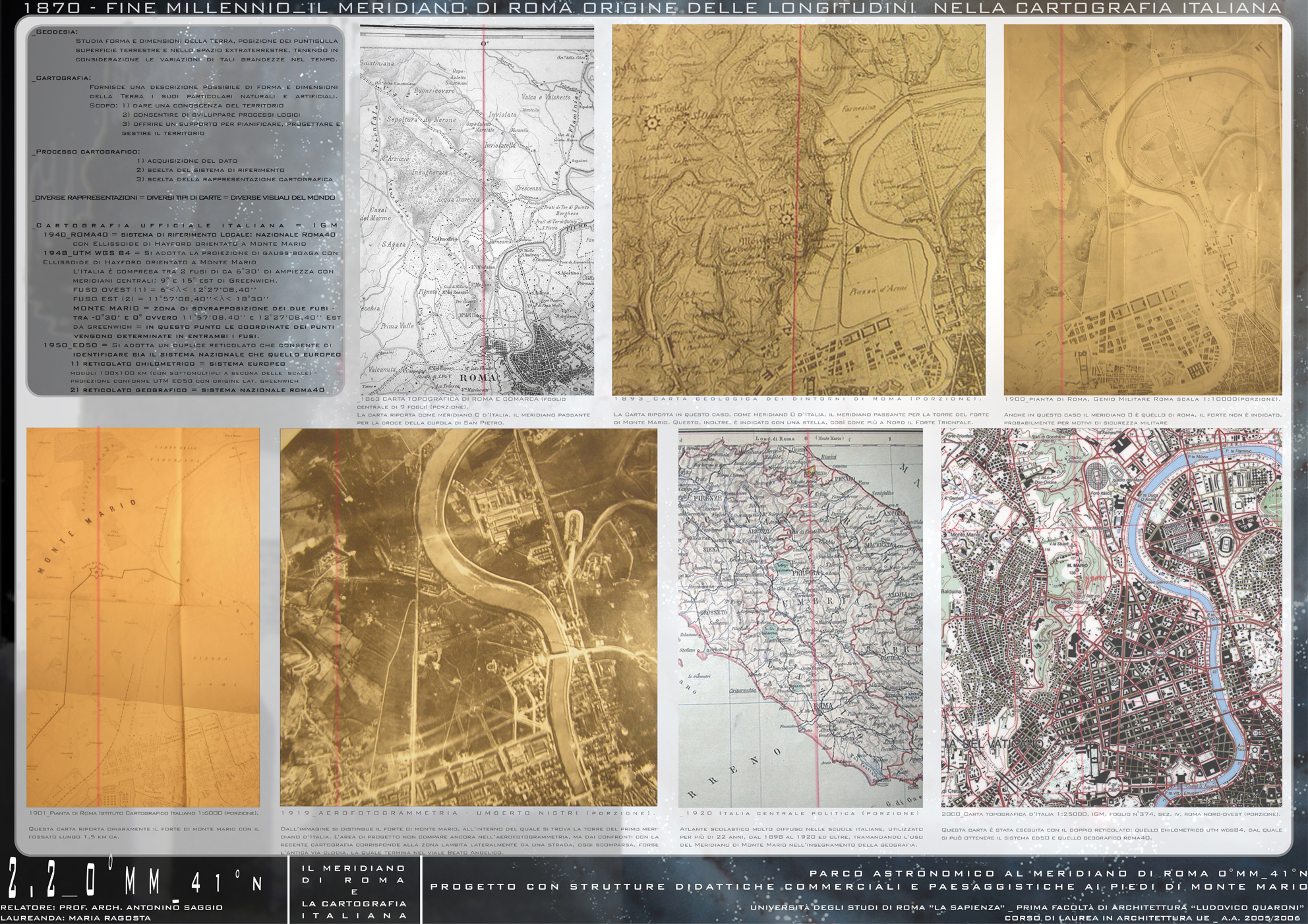 Le diverse cartografie, riportate in ordine cronologico dalla fine dell'800 ai giorni nostri, testimoniano l'importanza del meridiano di Roma nella redazione delle carte stesse, e nel rapporto tra i sistemi di rappresentazione cartografica locali, ovvero italiani e globali, ovvero europeo e mondiale.