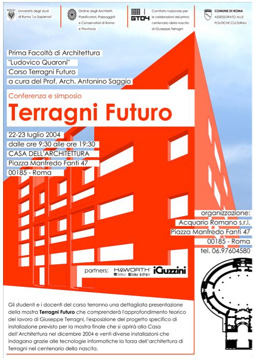 Il Corso di Progettazione Architettonica Assistita prima Facoltà di Architettura de La Sapienza ha tenuto i due giorni di presentazione finale presso La Casa dell'Architettura dell'Ordine degli Architetti di Roma. La ragione di questa scelta è duplice. Innanzitutto si sono resi noti gli esiti del Corso Caad 2004 del prof. Antonino Saggio in una forma di Conferenza pubblica aperta a tutti gli interessati. La seconda ragione ha riguardato la materia stessa dell'esposizione. Infatti nei due giorni di Conferenza sono stati simulati gli esiti, le spazialità, i contenuti della Mostra "Terragni Futuro" promossa dal Comitato Nazionale delle celebrazioni per il Centenario di Giuseppe Terragni e che si aprirà nella stessa Casa dell'Architettura nel dicembre 2004. Il pubblico è stato così immerso in venticinque diverse presentazioni preparate dagli ottanta studenti del Corso coadiuvati da cinque docenti. Innanzitutto è stato presentato il progetto generale d'allestimento già selezionato come vincitore lo scorso maggio, poi sono state illustrate le singole installazioni che saranno accolte entro l'allestimento generale.