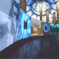 | La mente immagazzina suoni, immagini, impressioni, emozioni, come un data-base perfetto. Immaginiamo di poter avere a disposizione l'archivio di ricordi ed emozioni di Terragni, e di poter disporre le informazioni cronologicamente lungo un'ipersuperficie-tunnel anulare. Immaginiamo ora che l'utente, possa esplorarla, scansionarla, decodificare i dati in essa contenuti: l'utente è il decoder, l'occhio attivo che scruta il database/percorso, lo analizza, ne mette a fuoco le informazioni, e ne attiva/deforma la topologia con il proprio campo di forza. Nell'installazione il visitatore compie un viaggio spazio-temporale attraverso i momenti fondamentali della vita di Terragni, un percorso fatto di suggestioni sonore e visive, frammenti sfocati di storia e di immagini, bagliori di luce e echi di suoni lontani nello spazio e nella memoria. | ||||