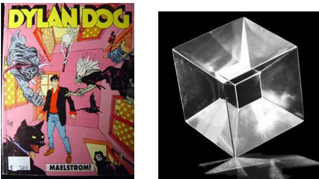 seguendo la sua lezione di oggi (12 maggio) mi è venuta in mente una storia di Dylan Dog, il mitico investigatore dell’incubo della Bonelli Editore nato dalla mente di Tiziano Sclavi. Nella storia in questione, n° 63 “Maelstrom!”, si narra di una porta, un gate d’accesso tra dimensioni diverse in questo caso tra il bene e il male. Questa porta, il Maelstrom (enunciato anche da Edgar Allan Poe ma sottoforma di mostruoso gorgo marino), si apre all’interno di un Ipercubo o Tesseract. Proprio il concetto di spazio tridimensionale è messo in discussione e il superamento di questo spazio è possibile solo attraverso un "salto”.