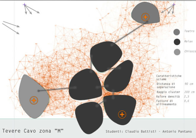 Il progetto Gravitational waves line è stato sviluppato all’interno del corso Itcaad 2013 del professor Saggio, con la collaborazione degli architetti Angelini e De Francesco. Il progetto ruota intorno all’idea di creare una costellazione di spazi pubblici di condivisione a contatto diretto con il Tevere. Questa urgenza è il primo input scatenante del progetto a cui viene associata una approfondita ricerca sulle mole che popolavano il Tevere nei secoli passati. |