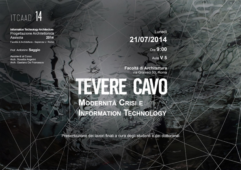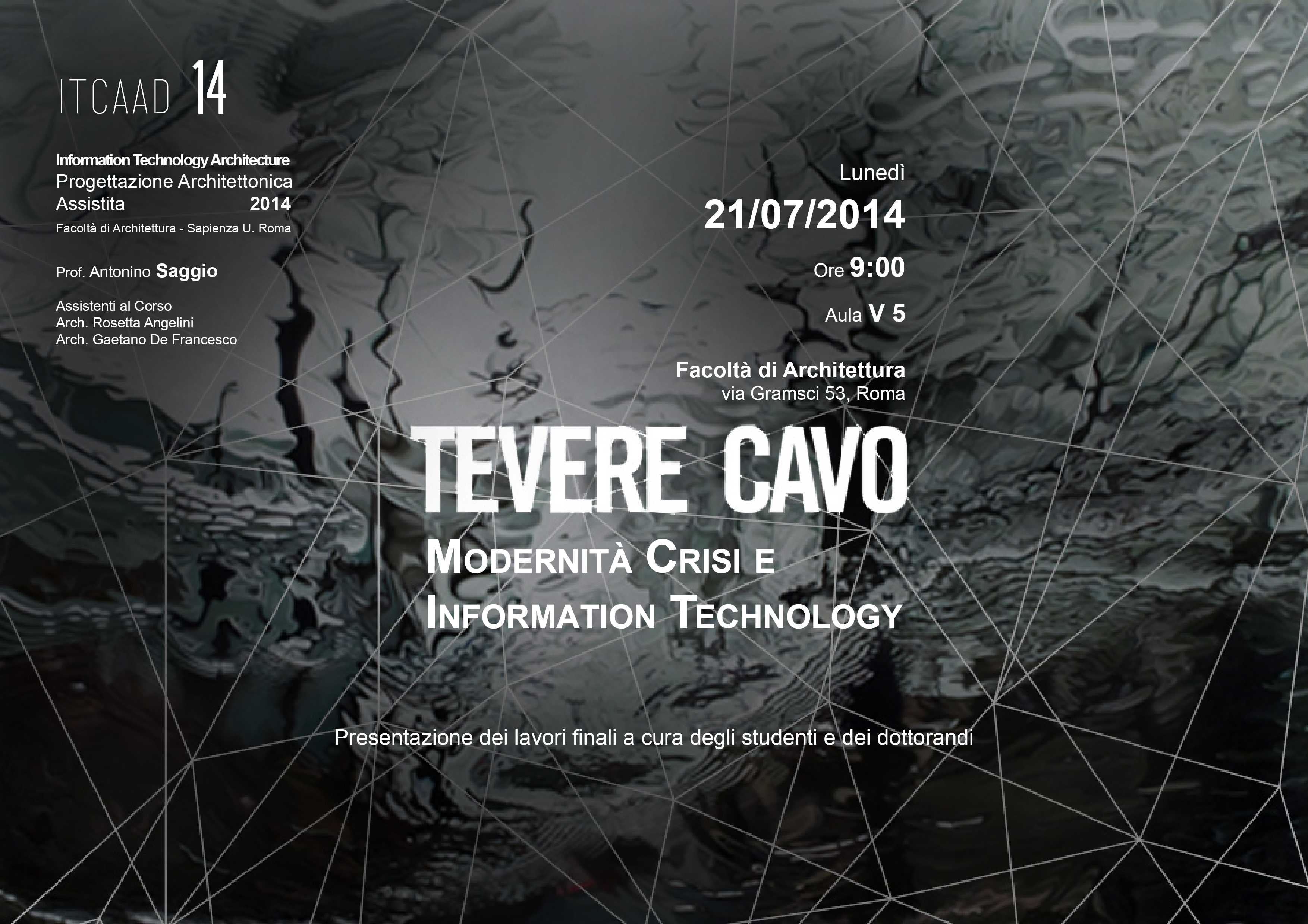 Il corso di Progettazione Architettonica Assistita V anno 8 crediti formativi, presenta una combinazione di aspetti teorici e di aspetti applicativi. Quelli teorici vertono sui rapporti che intercorrono tra Information Technology e Architettura in questa fase storica. Dal punto di vista applicativo gli studenti sono guidati attraverso dei tutorial e l'uso del laboratorio alla sperimentazione dei diversi ambienti informatici e alla comprensione delle diverse possibilità operative. Il percorso si svolge gradualmente in otto cicli tematici che vanno dal "Mondo dei Raster" a quello "dei Modificatori". Ciascun ciclo offre delle lezioni sul suo contesto teorico, su quello informatico e applicativo e sui paralleli sviluppi nella ricerca architettonica contemporanea. Alla fine di ciascun ciclo, gli studenti redigono una specifica eserticitazione pratica. Tutte le esercitazioni dalle prime a quella finale sono guidate da uno stesso tema di ricerca che quest'anno è definito dal titolo del corso: "Tevere Cavo. Modernità, Crisi e Information Technology" e i cui risvolti saranno gradualmente illustrati agli studenti a cominicare dalla prolusione. Il corso, che ha obbligo di frequenza e richiede almeno in alcune fasei il possesso di un personal computer portatile, inizia il giorno 24 febbraio 2014 e termina con una seduta di esami che è anche una conferenza pubblica il giorno 21 luglio 2014.