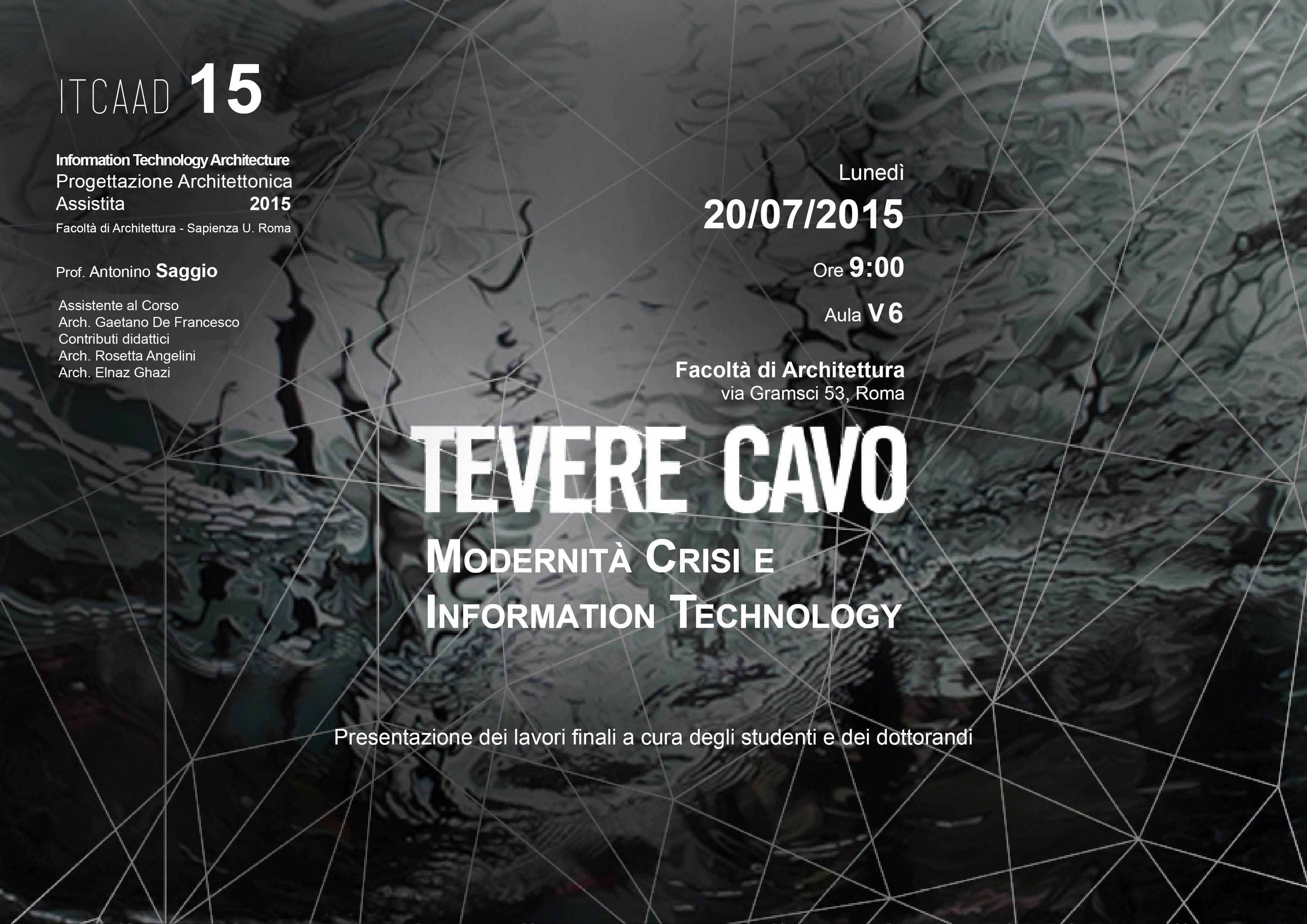 Il corso di Progettazione Architettonica Assistita V anno, presenta una combinazione di aspetti teorici e di aspetti applicativi. Quelli teorici vertono sui rapporti che intercorrono tra Information Technology e Architettura in questa fase storica. Dal punto di vista applicativo gli studenti sono guidati attraverso dei tutorial alla sperimentazione dei diversi ambienti informatici e alla comprensione delle diverse possibilità operative. Il percorso si svolge gradualmente in otto cicli tematici che vanno dal "Mondo dei Raster" a quello "dei Modificatori". Ciascun ciclo offre delle lezioni sul contesto teorico, su quello informatico e applicativo e sui paralleli sviluppi nella ricerca architettonica contemporanea. Alla fine di ciascun ciclo, gli studenti redigono una specifica eserticitazione pratica. Tutte le esercitazioni dalle prime a quella finale sono guidate da uno stesso tema di ricerca che quest'anno è definito dal titolo del corso: "Tevere Cavo. Modernità, Crisi e Information Technology" e i cui risvolti saranno gradualmente illustrati agli studenti a cominicare dalla prolusione. Il corso, che ha obbligo di frequenza e richiede almeno in alcune fasi il possesso di un personal computer portatile, inizia il giorno 23 febbraio 2015 e termina con due seduta di esame, una orale il giorno 1 luglio 2015 e una con presentazione in un format di conferenza pubblica il giorno 20 luglio 2015.