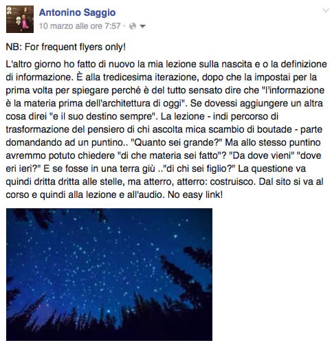 ""l'informazione è la materia prima dell'architettura di oggi". Se dovessi aggiungere un altra cosa direi "e il suo destino sempre". La lezione - indi percorso di trasformazione del pensiero di chi ascolta mica scambio di boutade - parte domandando ad un puntino.. "Quanto sei grande?" Ma allo stesso puntino avremmo potuto chiedere "di che materia sei fatto"? "Da dove vieni" "dove eri ieri?" E se fosse in una terra giù .."di chi sei figlio?""