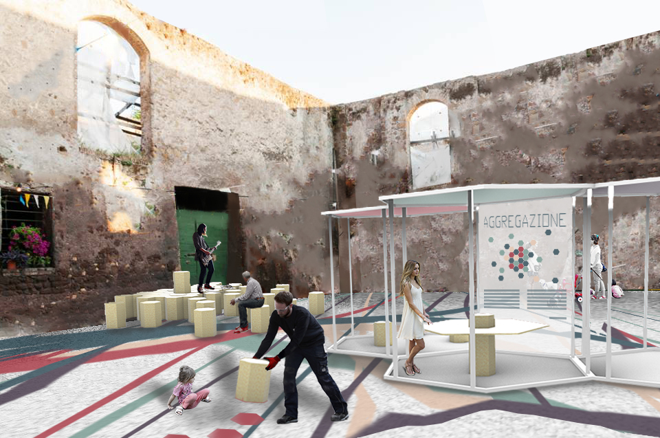 Le informazioni passive non rimangono impresse… per cercare di cambiare questa realtà abbiamo pensato ad una istallazione attiva: questa nasce e si trasforma solo grazie alle persone. Un enorme foglio bianco diventa la tela di tutti coloro che vogliono prendere parte a questo progetto, dipingendo e divertendosi attivano non solo un processo di trasformazione dell’opera ma accendono l’informazione! Grandi scheletri esagonali costruiscono uno spazio sempre nuovo. Alcuni potrebbero avere un lato chiuso da un pannello informativo, che illustrerà una delle diverse problematiche che abbiamo rilevato all’interno del quartiere, e degli oggetti che cerchino di risolverlo al livello “micro”. Altri verranno lasciati completamente liberi. Tutti però, se spostati, coloreranno la tela su cui si posano. Piccoli esagoni, invece, saranno gli oggetti di scena di questa istallazione: sono in grado di diventare sedute, se uniti possono costituire un tavolino o un palco, possono essere un’istallazione artistica o, addirittura, un landscape. E infine anche loro saranno in grado di colorare la tela che fa da pavimentazione a tutta l’opera, grazie a grandi cuscinetti imbevuti di inchiostro colorato che trasformeranno questi elementi in timbri..http://mirkosciarroni.altervista.org/unlostline.html