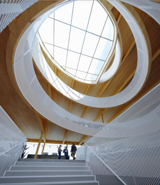 E' un'evocazione dovuta alla forma organico astratta di questo showroom-deposito per legno; un progetto un po' datato di Baumschlager&Eberl che si pone, un po' come il museo del mare di Piano ad Amsterdam, in un periodo di trasizione tra ciò che è meramente funzionale e la forma rappresentativa di un luogo o di una comunità. Esso presenta un sistema organizzativo più vicino ad un' edilizia industriale che a una forma libera, funzionale allo scopo cui è preposta ma già elabora delle soluzioni, anche se ancora solo epidermiche,  di "pubblicizzazione" di se stessa; mostra nelle rifiniture esterne quella precisione del lavoro artigianale, allusione alle tecniche manuali locali, che si offre come servizio in questo edificio, fungendo così come qualcosa di più di un particolare puramente decorativo.