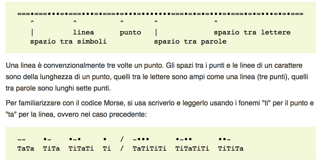 "Tuttavia, a differenza dei moderni codici binari che usano solo due simboli (comunemente rappresentati con 0 e 1), il Morse ne usa quattro: punto seguito da un intervallo intersimbolo (• ), linea seguita da un intervallo intersimbolo (— ), intervallo corto (tra lettere) e intervallo lungo (tra parole) " wikipidia