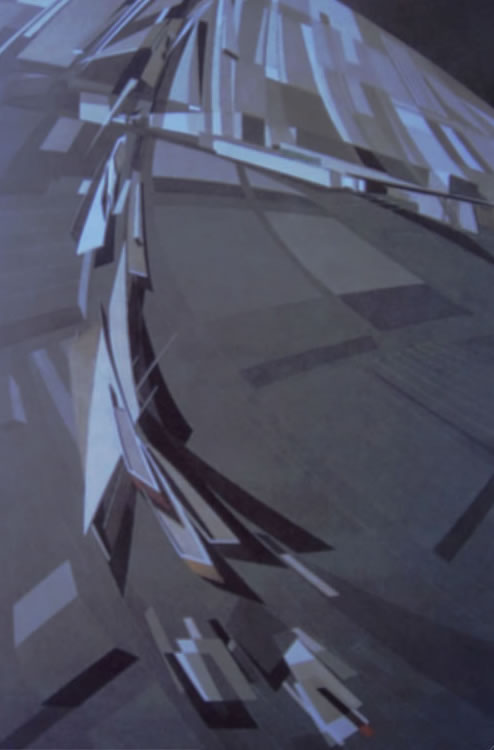 ...La casa da una parte usa la nuova ricerca sul volume e sui materiali (emergono due tessiture: una vetrata con montanti molto ravvicinati come una serra e una seconda invece monolitica che si intreccia sovrapponendosi alla prima) dall’altra manifesta una intenzione di radicarsi alla profondità. Il progetto, sfrutta l’antico interesse per le geometrie ad “L” muovendole però su tre dimensioni, sovrapponendole e ruotandole a spirale con la figura dell’elica o meglio, bisognerebbe dire, della trivella.