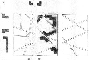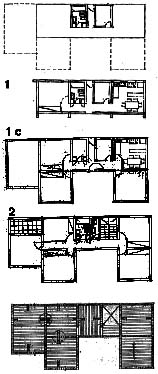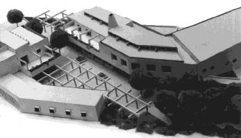 | Una nuova piazza viene creata a metà del suo sviluppo in connessione a una strada che collega una area periferica della cittadina. Attorno a questa piazza Louro (cfr. pp. 10, 2, 8, 28) dispone le parti maggiormente pubbliche della sua Scuola di arti e mestieri che gravitano su un teatro all'aperto. Il linguaggio è di derivazione organica con tetti spioventi | e rilassanti cavi d'ombra, le strutture di copertura del teatro e quella modulare del campo di gioco sono studiate al dettaglio. Pires (pp. 11, 3, 28) si concentra invece sull'attrezzattura scolastica propriamente detta organizzata attorno a una corte fluida e armoniosa. Lo spazio collettivo della scuola è attentamente relazionato al resto del | ||||||||