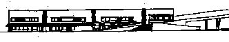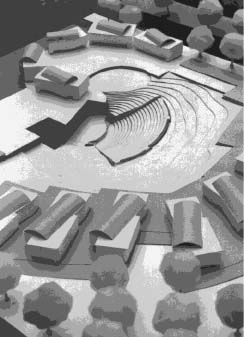 | naturalistici, progetta un insieme commerciale e ricreativo. Il centro è contraddistinto da un cavea all'aperto a cui si arriva da un lato da un sistema di piccoli padiglioni commerciali e dall'altro da una piazza a forma di C. Lo studio dei padiglioni commerciali è sviluppato attraverso due geometrie | ||||||||