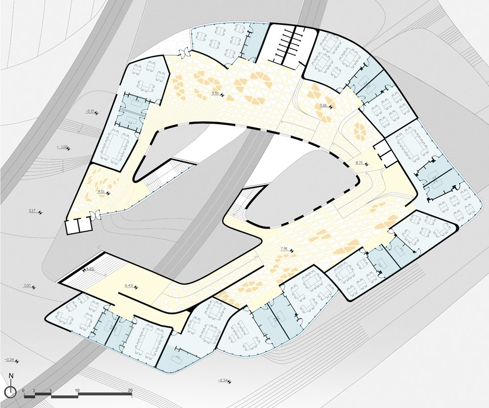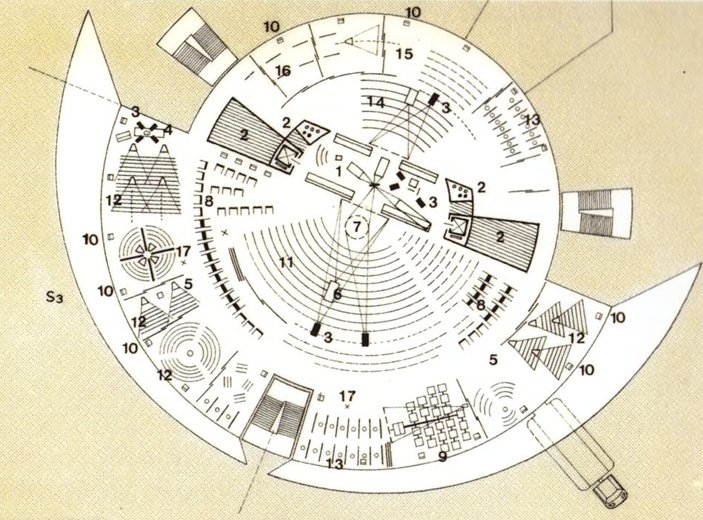2. Takis Zenetos, Scuola di Agios Dimitrios, presso Atene, 1969-1974, Pianta del piano terra, (immagine tratta da Papalexopoulos Dimitris; Kalafati Eleni, Takis Zenetos, Visioni digitali, architetture costruite, Edilstampa, Roma, 2006, p. 77 (collana The IT Revolution in Architecture, 4))