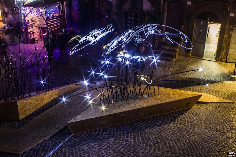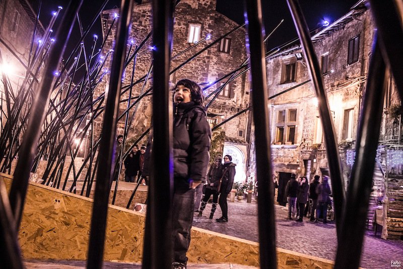 L’odore della legna arsa nei camini. La pietra scura delle case basse. La piazza al crepuscolo poco prima dell’inaugurazione. Ronciglione si è ritrovata qui, nella sua parte antica. Un centinaio di persone riempie ogni angolo. Ma i bambini non possono aspettare un via ufficiale. Cominciano a correre sulla pedana creando i primi effetti di luce. I genitori li seguono. E’ un gioco. E’ la festa di una comunità che si riscopre attiva.
