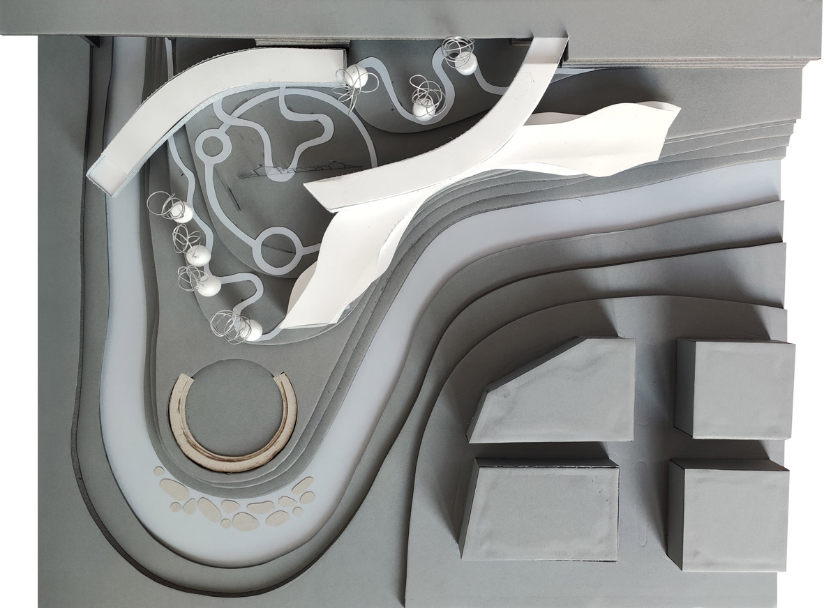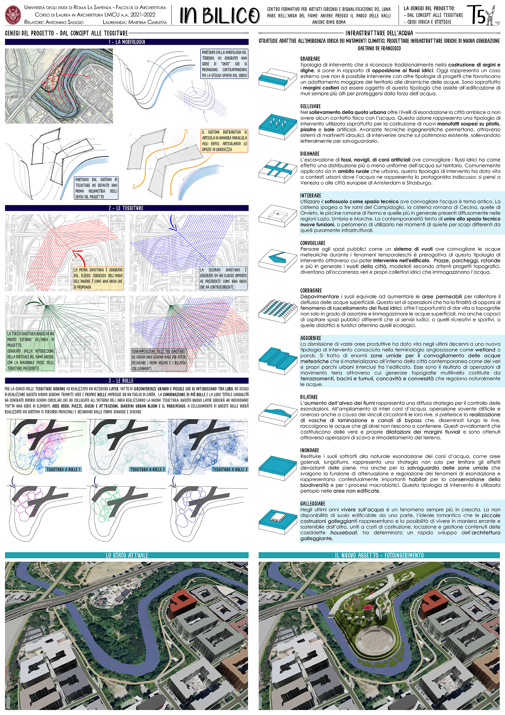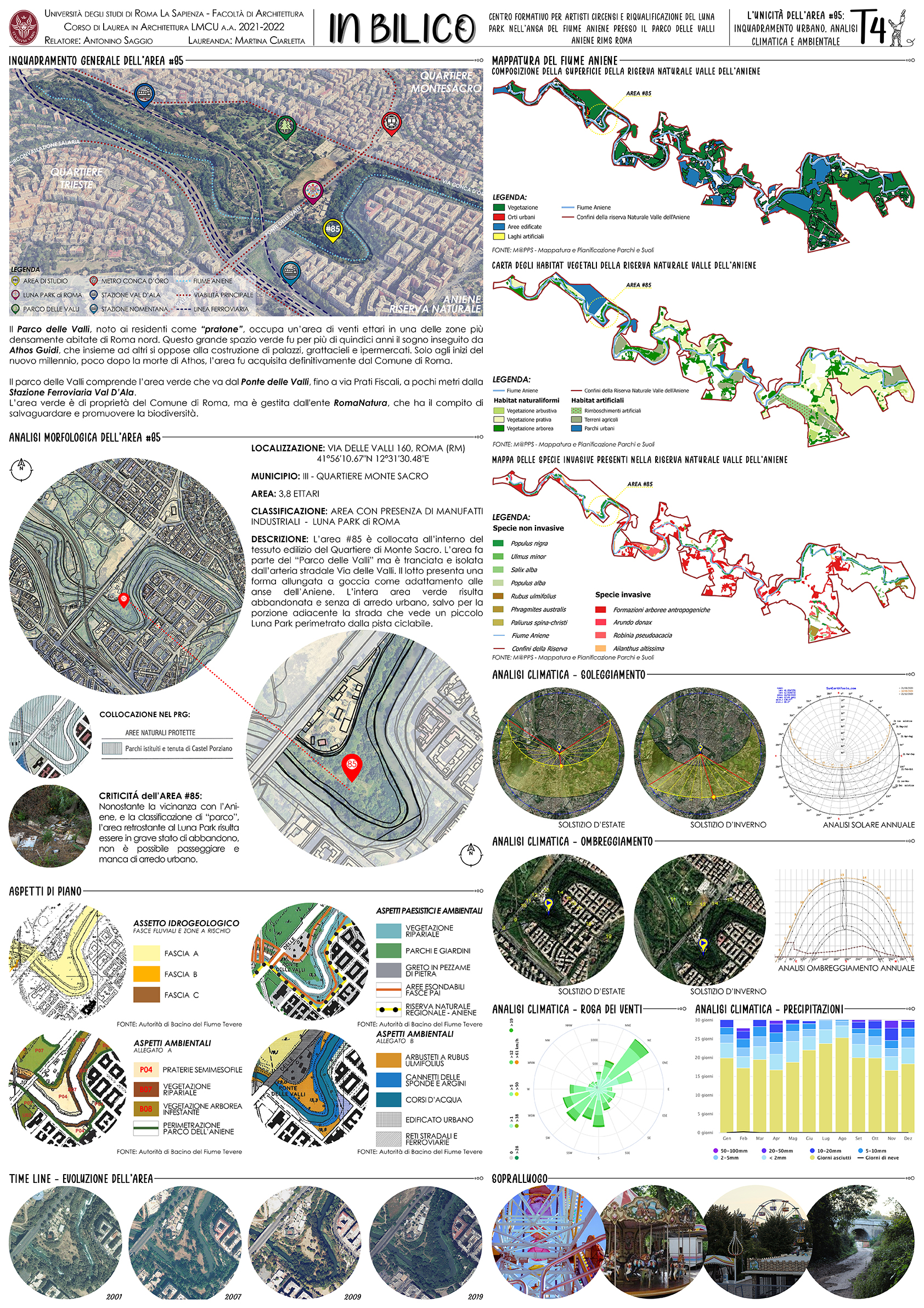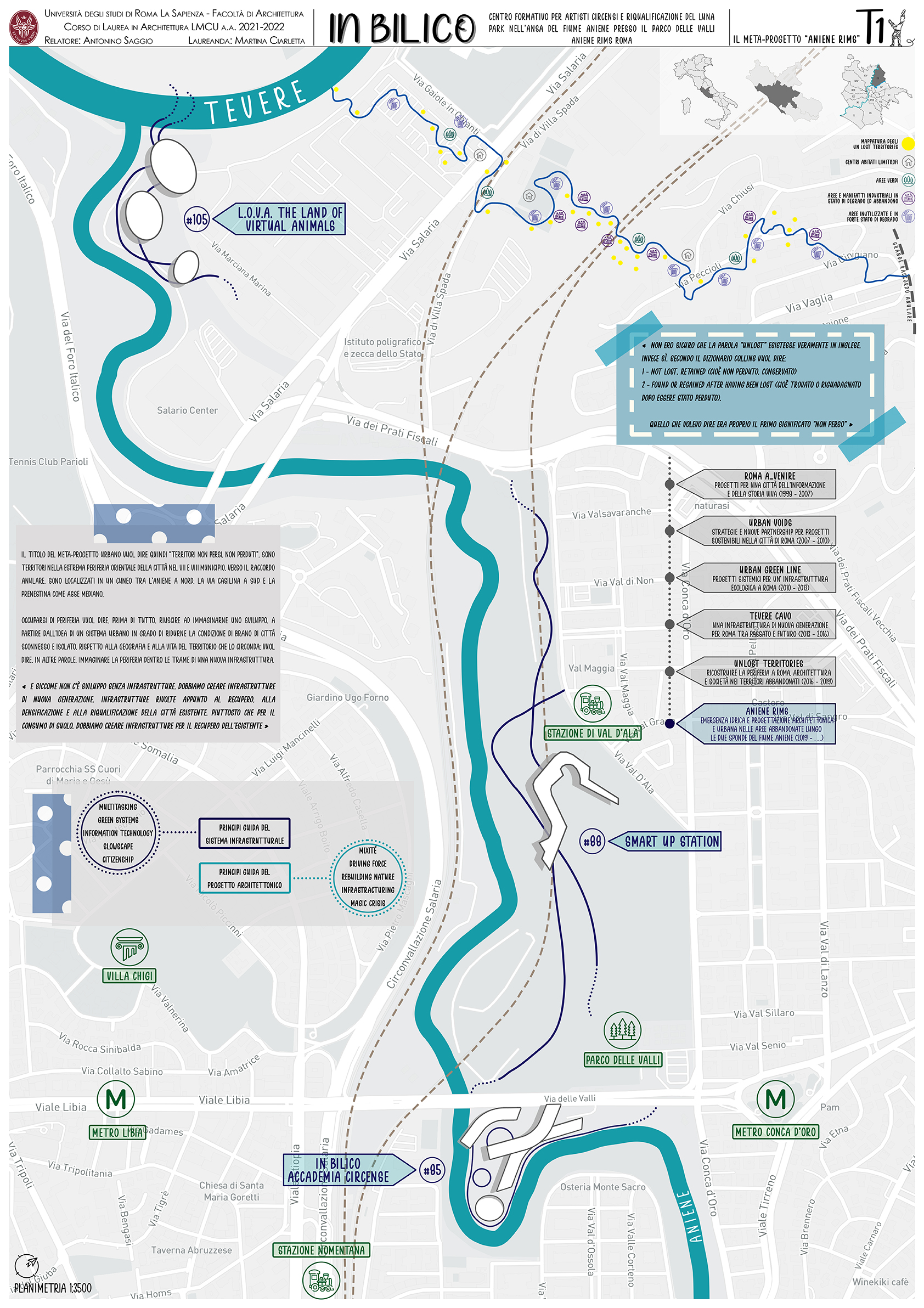 Elemento fondamentale è la scelta dell'area di progetto, un’ansa del fiume Aniene dalla forma a goccia completamente nascosta alla città. Siamo nei pressi della Metro B Conca d'Oro, all'altezza del Cavalcavia delle Valli. Qui è situato un piccolo Luna Park a conduzione familiare dal 1973, il resto dell'area è inaccessibile è in forte stato di degrado.