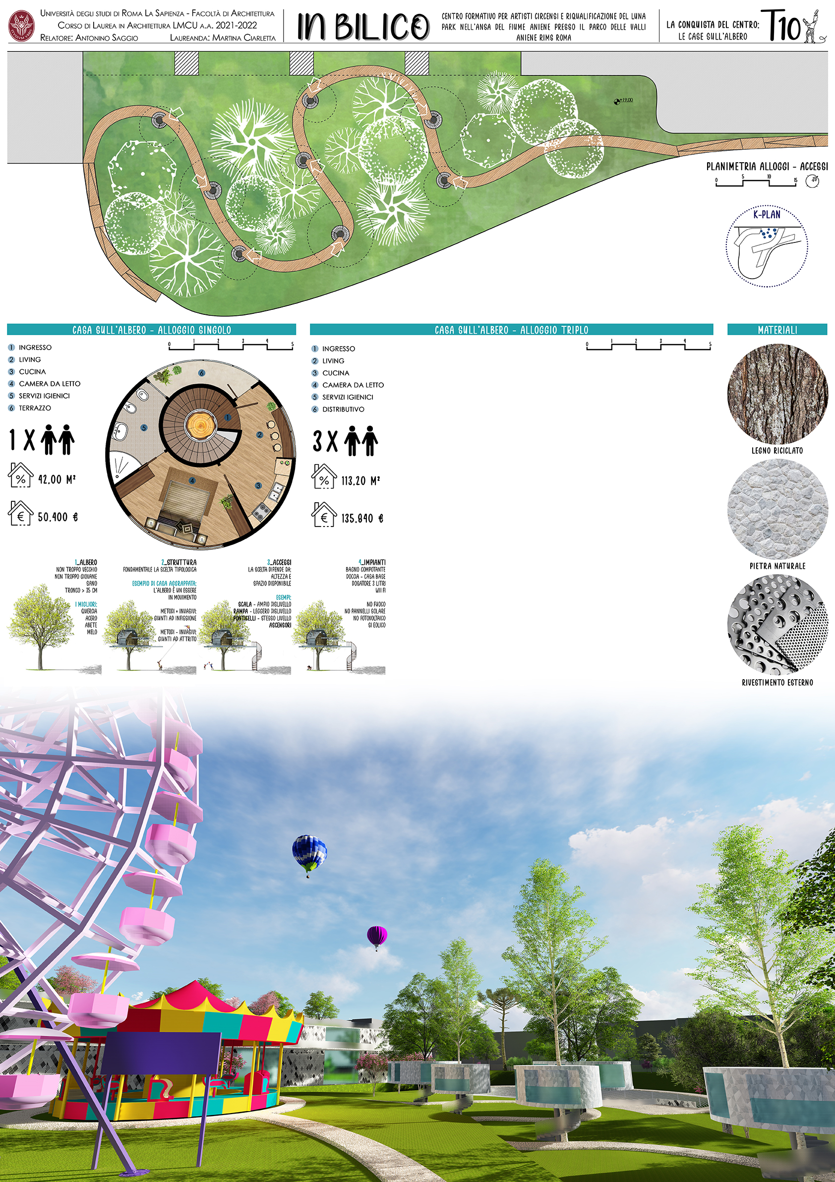Nel progetto immersi nel verde sono disposte una serie di "Case albero" di diversa superficie che possono ospitare gli allievi dell'Accademia circense, gli artisti e i docenti anche con famiglie.