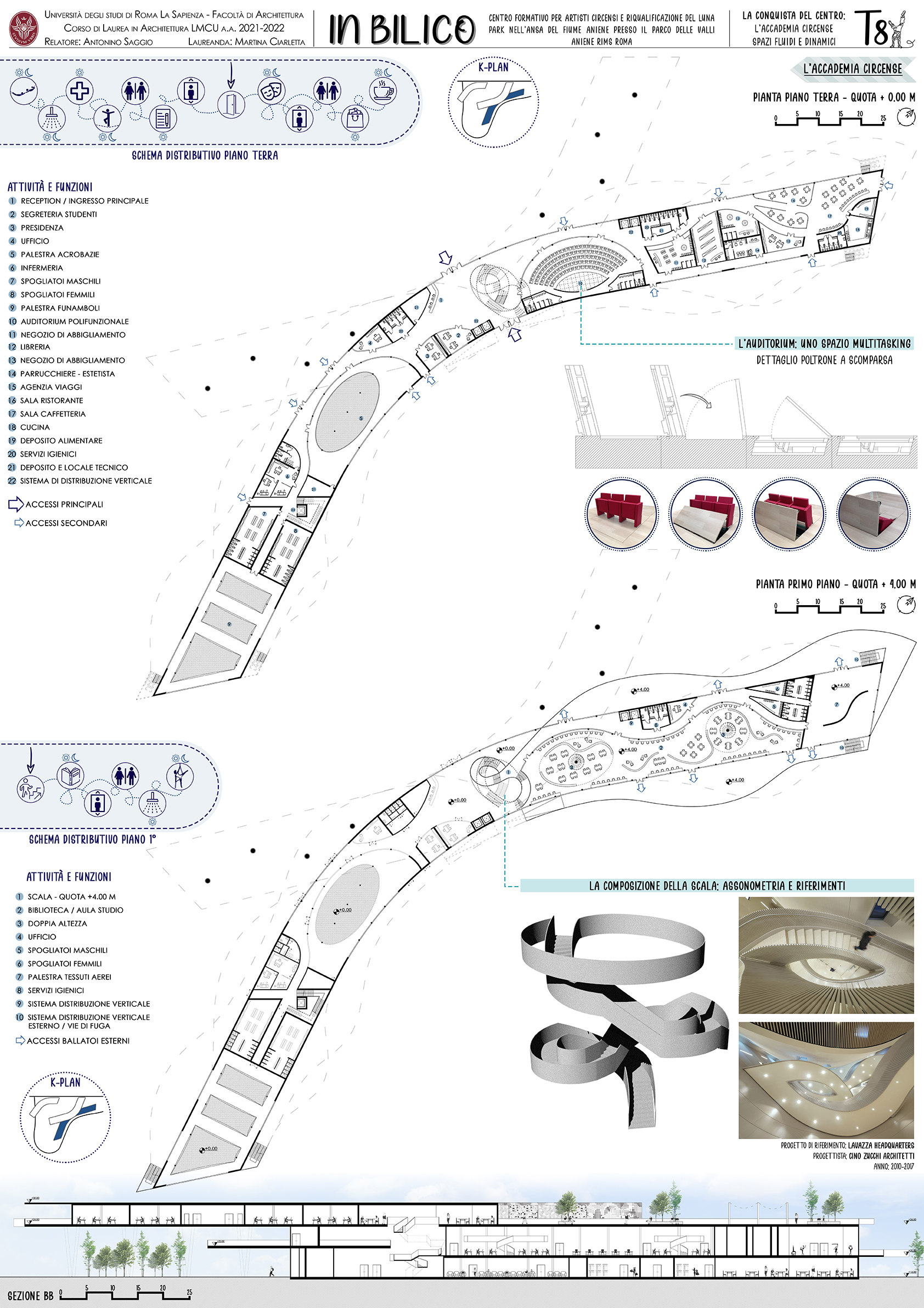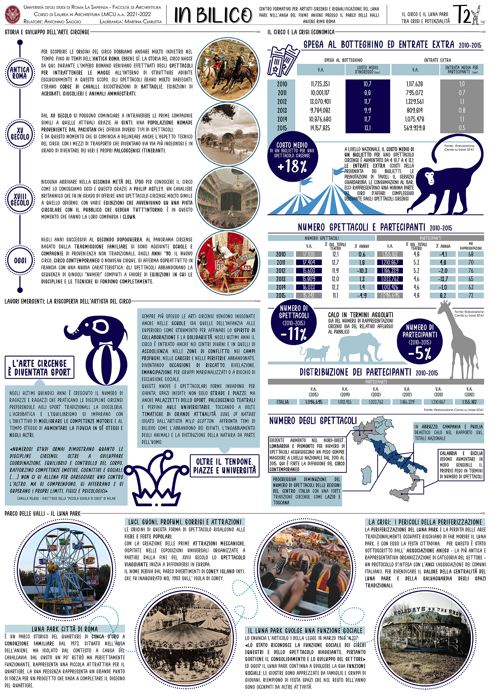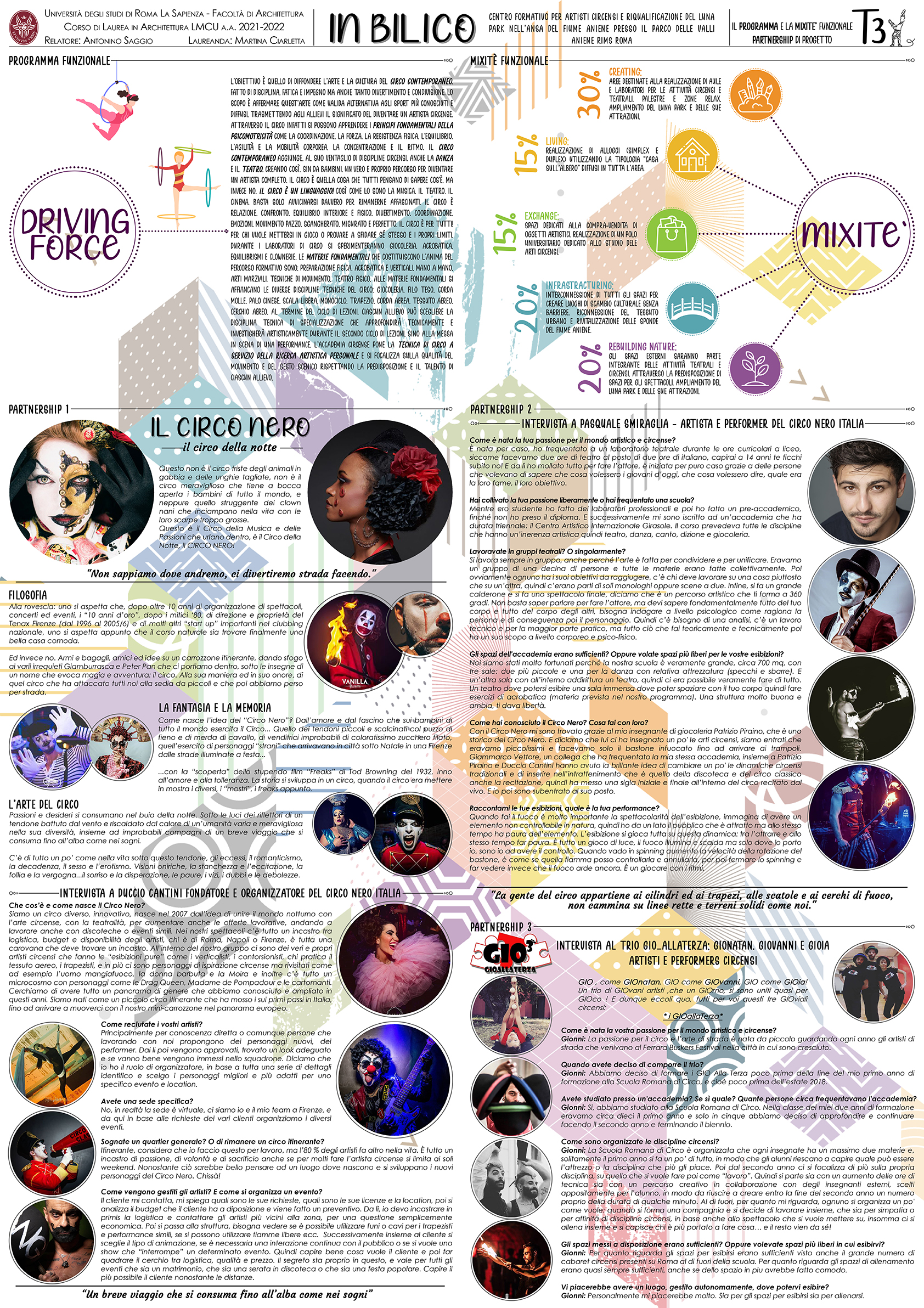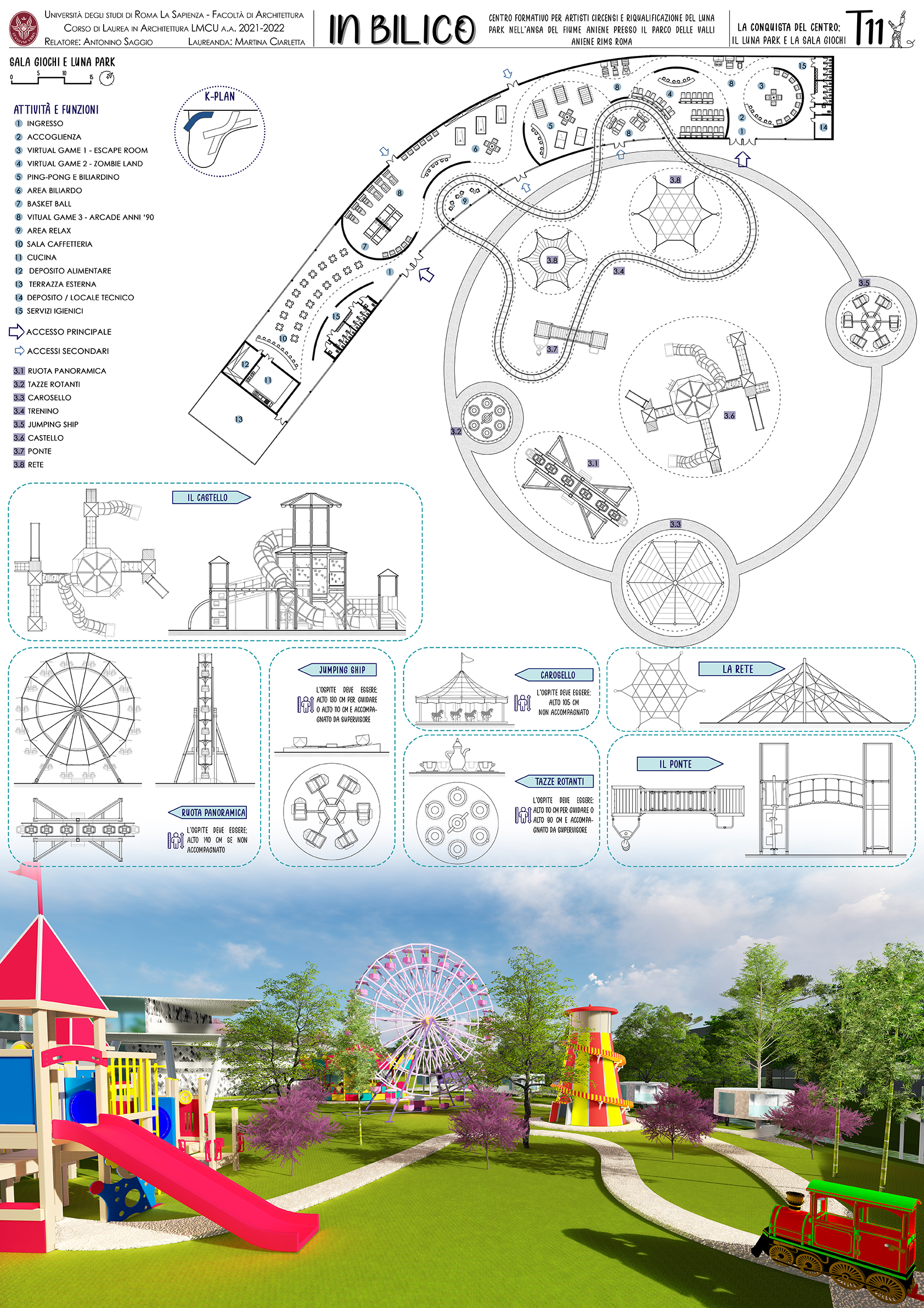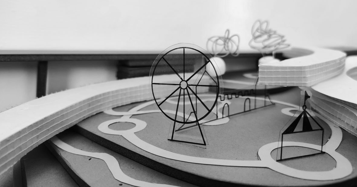 “In Bilico” è un progetto che prevede la realizzazione di un’accademia circense e la riqualificazione del Luna Park adiacente. La scelta di questo tema nasce per rispondere a diverse necessità: da un lato si vuole ripotare in auge l’antica arte del circo, con i suoi colori e profumi, e per contrastare la forte crisi economica (dovuta anche alla pandemia) che negli ultimi anni sta colpendo questa professione. Inoltre, l’arte circense si muove nello spazio, lo assorbe e lo trasforma, il circo è in continua evoluzione, e per questo ha bisogno di spazi sempre nuovi e mutevoli cui il progetto tenta di rispondere.