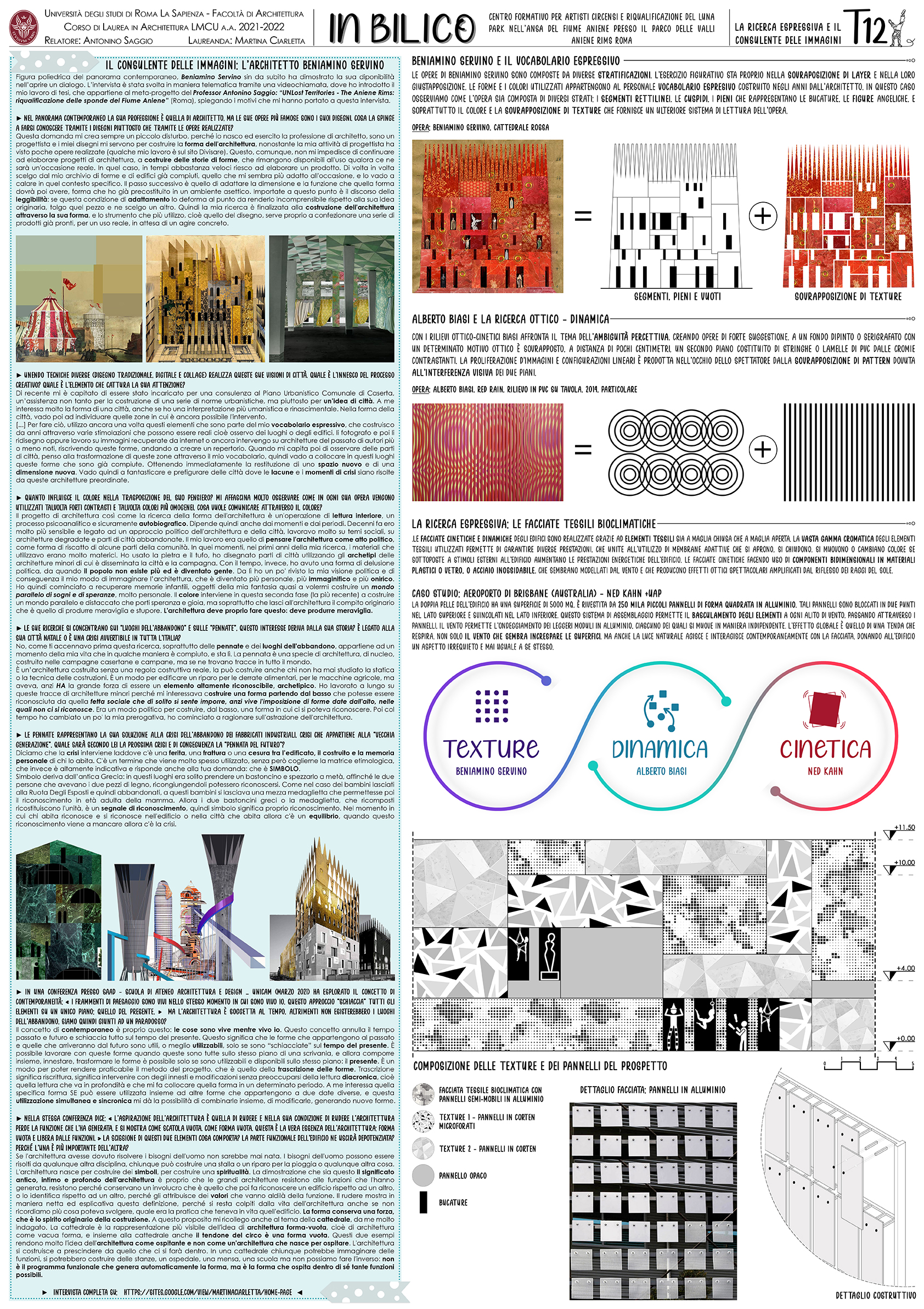 Infine il mondo dei lunghi prospetti dei sinuosi edifici su strada sono stati studiati attrarverso la ricerca compiuta dall'architetto Beniamino Servino. Servino ha spesso nei suoi splendidi disegni eaborato il mondo del circo, ma ha anche disegnato architetture stratificate, ricche di colori e vibrazioni. Dopo una lunga intervista all'architetto, solo in parte riportata nella tavola della tesi, alcune ipotesi sono state ideate per "In Bilico" attraverso una serie di temi ludici e dinamici che richiamano il mondo circense ma senza facili scorciatoie iconiche. Infine dato che i lunghi fronti del progetto lungo il viadotto saranno percepiti anche dall'automibile, si è ipotizzato di lavorare sulla scia dell'arte cinetica, cosi come sperimentata da Alberto Biasi. In questo caso è proprio il movimento del visitatore che fa mutare l'opera con una relazione tra architettura e arte che sembrava appropiata al programma e al luogo in cui sorge l'edificio.