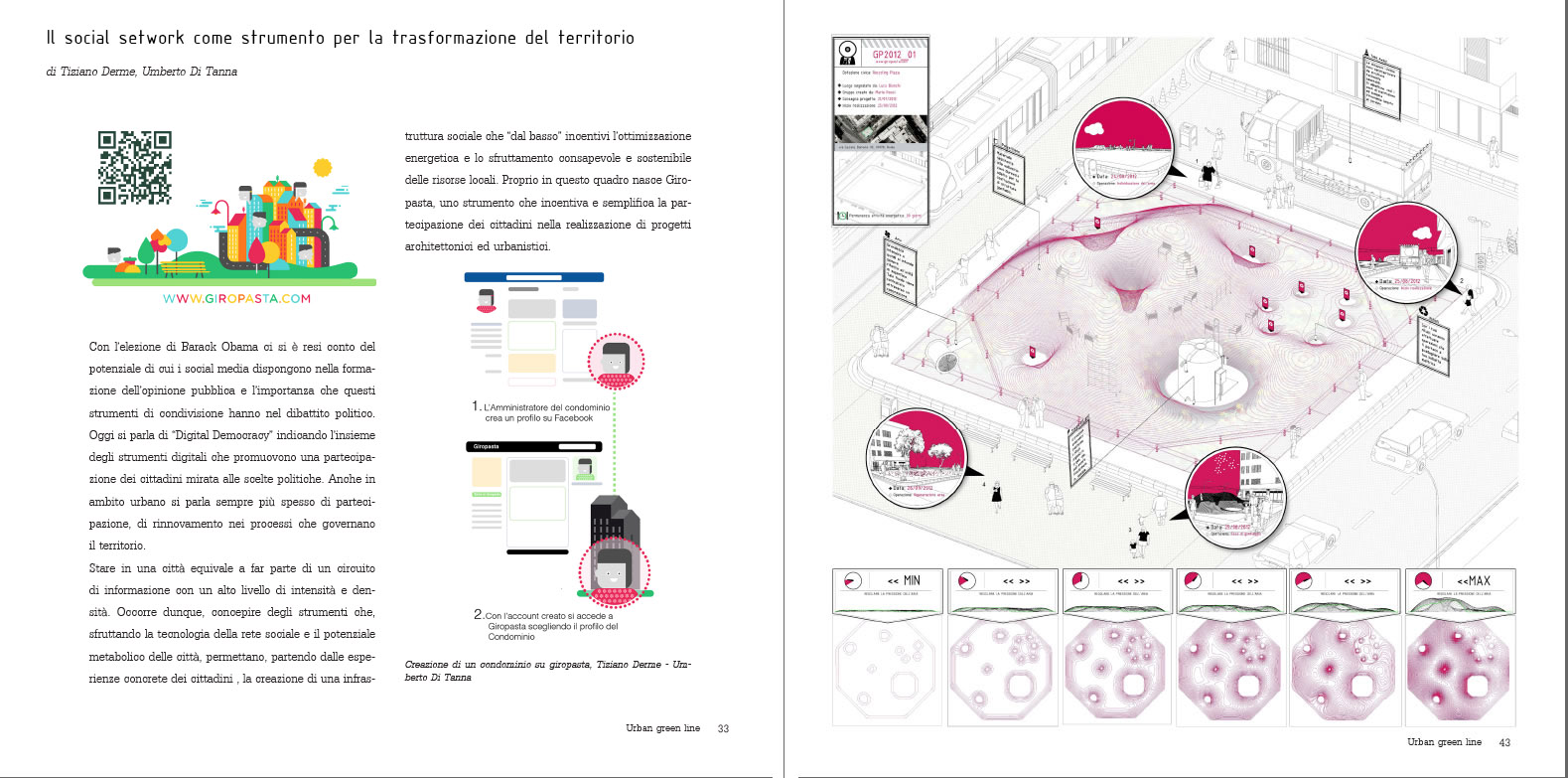 La diffusione delle reti d’informazione ha portato all’affermazione sempre più capillare di una varietà di attori, soprattutto giovani, che si confrontano con la tecnologia creando sia dei “luoghi” virtuali che fisici, luoghi che entrano in un circuito di reti globali. Giropasta è un’infrastruttura sociale che si affianca all’Ugl e che si costruisce secondo una logica bottom up. Scopo della struttura è attivare una serie di spazi disponibili nei pressi delle fermate della Ugl. Giropasta si compone sia di uno spazio virtuale, il portale, da cui gli utenti possono organizzare e promuovere eventi di vario tipo (sociali, musicali, politici, tempo libero, cultura...) sia di spazi fisici reali nelle aree più vicine alle fermate del tram in cui questi eventi si realizzano, spesso legati ad attività ludiche che, attraverso il sistema della rete e della riconoscibilità, tramite card elettroniche, consentono di creare energia e di risparmiare sul proprio conto energetico domestico.Il portale giropasta si affianca alla Ugl innescando processi economici e sociali che hanno dei punti di contatto con altri tre progetti analoghi, “urbanvoids.blogspot.com” in Italia, “www.casastristes.org” in Spagna e “www.spa-replace.com” in Olanda, dai quali emerge con chiarezza quella che è la vera “crisi” delle nostre città, i consumi incontrollati e spregiudicati di ogni forma di energia e di risorsa. La struttura di Giropasta si articola concretamente secondo un processo di discussing, conversing, voting, ed infine di design tool, dove l’interazione sociale e l’esperienza del tram accompagnano i protagonisti e ogni user può proporre eventi ed aree fino al “consumo” dell’evento stesso. Le strutture-design tool, costituite da elementi gonfiabili che spesso si associano agli eventi, rappresentano dei contenitori perfetti per queste interazioni temporanee, perché adattabili al numero di utenti, alla durata dell’evento ed al target di persone a cui sono destinate. L’attività dell’utente, solitamente ludica, rappresenta la forza che permette al sistema di funzionare.Il “Parlamento Gonfiabile”, che è una delle configurazioni possibili che vengono materializzate lungo il corso dell’Ugl, è la reificazione di un processo collettivo che è nato all’interno del social network di Giropasta, (www.giropasta.com), nel quale i cittadini stessi hanno segnalato un luogo, creato un gruppo di discussione sul progetto, organizzato eventi di progettazione partecipata ed interrogato esperti. Il processo on line è finalizzato dunque alla redazione di un documento di progetto che, definito in tutti i suoi dettagli e nelle sue potenzialità energetiche, verrà consegnato all’amministrazione competente.
