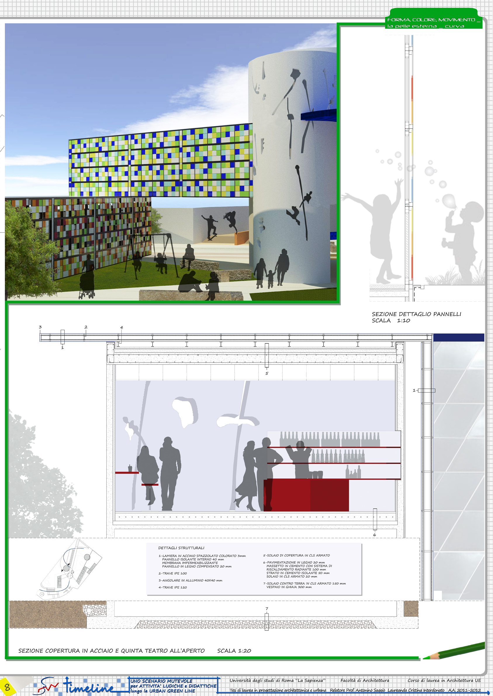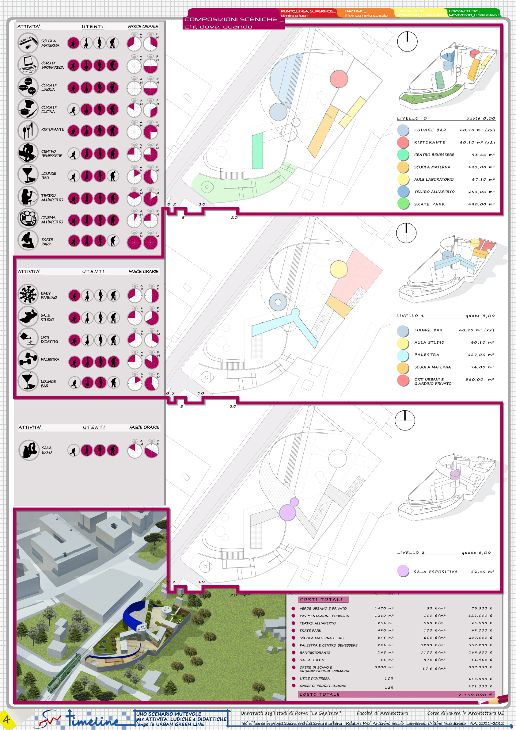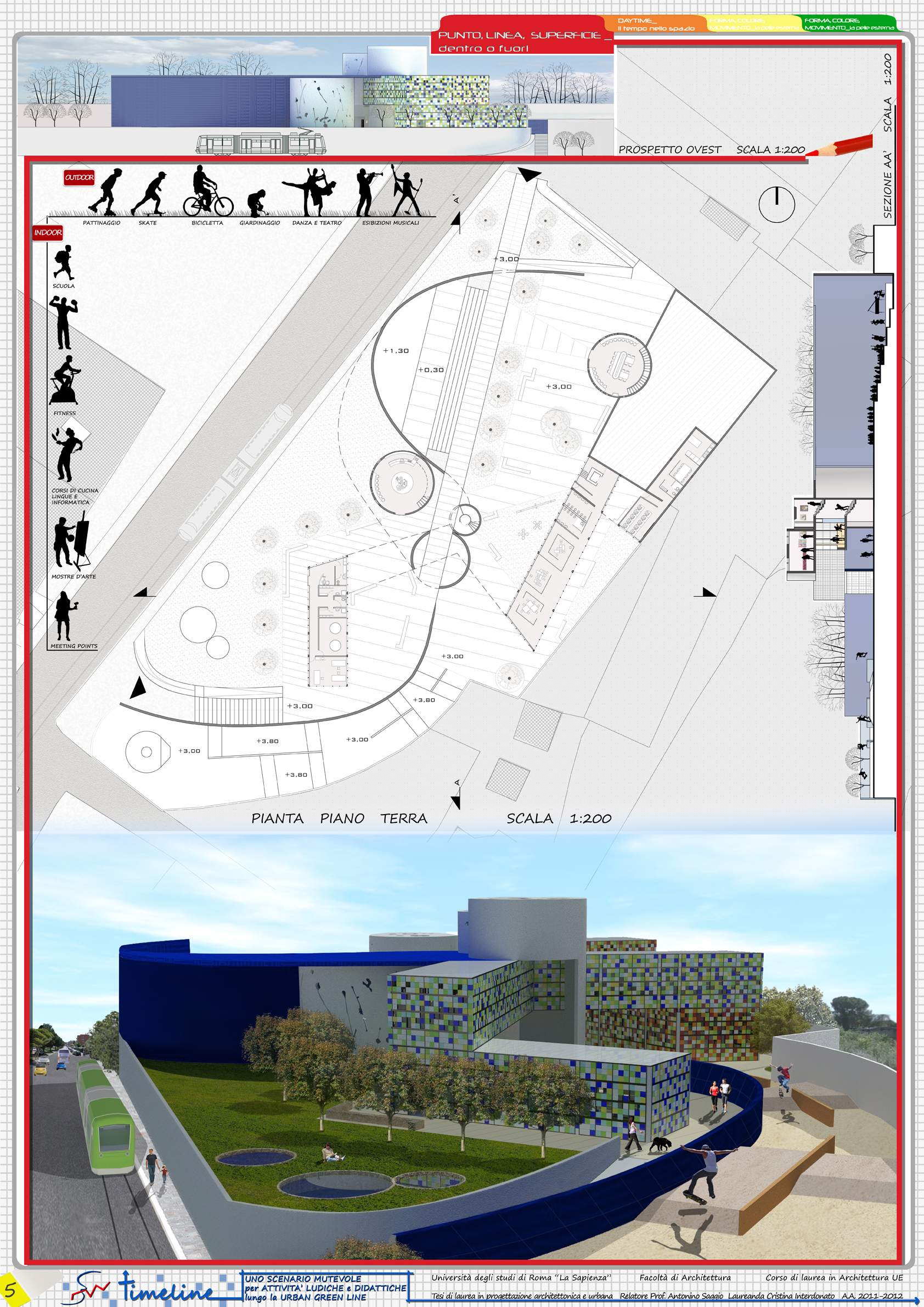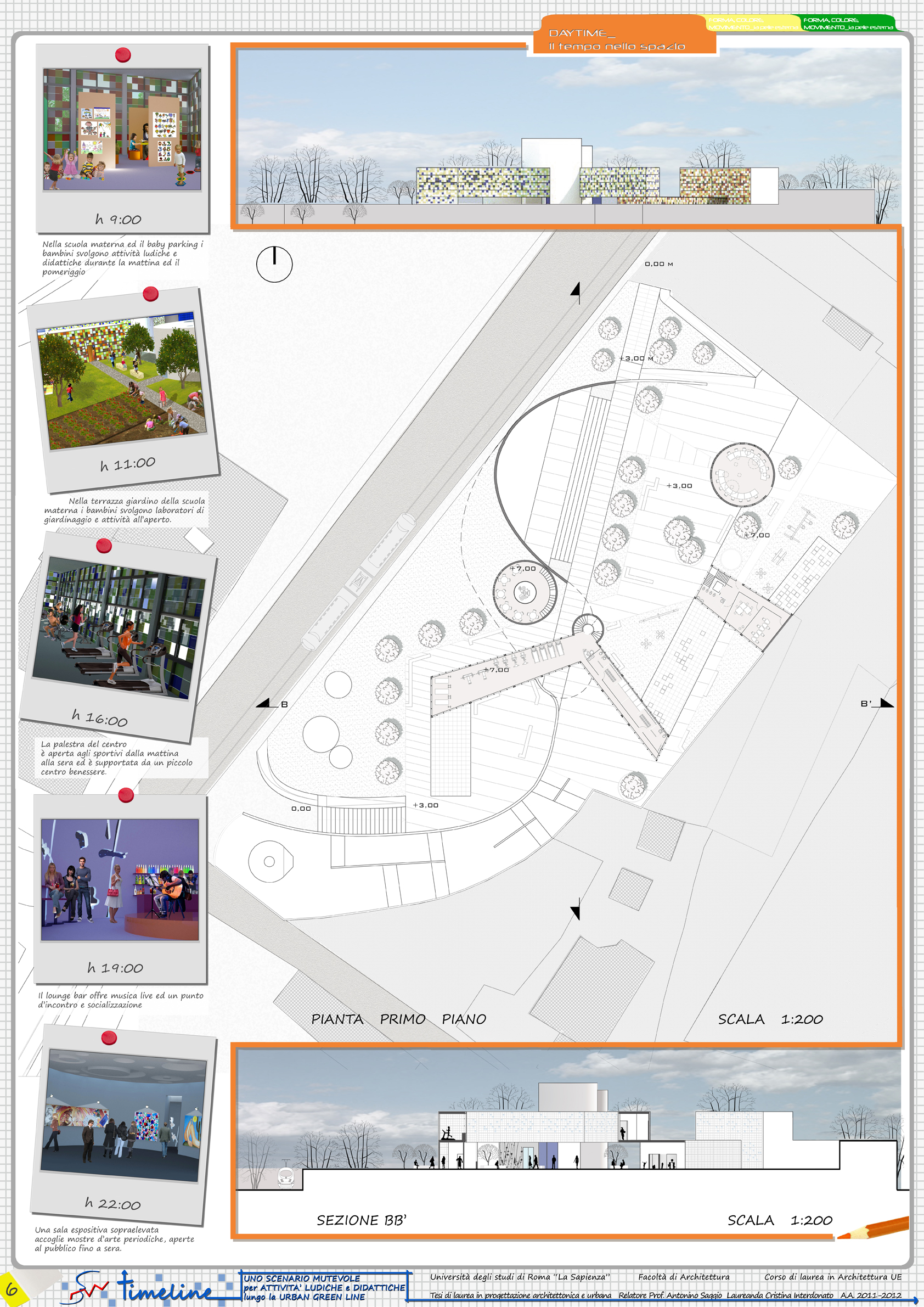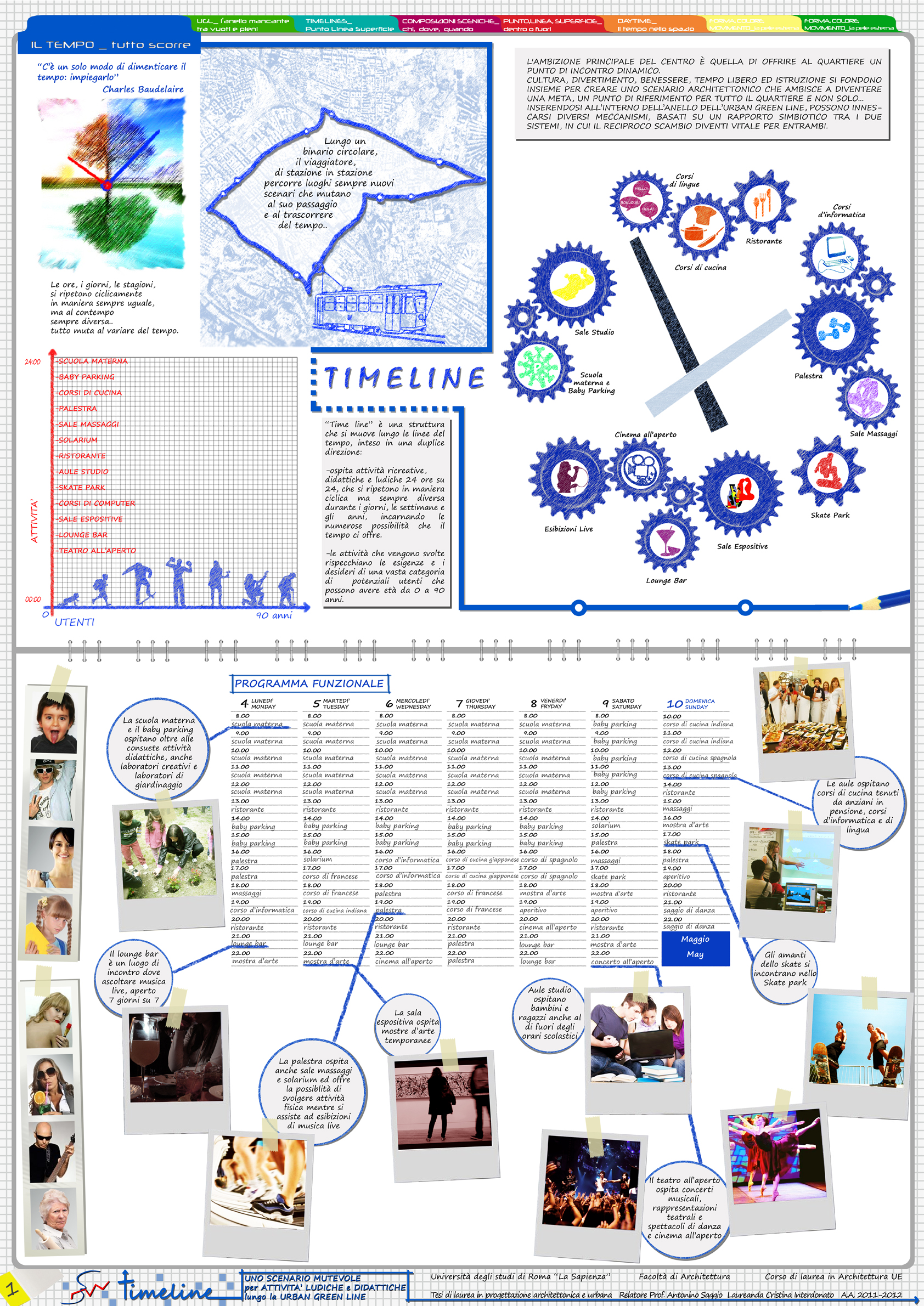 “Timelines” è un progetto che si muove lungo le linee del tempo in una duplice direzione: quella della continuità dell'uso (il centro ospita attività diverse 24 h su 24 h) e quella della continuità delle fasce di età degli utilizzatori (un bacino di utenti che va da 0 a 90 anni). Il tempo è il motore di tutto ciò che avviene nel progetto perchè le sovrapposizioni, gli intrecci, la presenza delle diverse attività sono studiate sia nella loro ripetizione ciclica sia nelle differenze determinate dalle ore, le settimane, le stagioni. Due sono le funzioni principali: una scuola materna con baby parking ed una palestra. Una serie di attività correlate alle principali sono anche presenti: con ambienti che ospitano corsi di cucina, di informatica, di lingue, una sala studio, un piccolo centro benessere, un lounge bar ed un ristorante, una sala espositiva. Uno skate park ed un teatro caratterizzano gli spazi all’aperto.