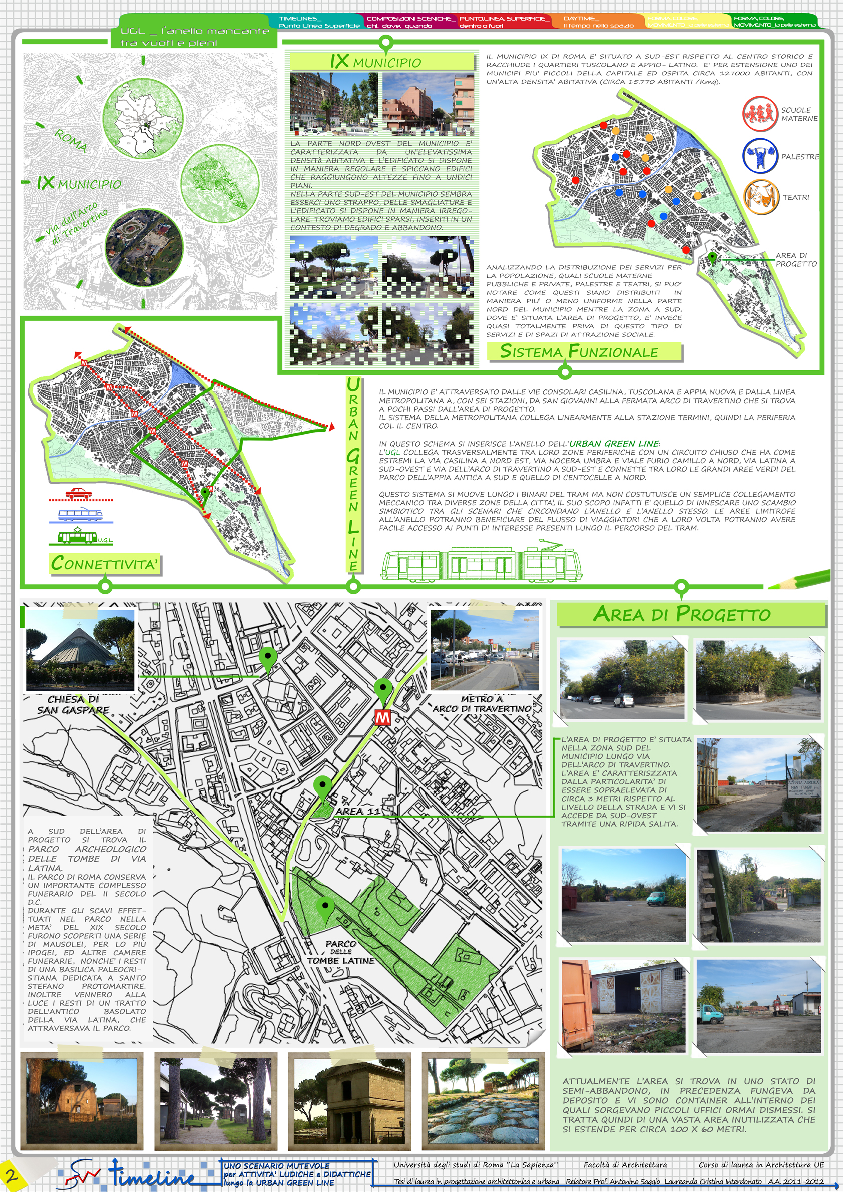 Questo programma funzionale nasce anche per colmare alcune carenze della zona sud del IX municipio di Roma che ha una scarsa presenza di servizi tra quelli indicati (in particolare scuole materne, palestre e teatri). Inoltre il progetto è ubicato lungo il tratto A20 dell’UGL lungo la via Arco di Travertino einstaura con la Urban green line un rapporto simbiotico: l’anello tranviario funge infatti da collegamento e trasporto per i fruitori dell’area dall'intero settore urbano e ne costituisce uno dei poli di riqualificazione urbana e di aumento di valore per i nuovi interventi previsti.