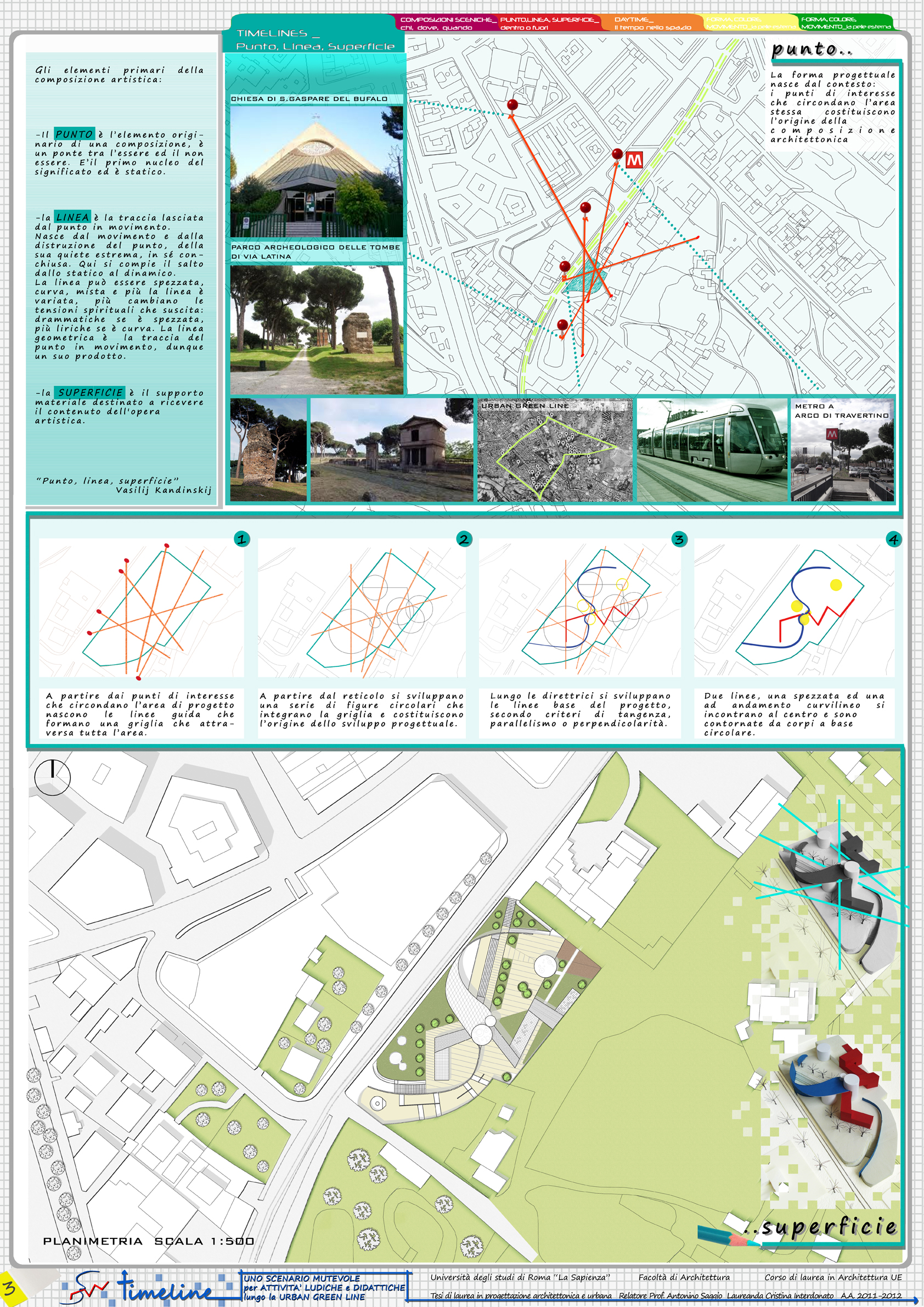 Oltre alle funzioni, anche la forma progettuale nasce dal contesto circostante perchè i “punti” all’origine della composizione sono costituiti dai luoghi di interesse che circondano l’area. In particolare la posizione della metro A ad e della fermata dell’Ugl sono strettamente connessi con i due accessi principali al progetto, uno a nord ed uno a sud-ovest. A partire da questi punti hanno origine delle direttrici che vanno a formare una griglia di linee rette e forme circolari, tra cui emergono, secondo criteri di tangenza, perpendicolarità ed intersezione, le linee guida del progetto. Si tratta di una spezzata ed una linea andamento curvilineo che si incontrano al centro dell'area. La prima linea va a formare gran parte dell’edificato mentre la seconda determina una quinta che delimita gli spazi aperti e crea la quinta di un teatro. All'interno di questo campo di forze che organizzano il progetto, si inseriscono dei corpi a base circolare che dialogano con le altri parti dell'edificato e degli sapazi all'aperto e svolgono il ruolo di cerniere plastiche e distributive dell'intero progetto.