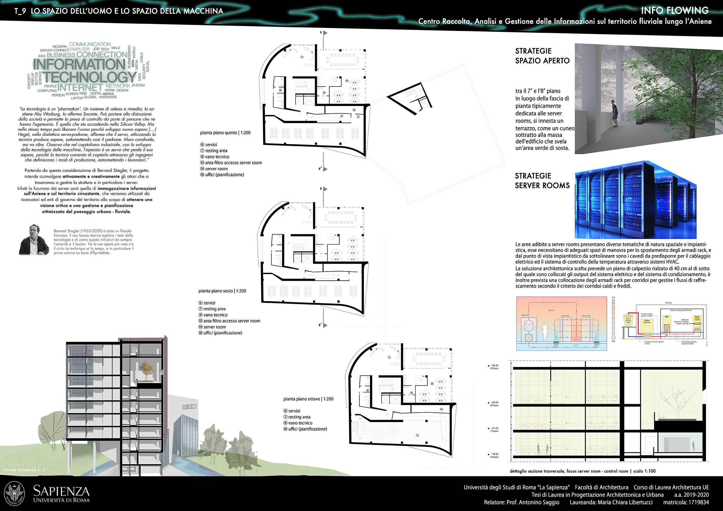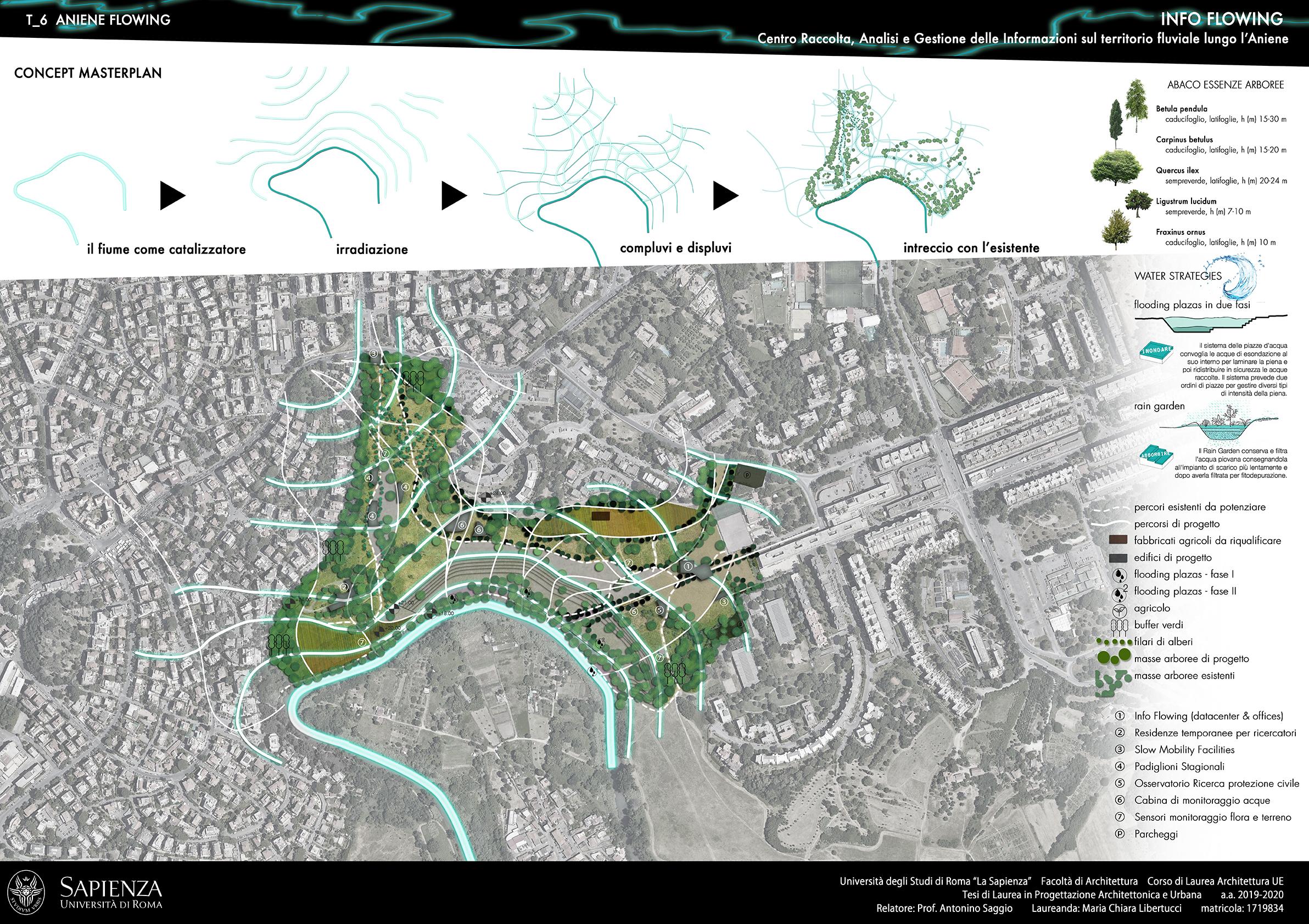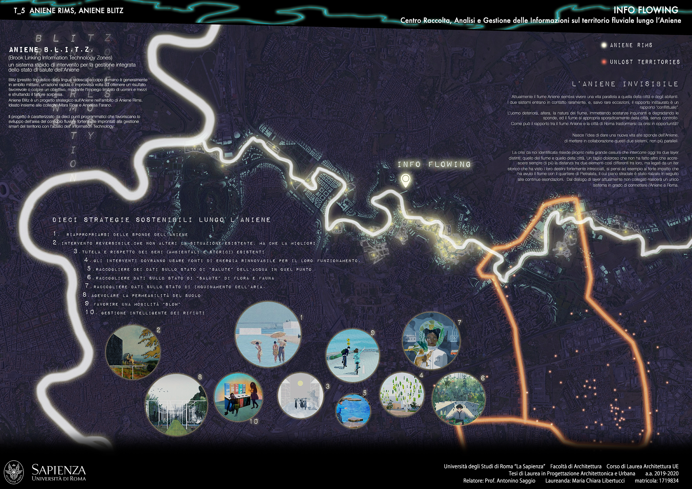 Proprio a partire da questo elemento nasce l'idea fondamentale del progetto che si muove proprio sulla funzione principale del controllo e monitoraggio dell'Aniene con tecnologie contemporanee. Nasce così Info Flowing che è̀ un edificio lungo le sponde del fiume che raccoglie informazioni dal territori circostante attraverso dei sensori, li accumula all’interno delle server room e li analizza e modella al suo interno come una control room per gestire e pianificare al meglio l’intorno e le condizioni del fiume; un costante monitoraggio del territorio circostante infatti attraverso l’installazione di sensori nel circondario, che gestisca da vicino l’ambito di fiume su cui influisce, ne studi dati e approcci sistemici per gestirla al meglio, oltre a condividerli con la popolazione per un continuo feedback reciproco nello spirito dell’open source, e al contempo dotato di strutture pronte ad intervenire nelle crisi.