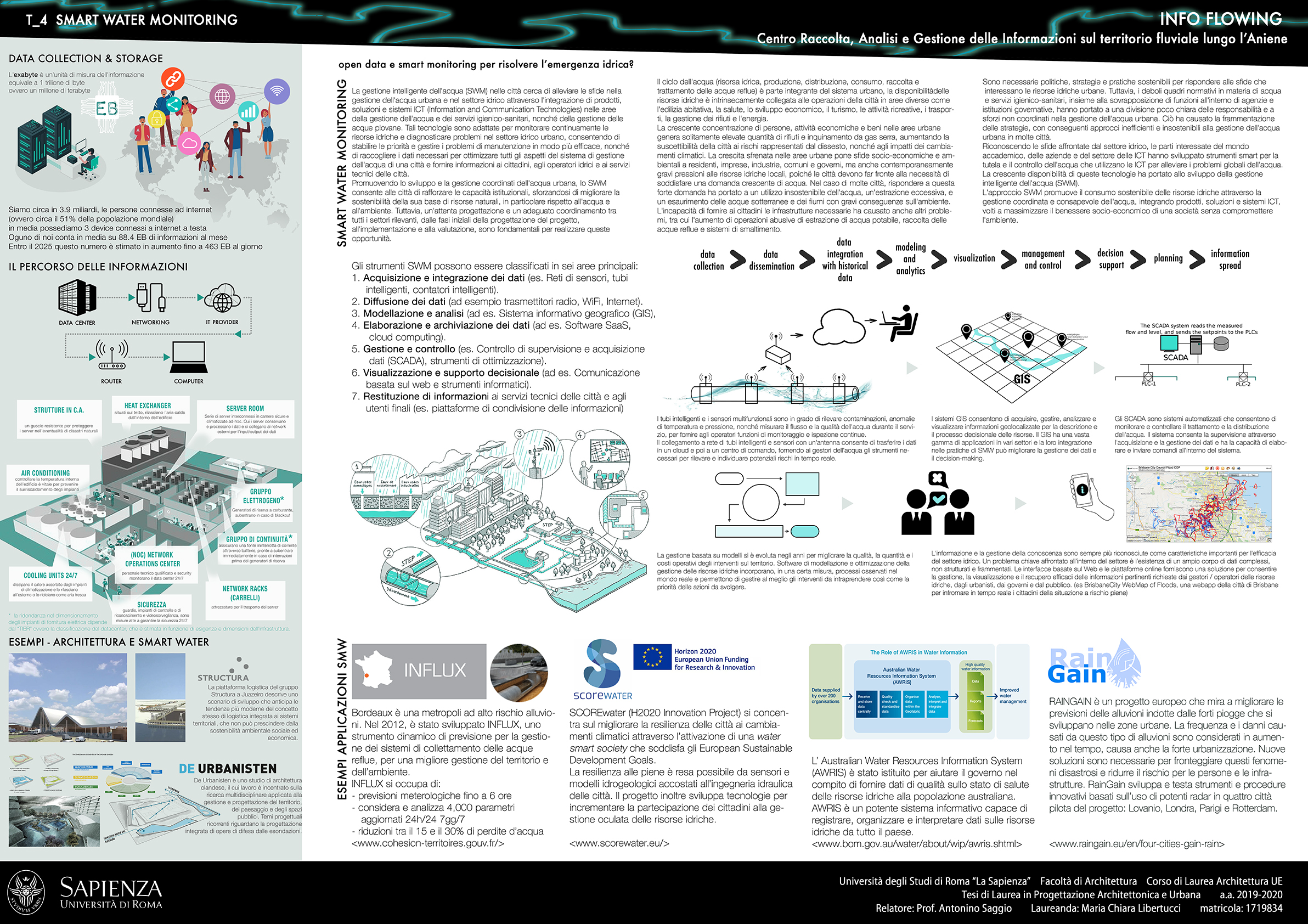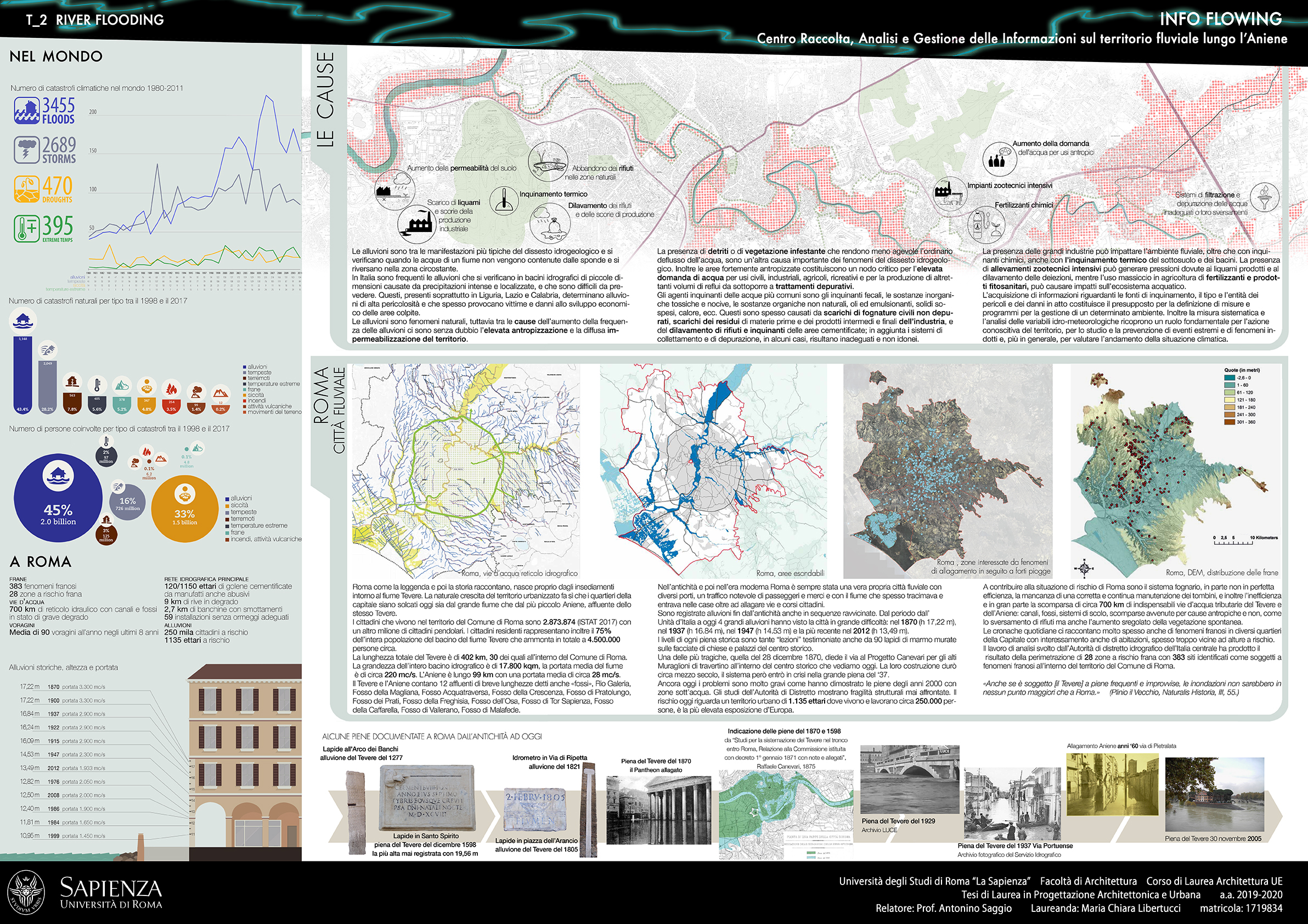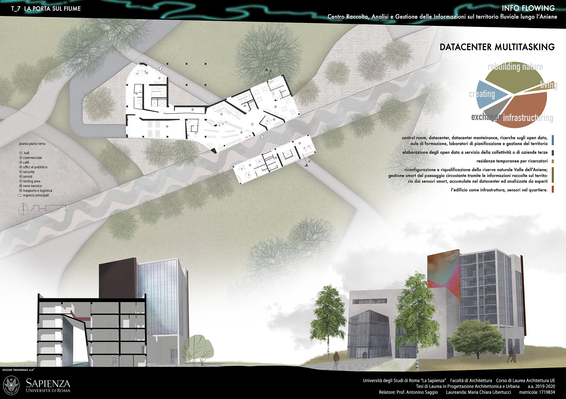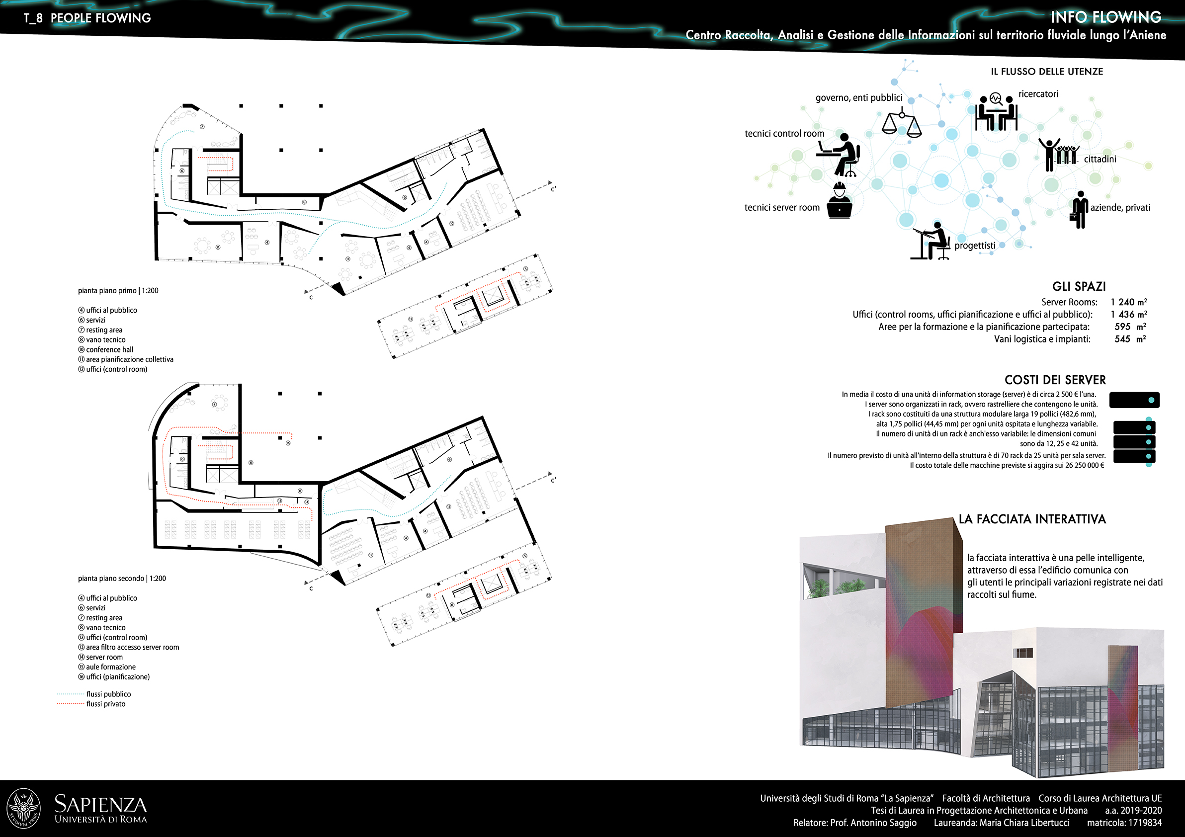 Proprio a partire da questo elemento nasce l'idea fondamentale del progetto che si muove proprio sulla funzione principale del controllo e monitoraggio dell'Aniene con tecnologie contemporanee. Nasce così Info Flowing che è̀ un edificio lungo le sponde del fiume che raccoglie informazioni dal territori circostante attraverso dei sensori, li accumula all’interno delle server room e li analizza e modella al suo interno come una control room per gestire e pianificare al meglio l’intorno e le condizioni del fiume; un costante monitoraggio del territorio circostante infatti attraverso l’installazione di sensori nel circondario, che gestisca da vicino l’ambito di fiume su cui influisce, ne studi dati e approcci sistemici per gestirla al meglio, oltre a condividerli con la popolazione per un continuo feedback reciproco nello spirito dell’open source, e al contempo dotato di strutture pronte ad intervenire nelle crisi.